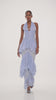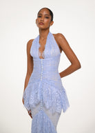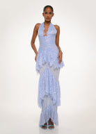 A soft powder blue lace gown with tiered ruffles and button-down detailing — airy, elegant, and effortlessly feminine.