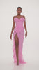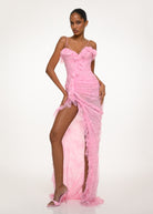 A pink lace gown featuring structured corsetry, delicate straps, and a daring slit — soft romance meets bold energy.
