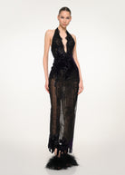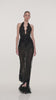 A sheer black halter dress detailed with lace and sequins, an elegant interplay of transparency and texture, sophistication and timeless allure.
