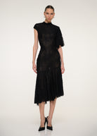 A black sheer midi dress with lace accents and a soft ruffled hem - delicate details for modern sensuality.