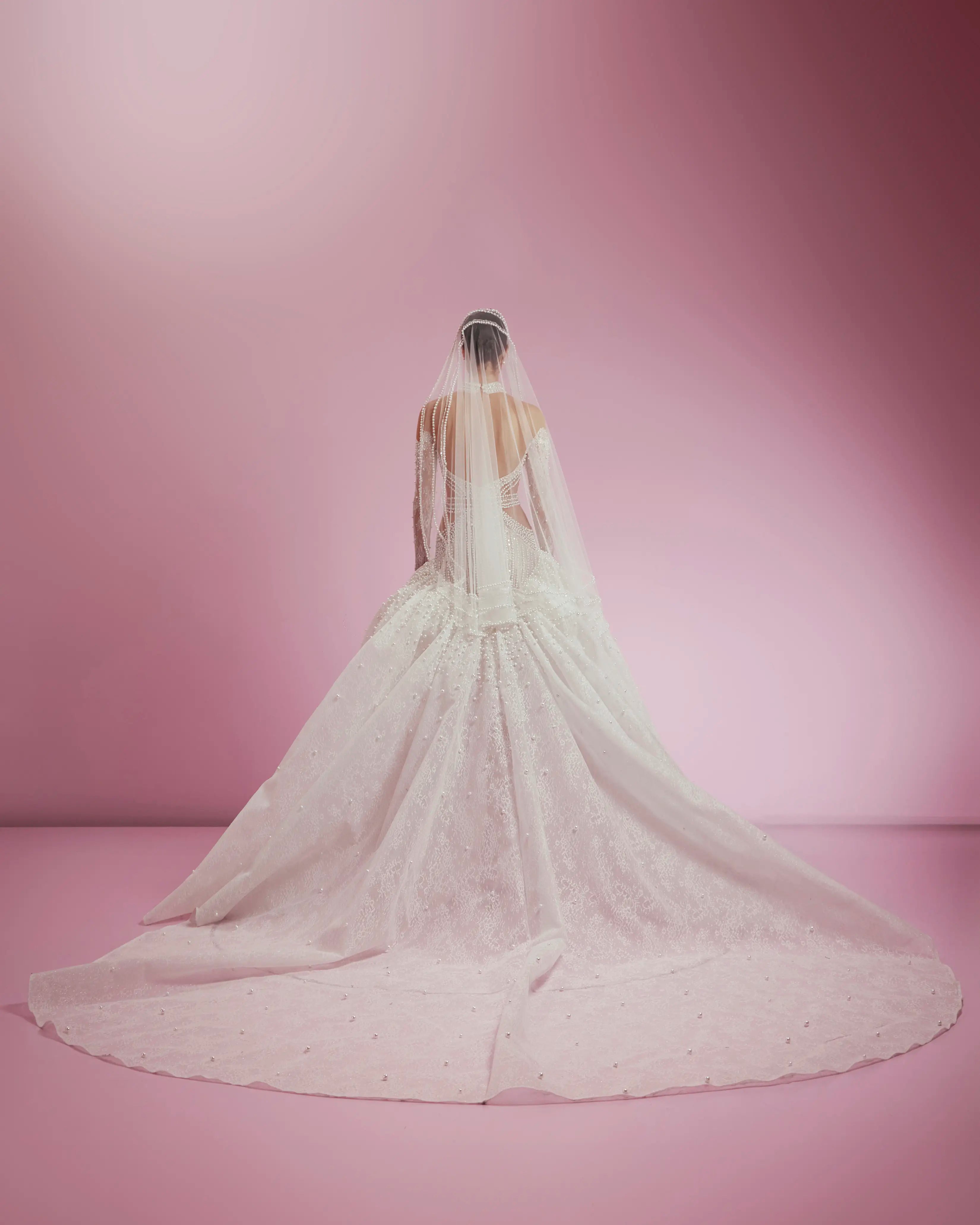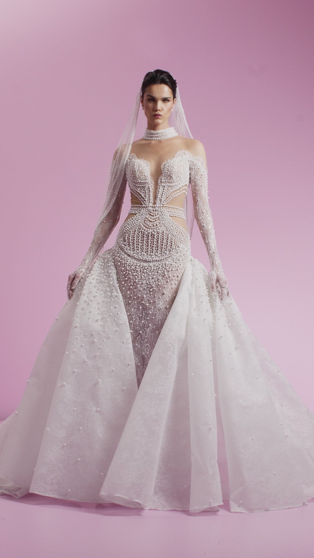 White Tulle Fabric Dress with Mock-Neck, Long Sleeves, Pearl Embellishments and Voluminous Skirt