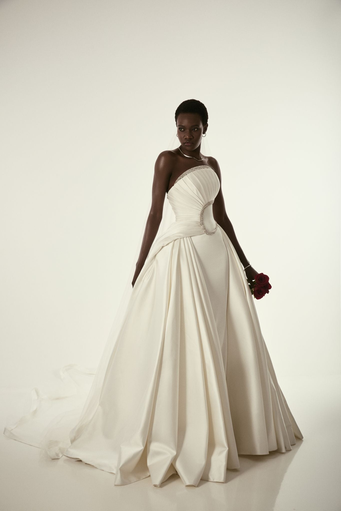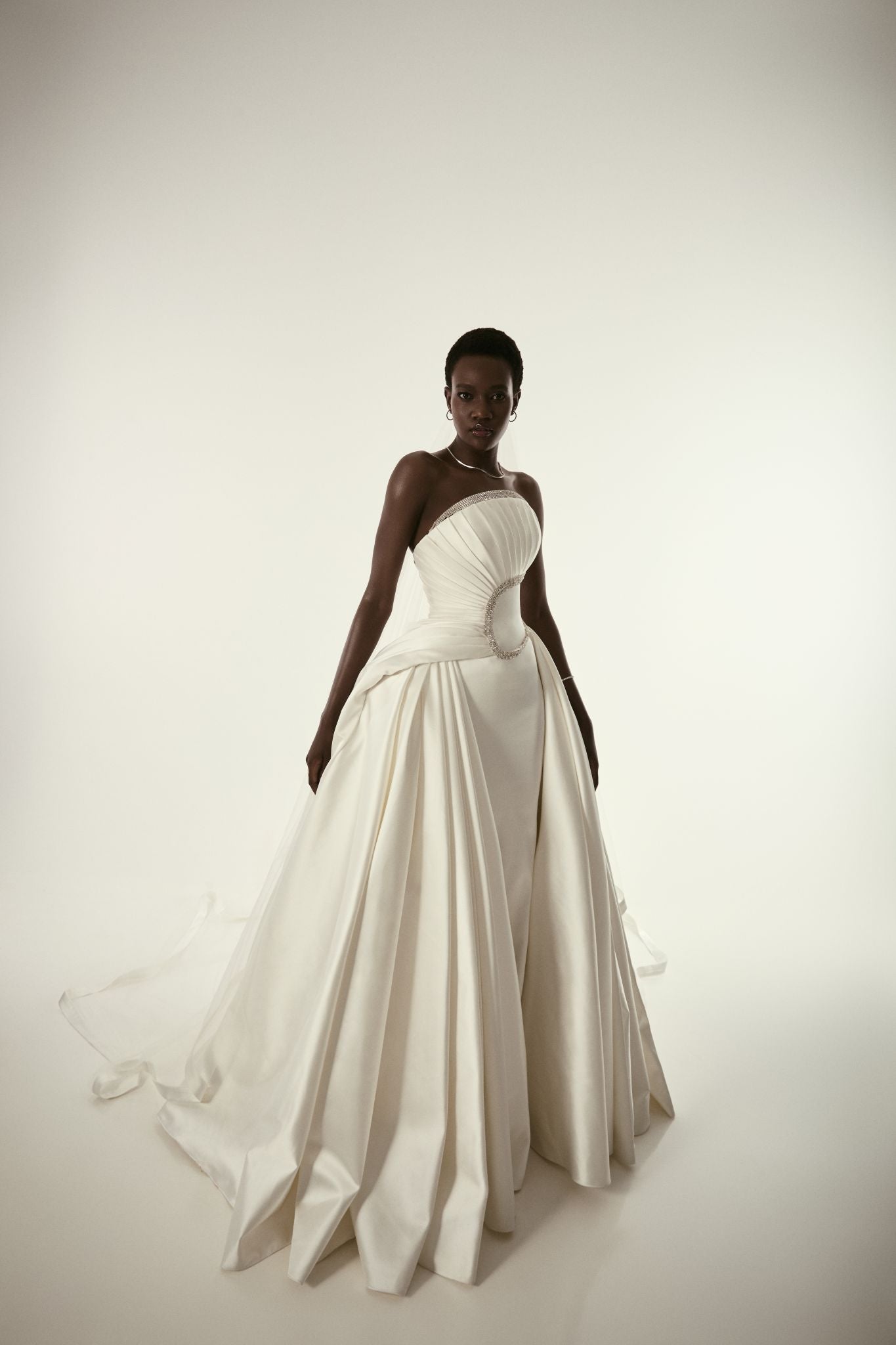 Strapless wedding gown with sculpted pleating, a fitted waist, and a full flowing skirt. Clean lines and subtle detailing create a refined, modern silhouette.
