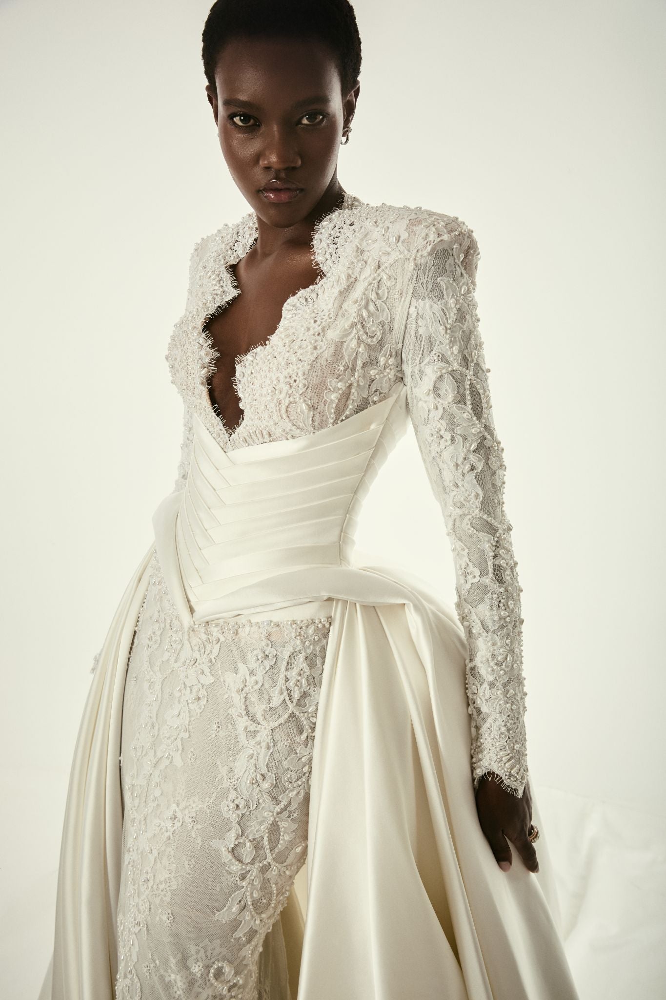Long-sleeve lace wedding gown with a deep V neckline, structured corset waist, and dramatic overskirt. A striking blend of romance and modern elegance.