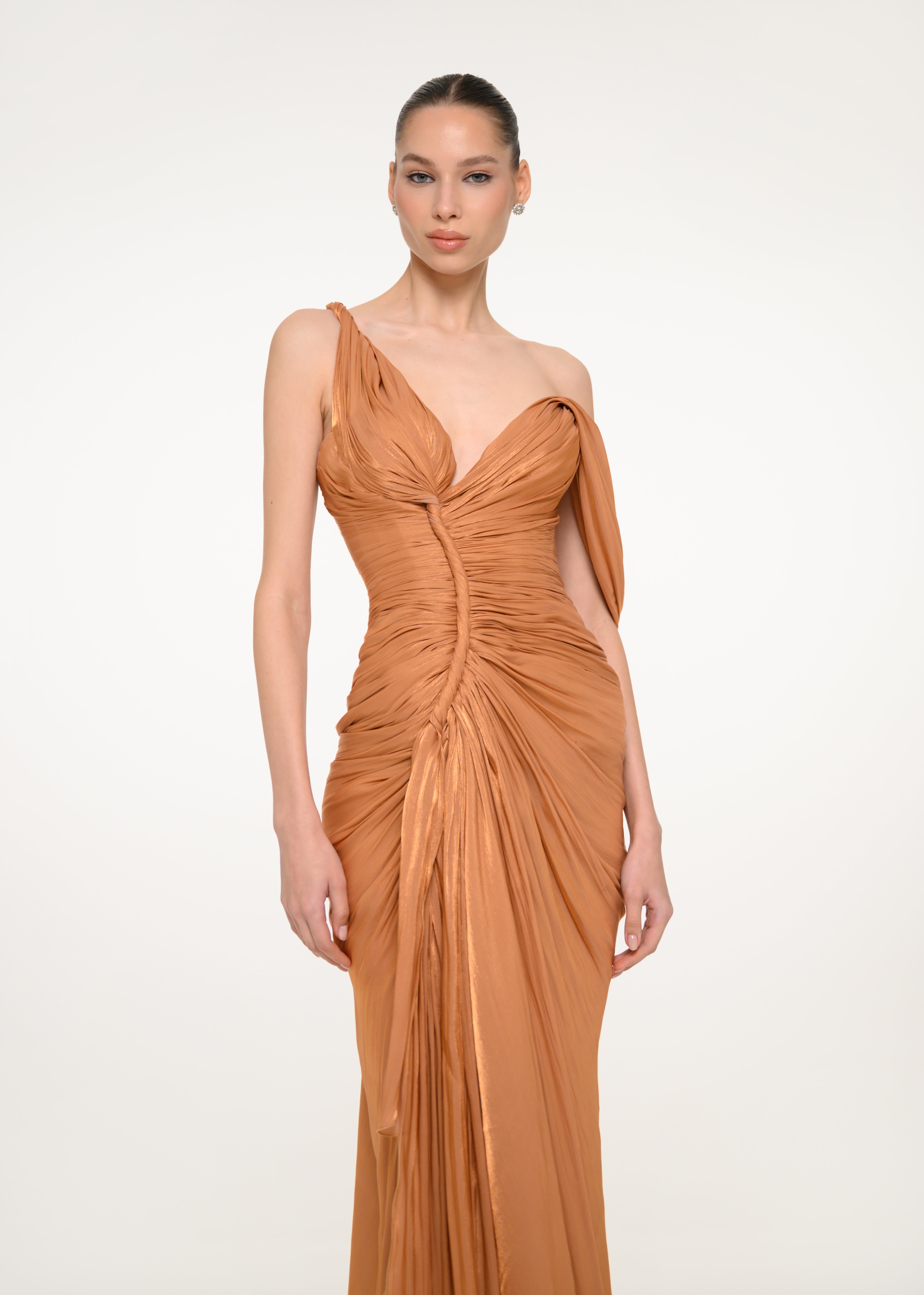 A bronze satin dress featuring a sculpted one-shoulder neckline and cascading drapes, merging structure, movement, and timeless sophistication.
