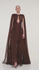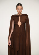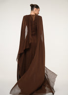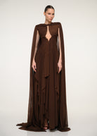 A chocolate-brown gown with a flowing cape and soft pleats - power and elegance.