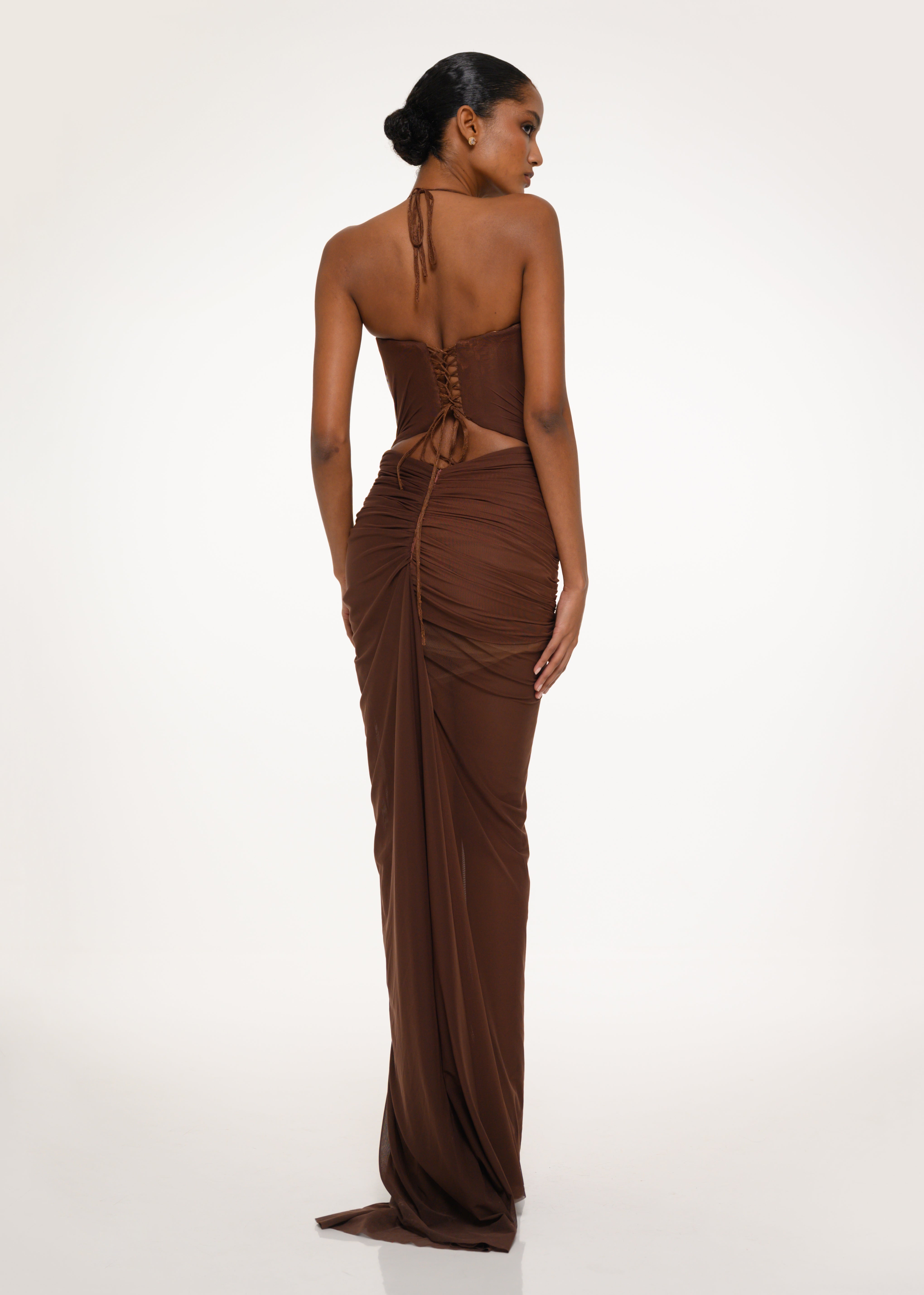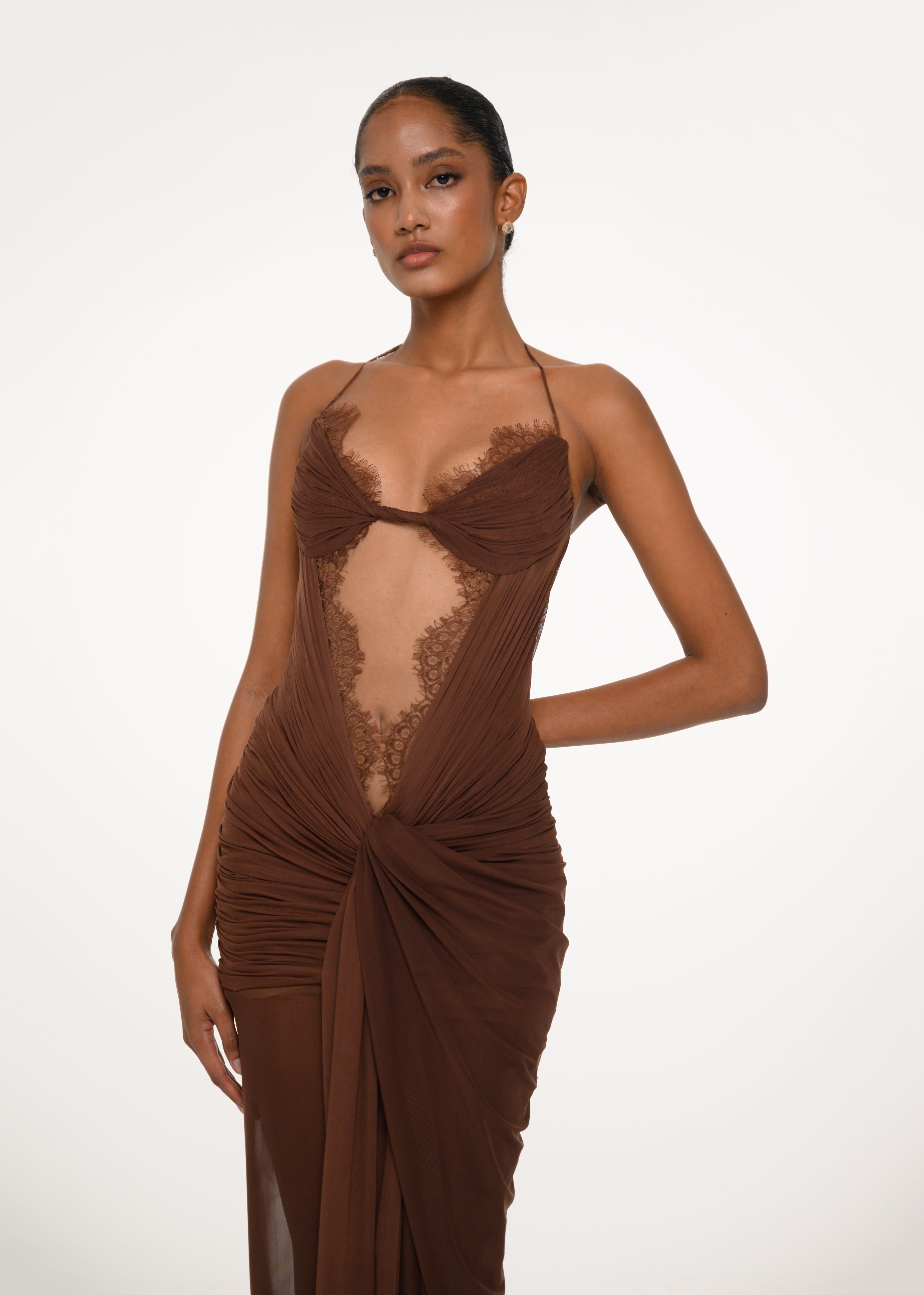 A chocolate-toned gown featuring lace detailing, sheer panels, and soft draping — an elegant play between structure and skin.
