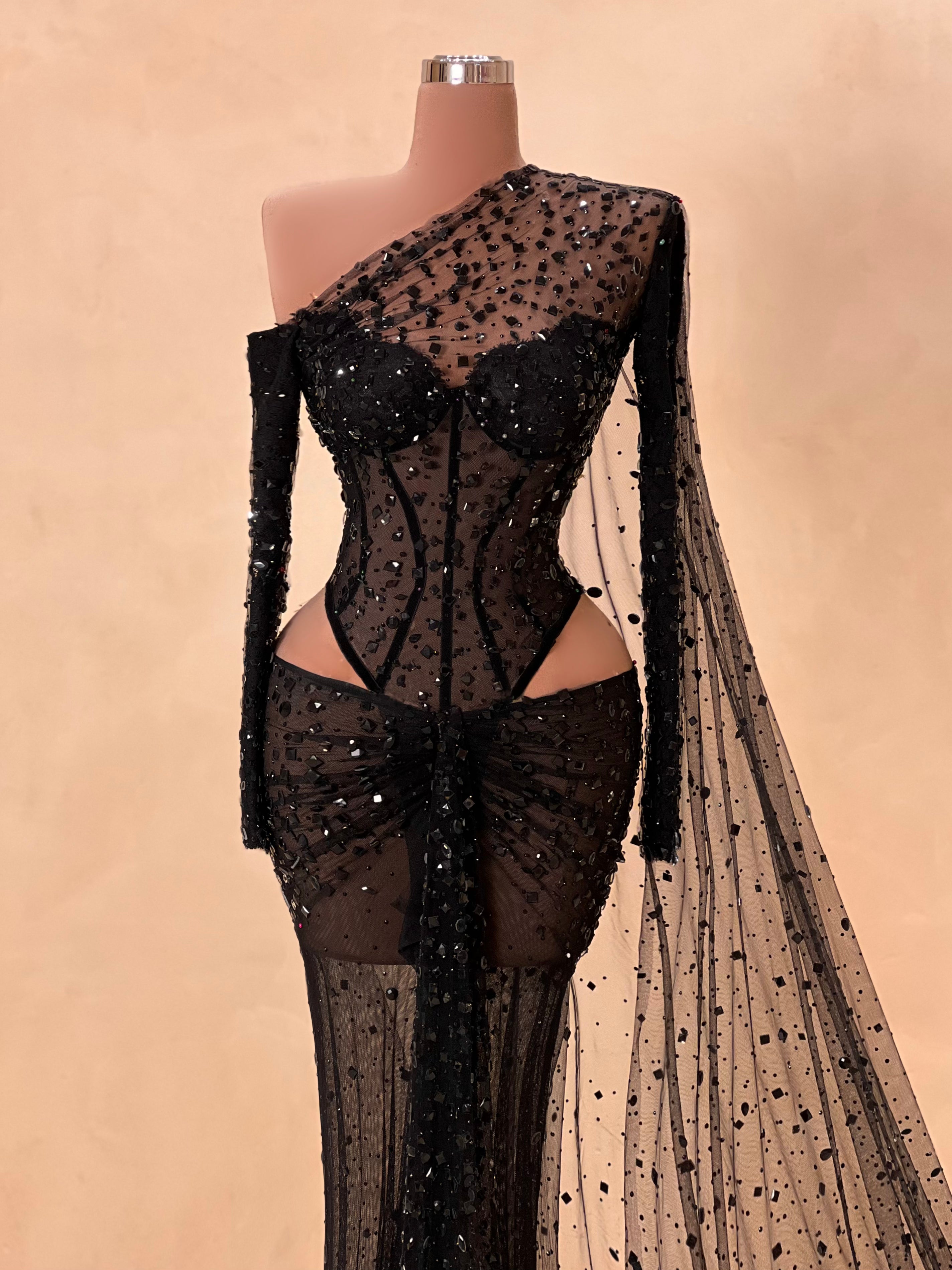 This black lace couture dress combines sensuality and edge. Featuring a plunging neckline, long sleeves, and structured lace paneling, it's made for commanding attention.