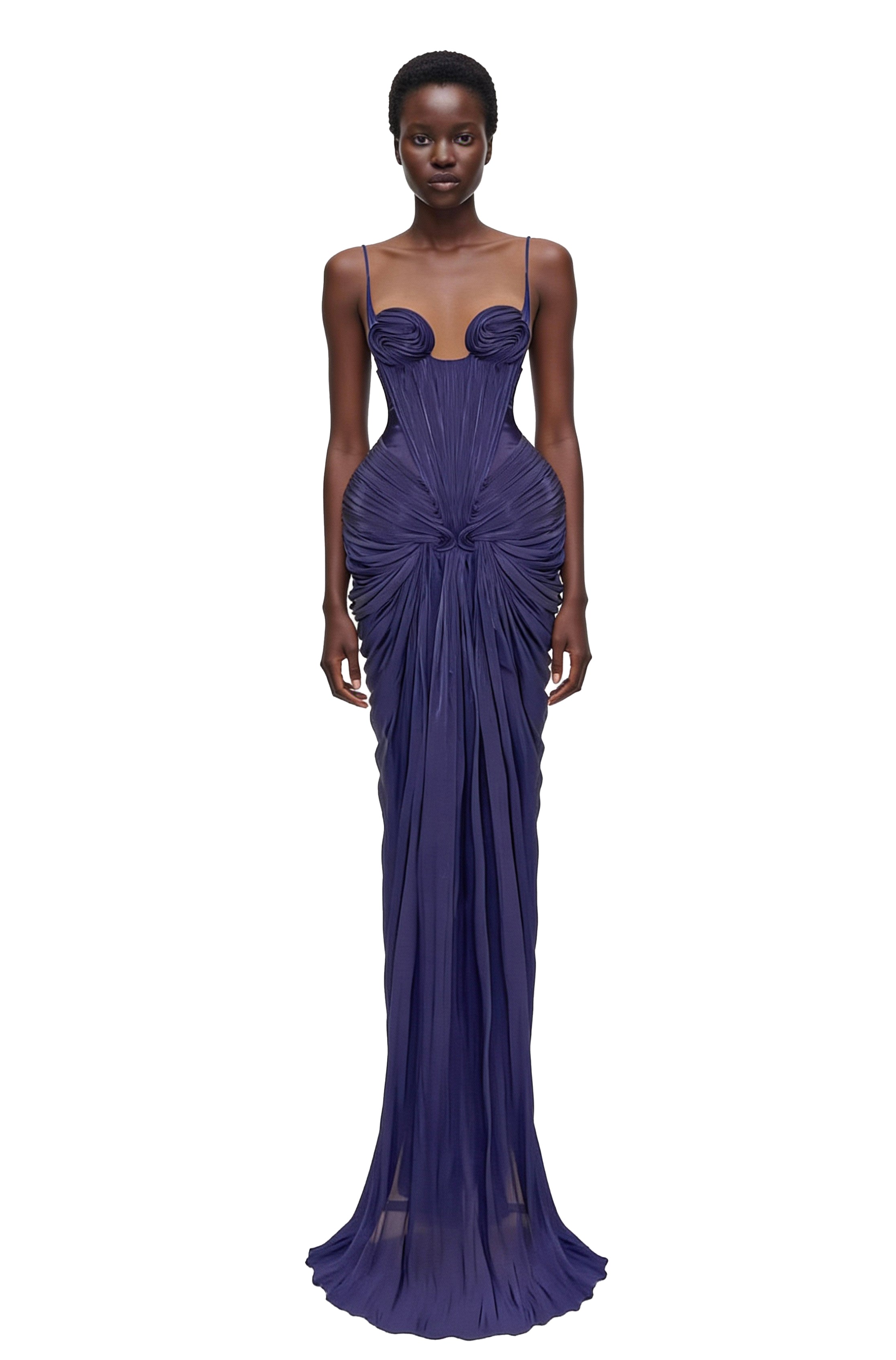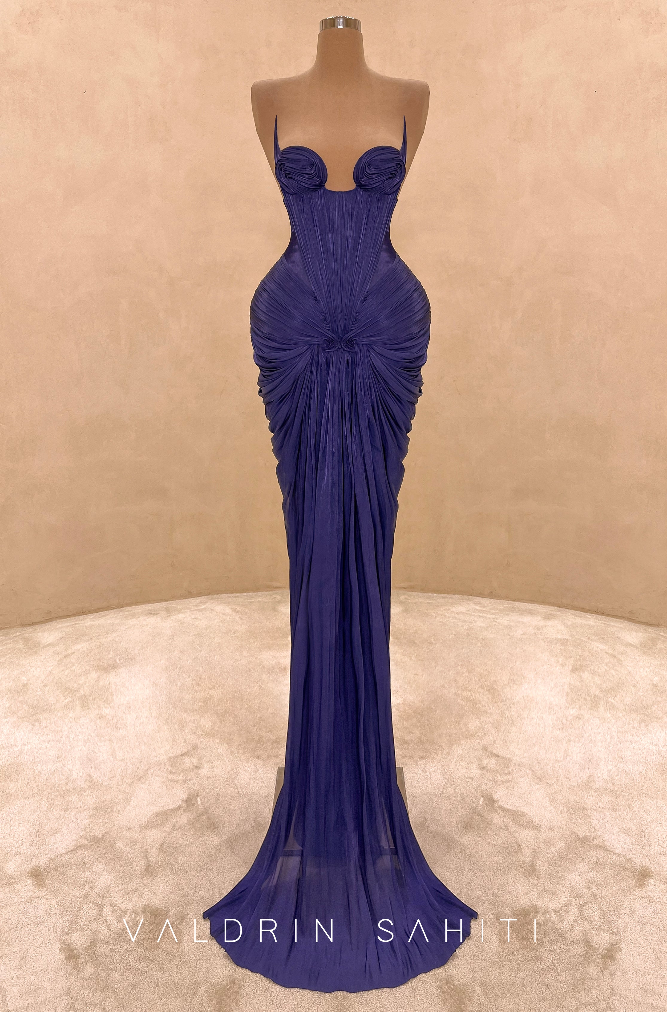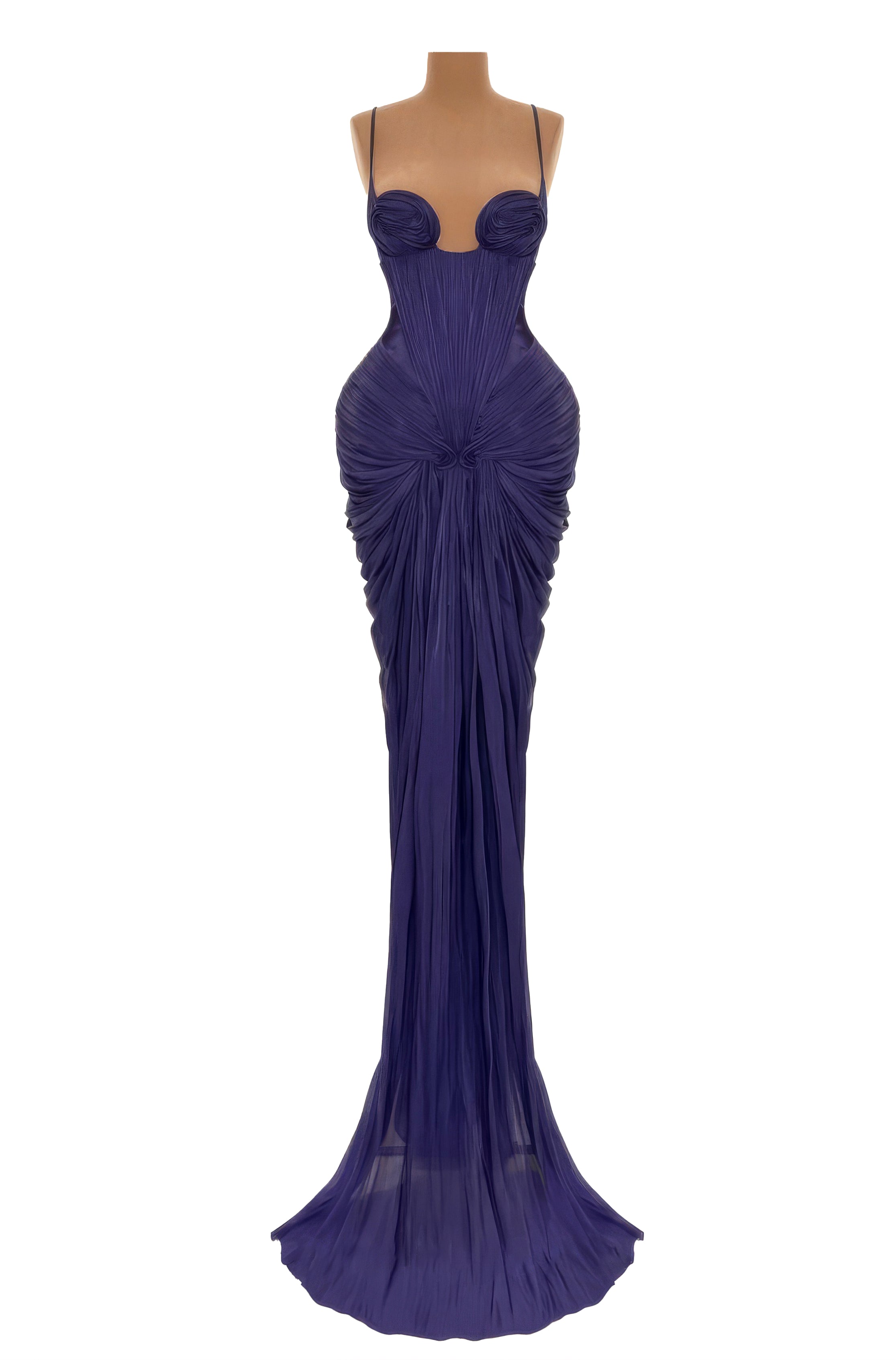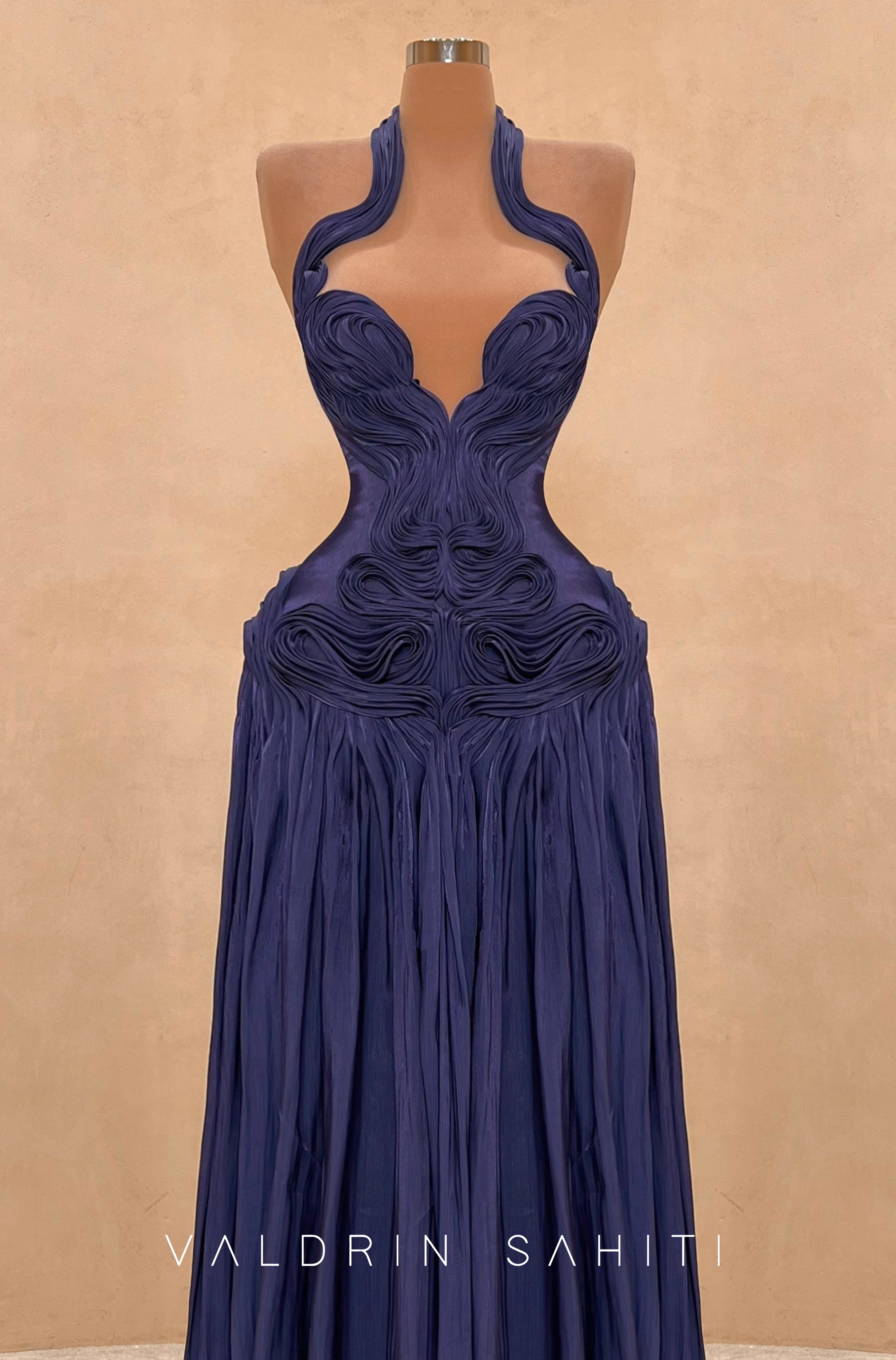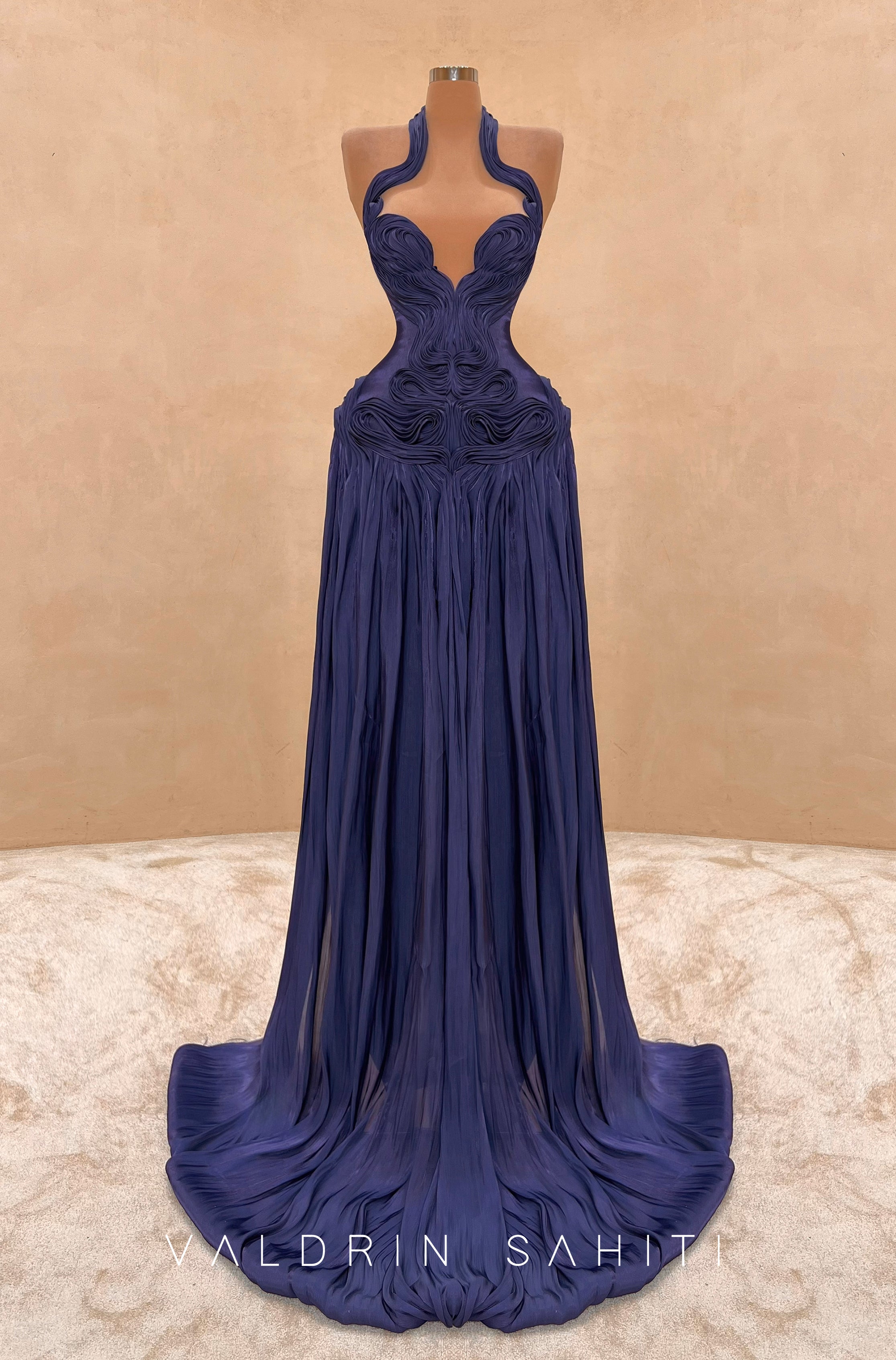 The gown features an intricately hand-draped bodice characterized by architectural "swirl" textures that create a dramatic, reinforced hourglass silhouette. The avant-garde halter neckline is accented by a bold plunging keyhole cutout, adding a modern edge to the classic mermaid style. Below the sculpted waist, the fabric flows into a voluminous, pleated maxi skirt that terminates in a sweeping, graceful train