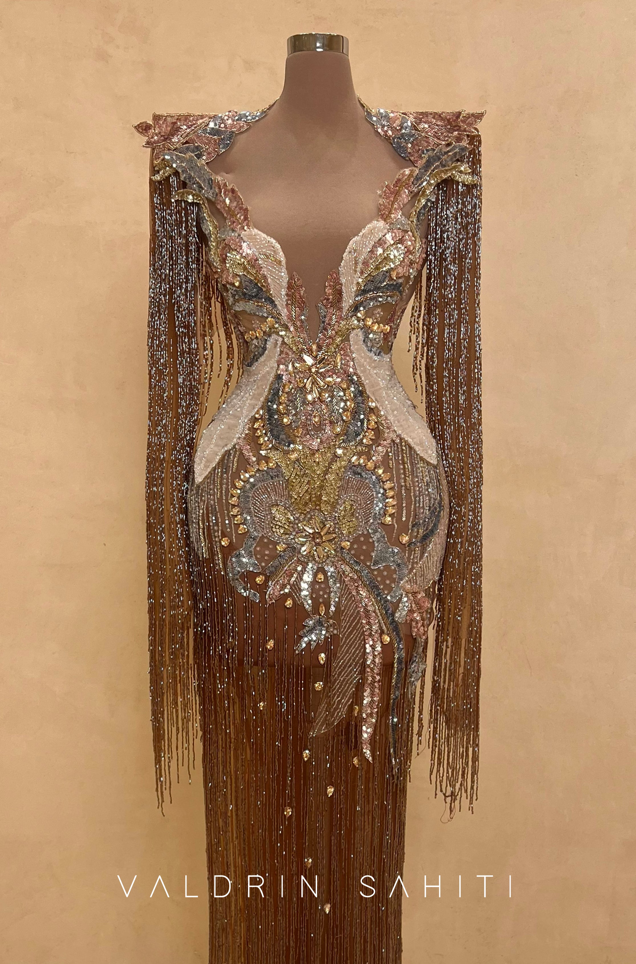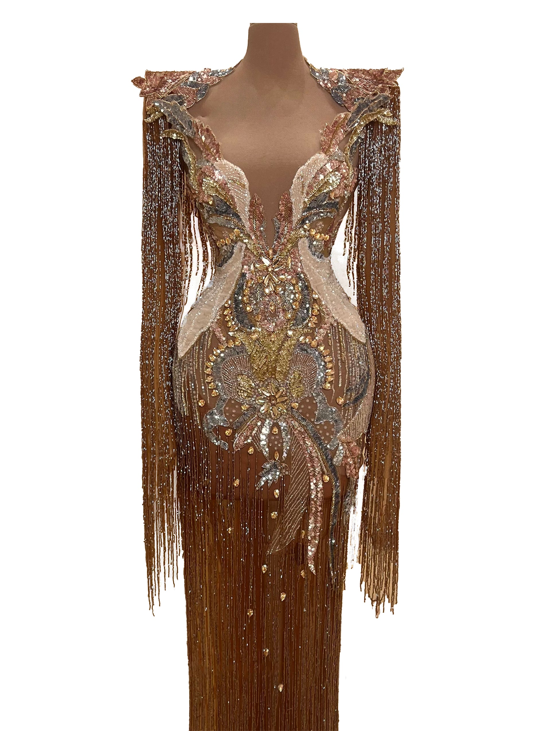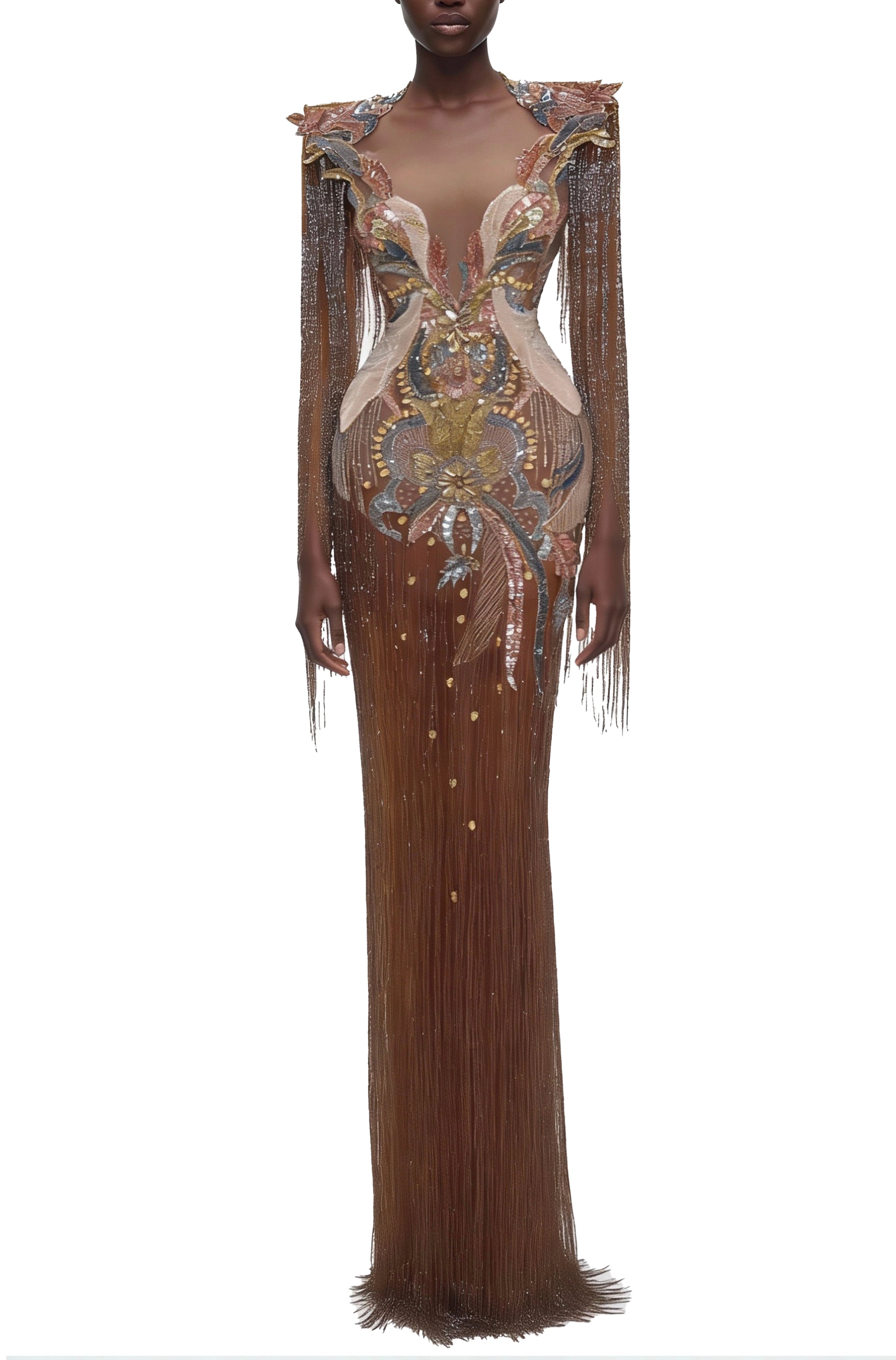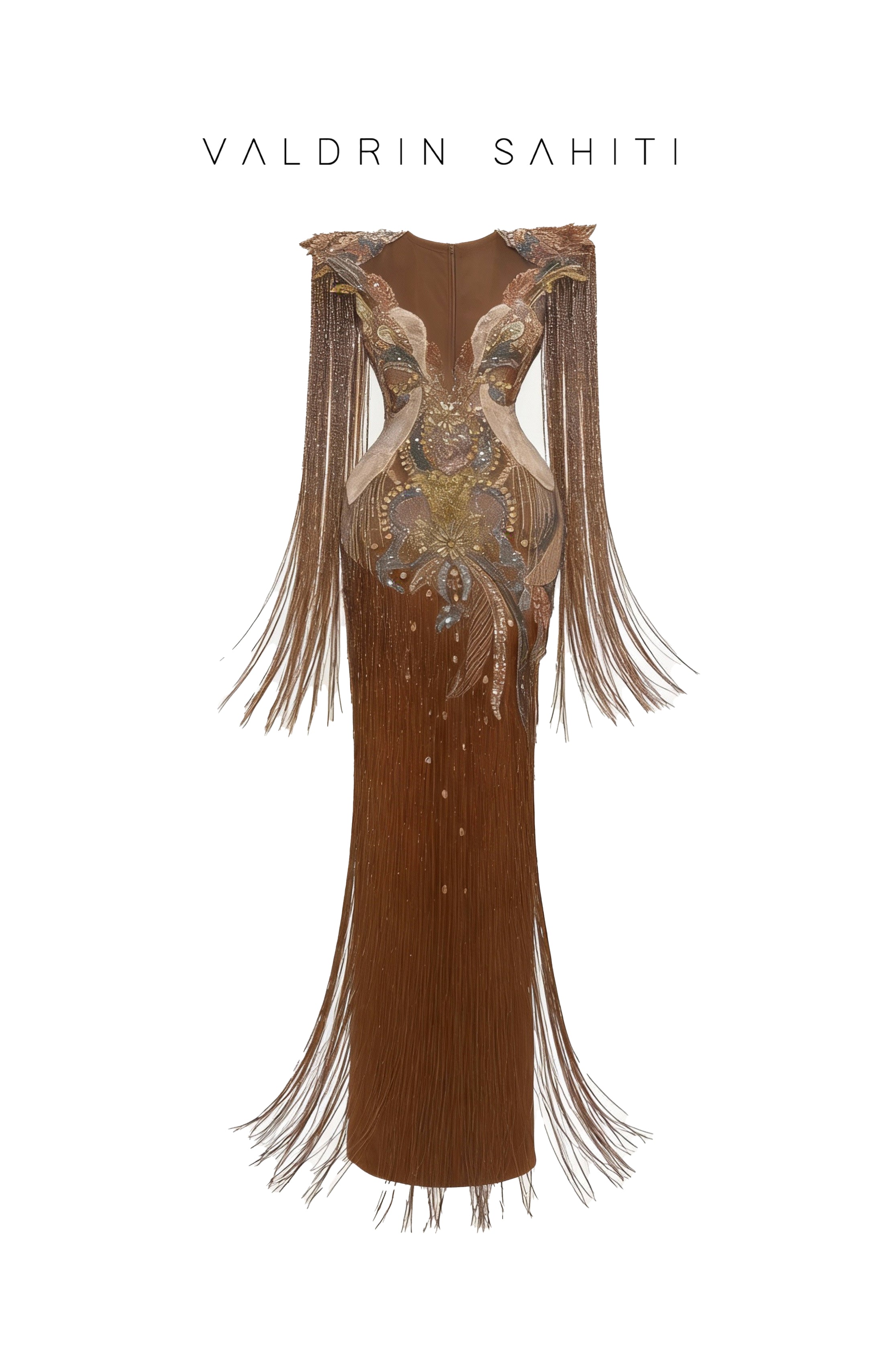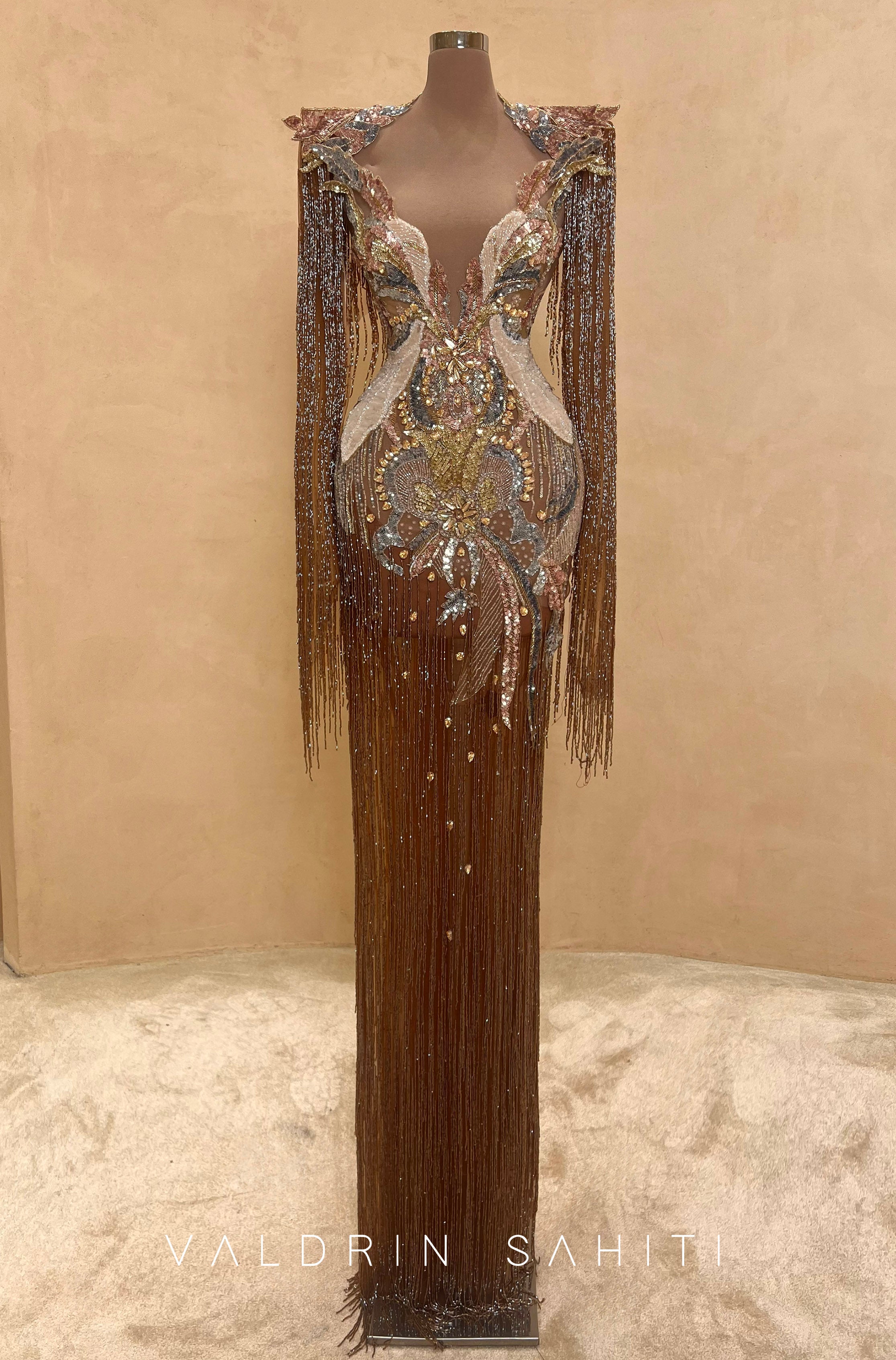 This gown features a plunging V-neckline and structural long sleeves, meticulously hand-embellished with a gradient of chocolate, bronze, and gold crystals. The silhouette is transformed by cascading metallic fringe that creates a "liquid gold" effect, offering breathtaking movement and a red-carpet-ready presence.
