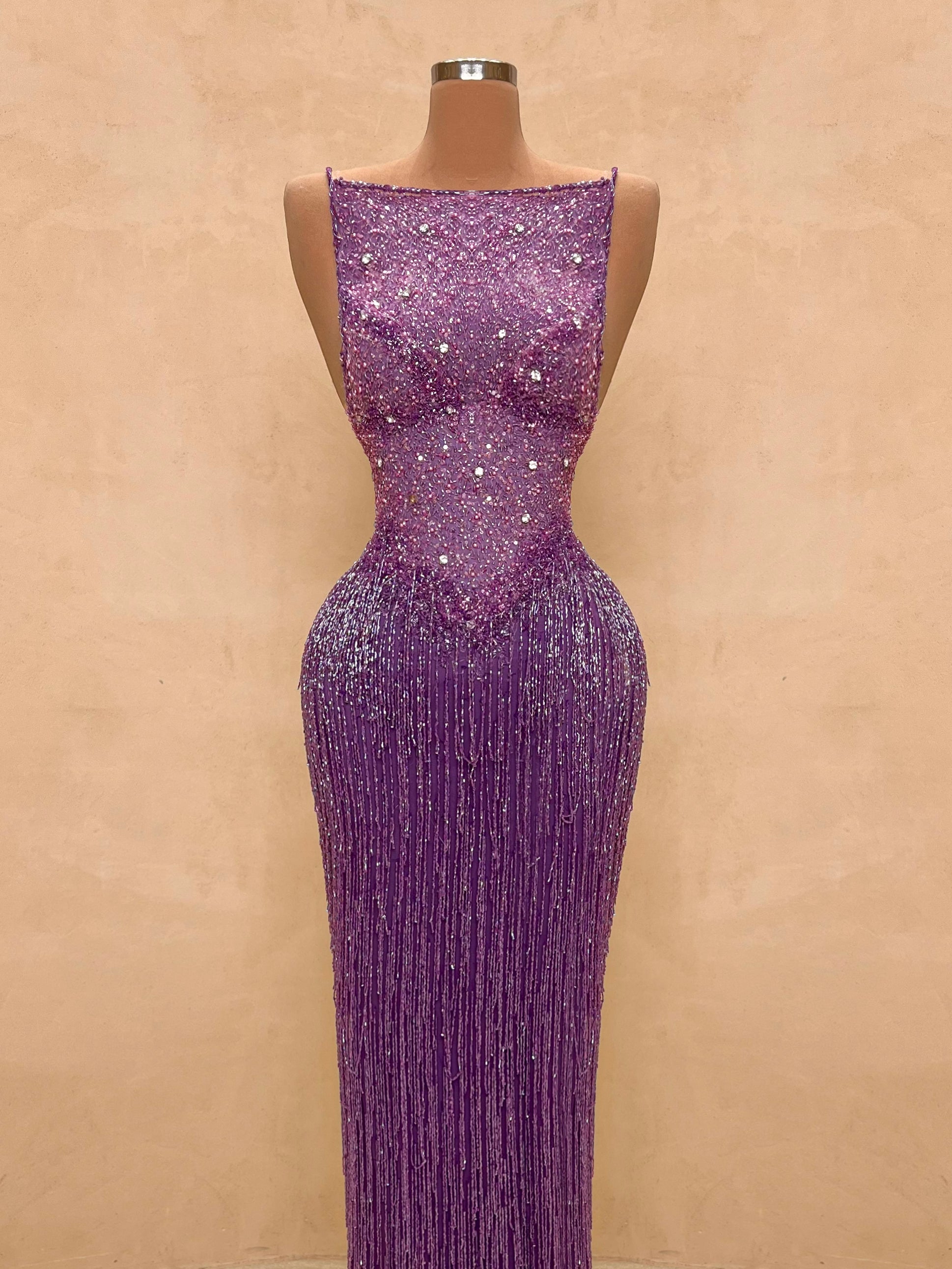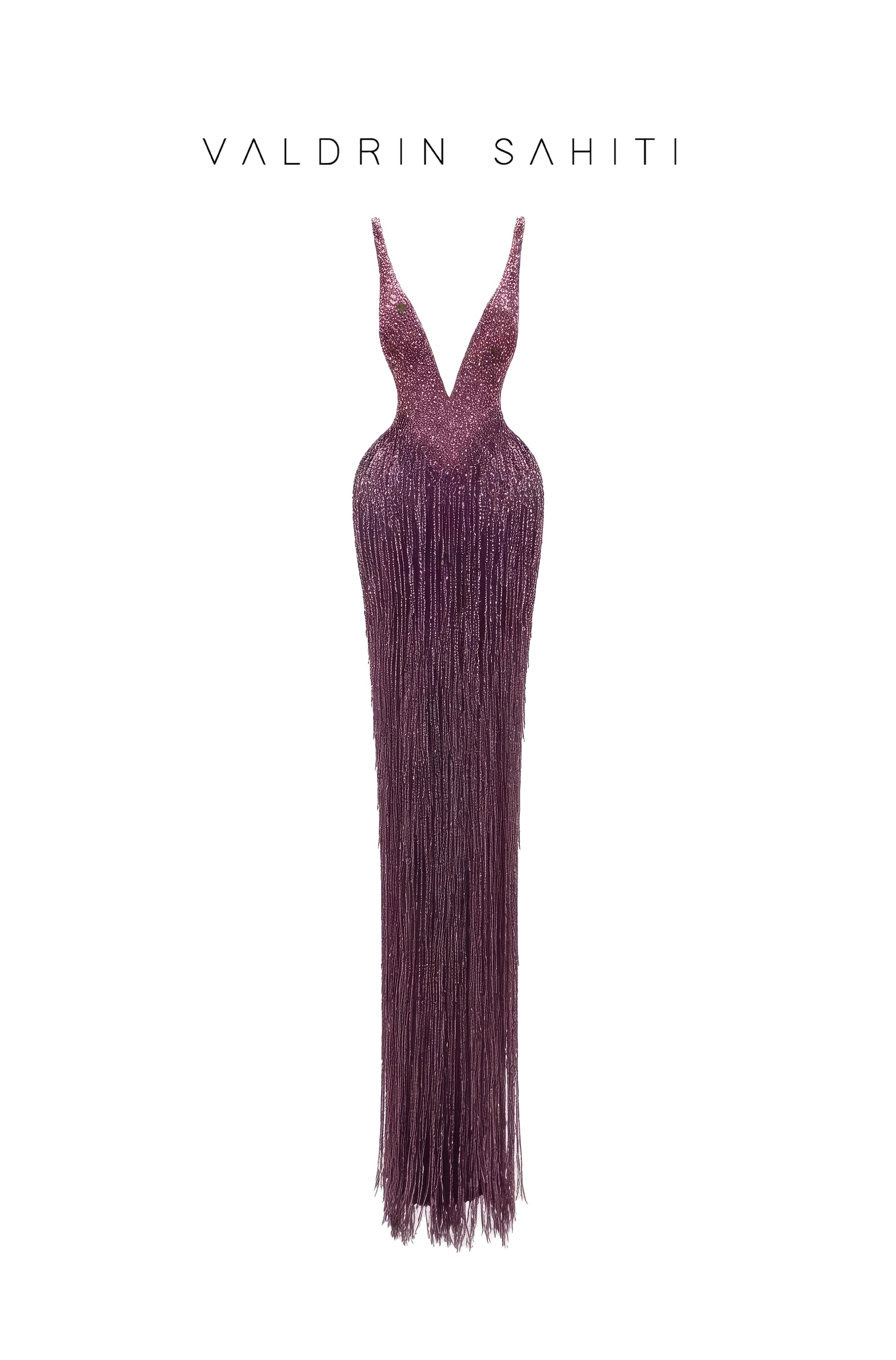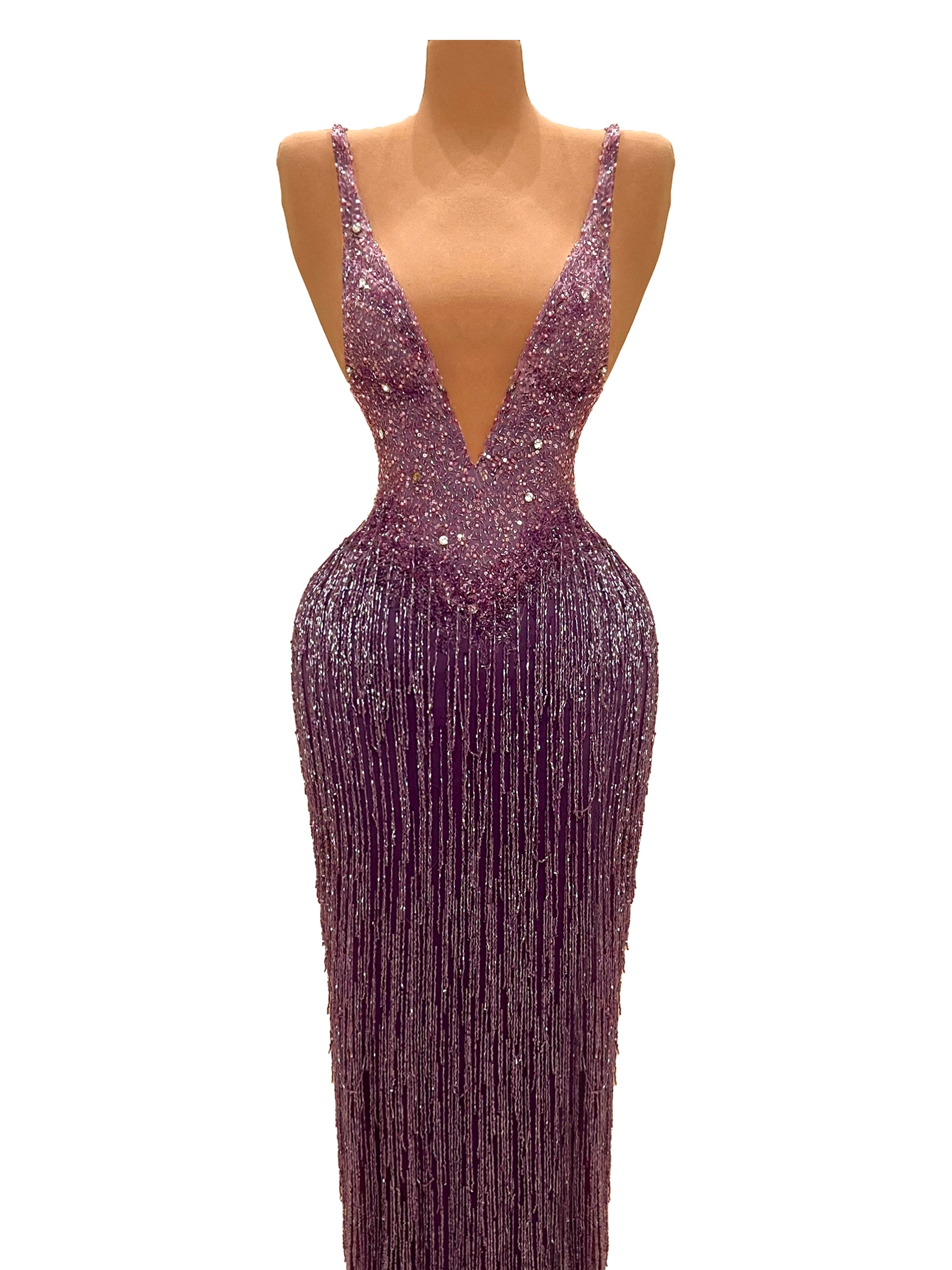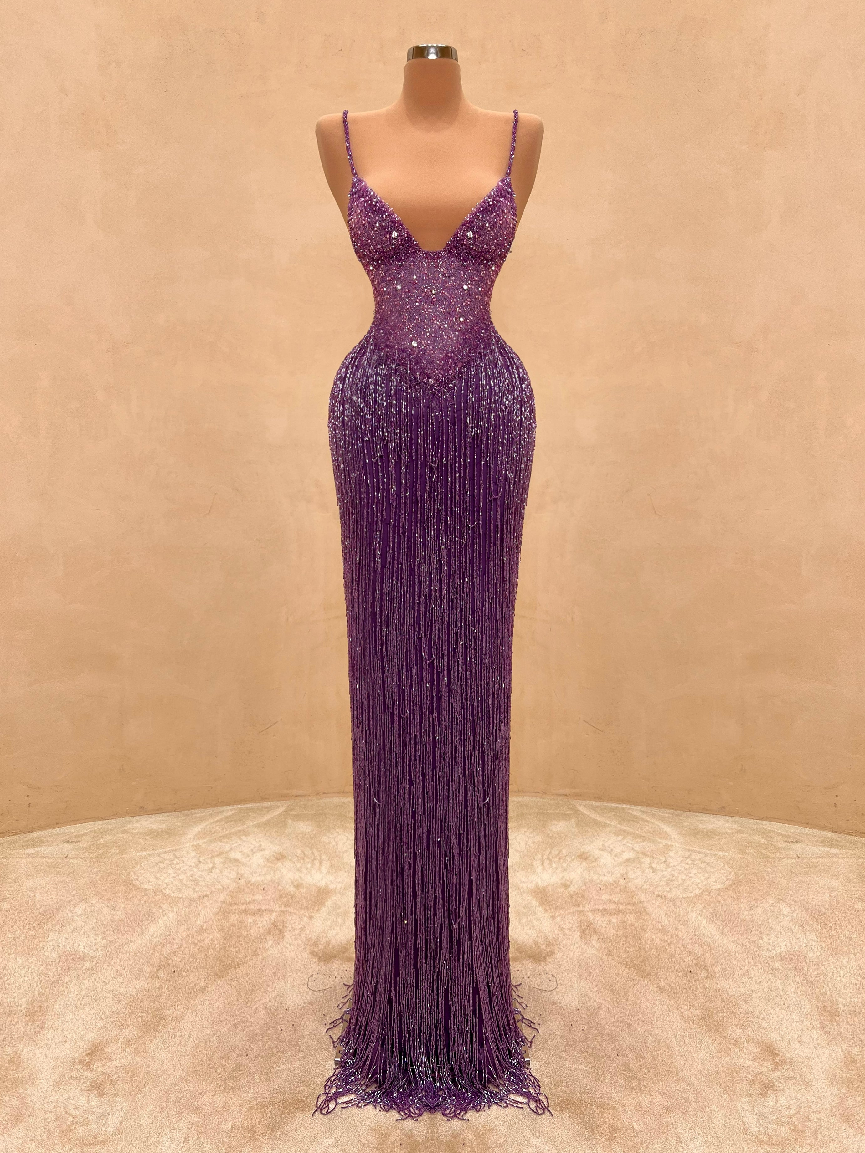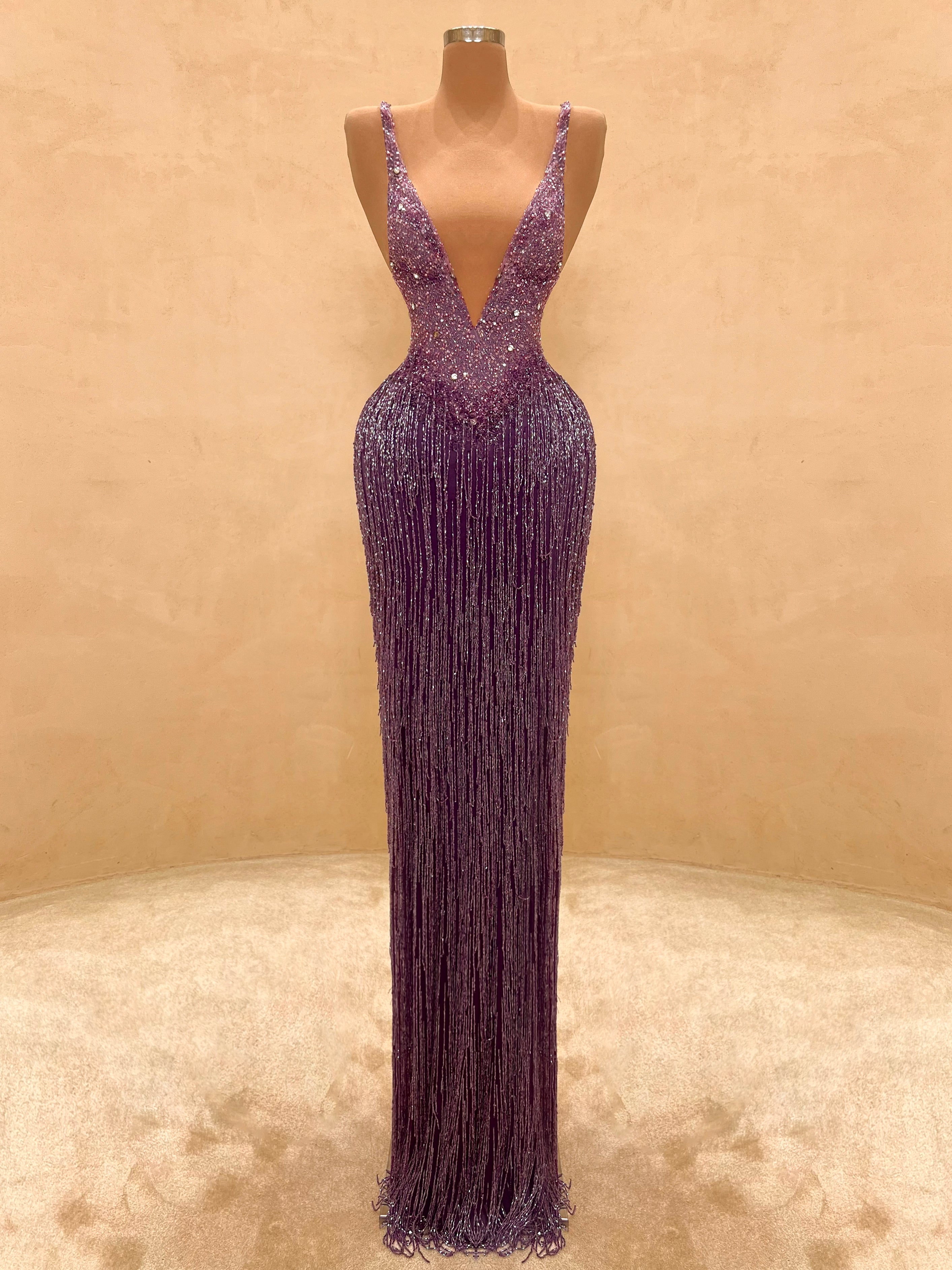 This couture-inspired piece features a precision-sculpted hourglass silhouette with internal corsetry and a daring plunge V-neckline. The bodice is encrusted with shimmering crystals that flow into a dramatic, floor-length fringe skirt, designed to catch the light and create mesmerizing movement with every step