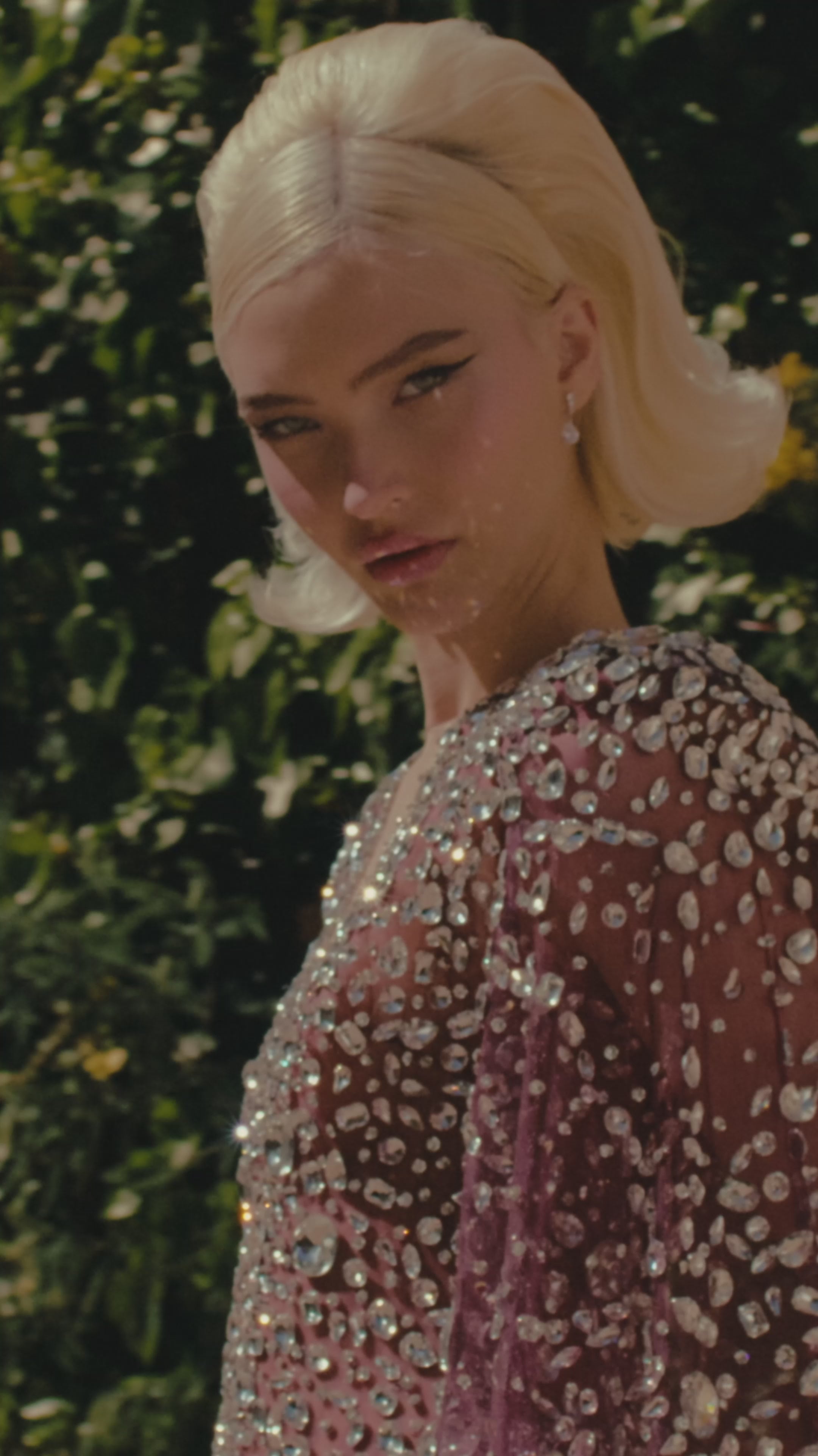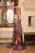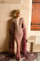Sheer plum tulle gown with a sculpted silhouette, fully hand-embellished in crystals and stones. Featuring a dramatic attached cape that flows into a regal train.
