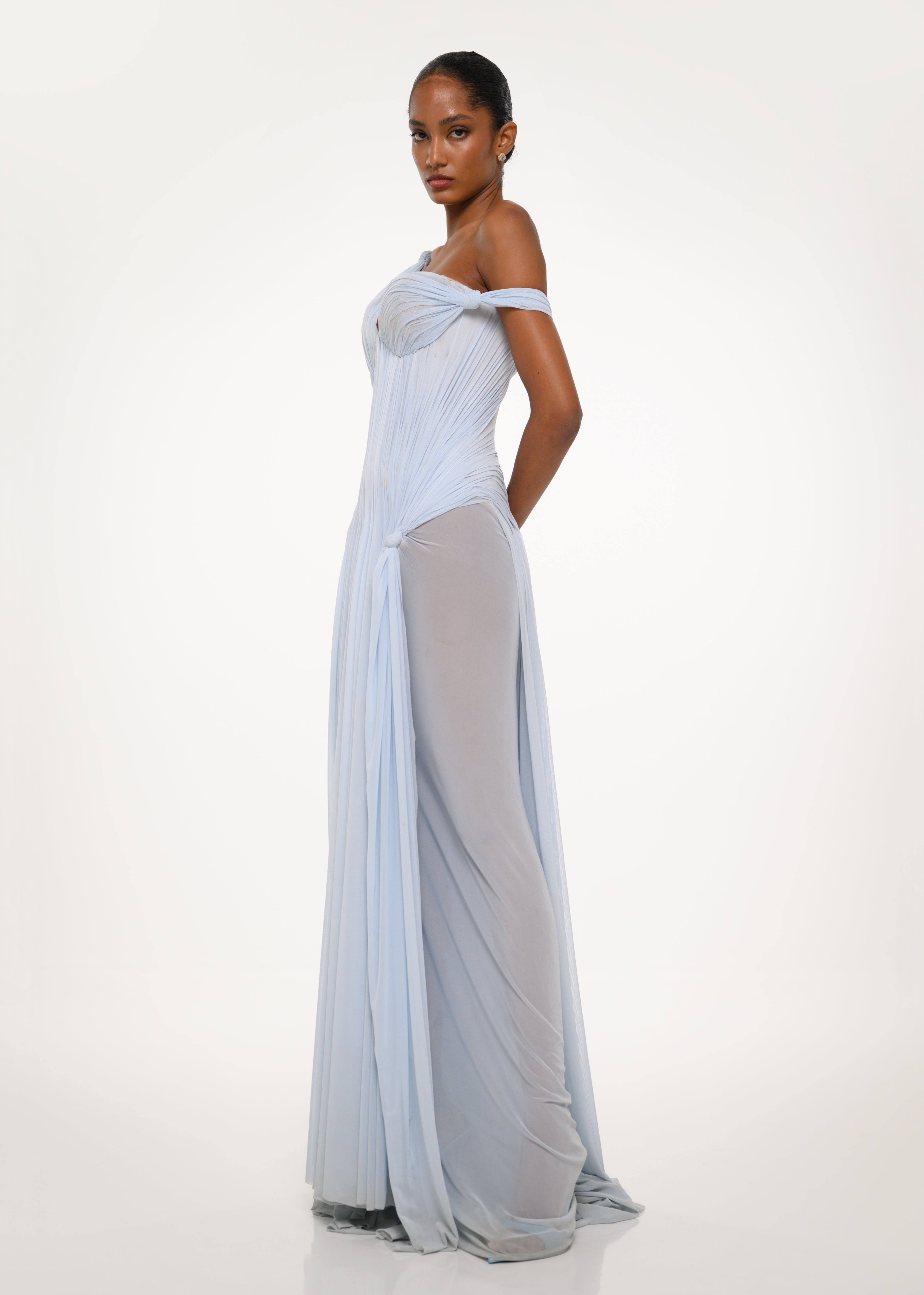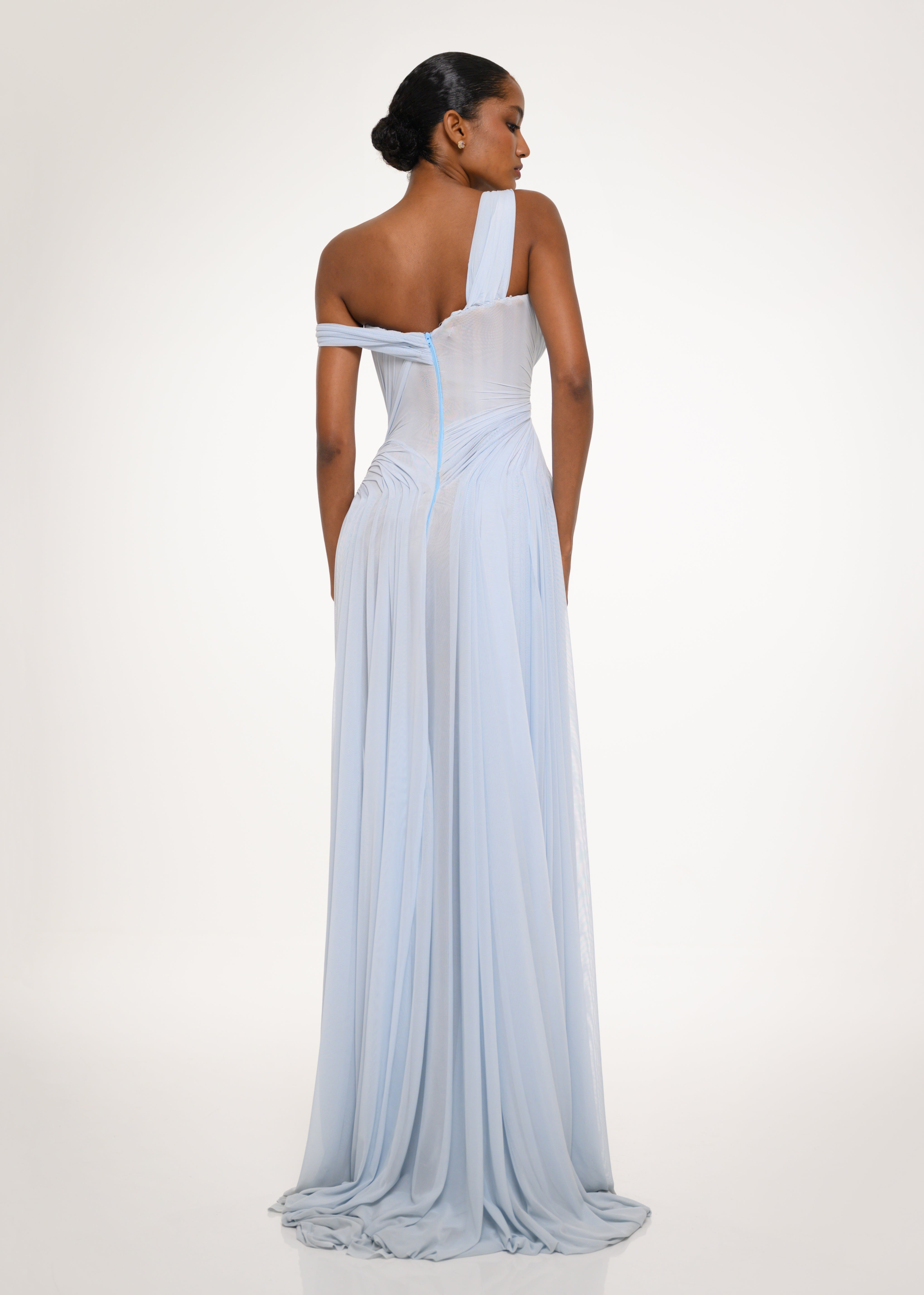 A sculpted ice blue gown with a corset bodice, soft off-shoulder draping, and fluid chiffon layers — effortlessly elegant and ethereal.