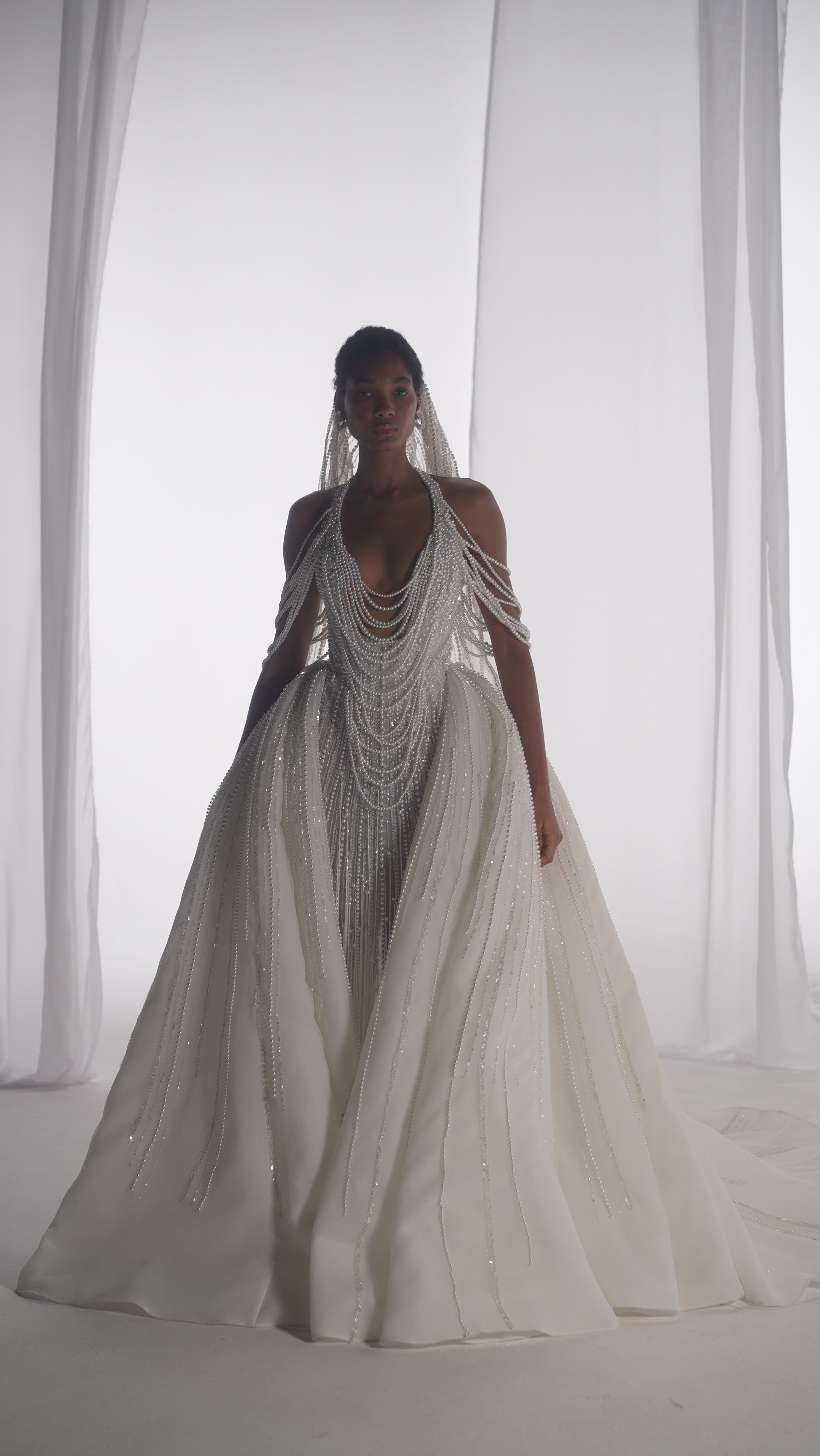 - Layered pearl drape chains across the bodice
