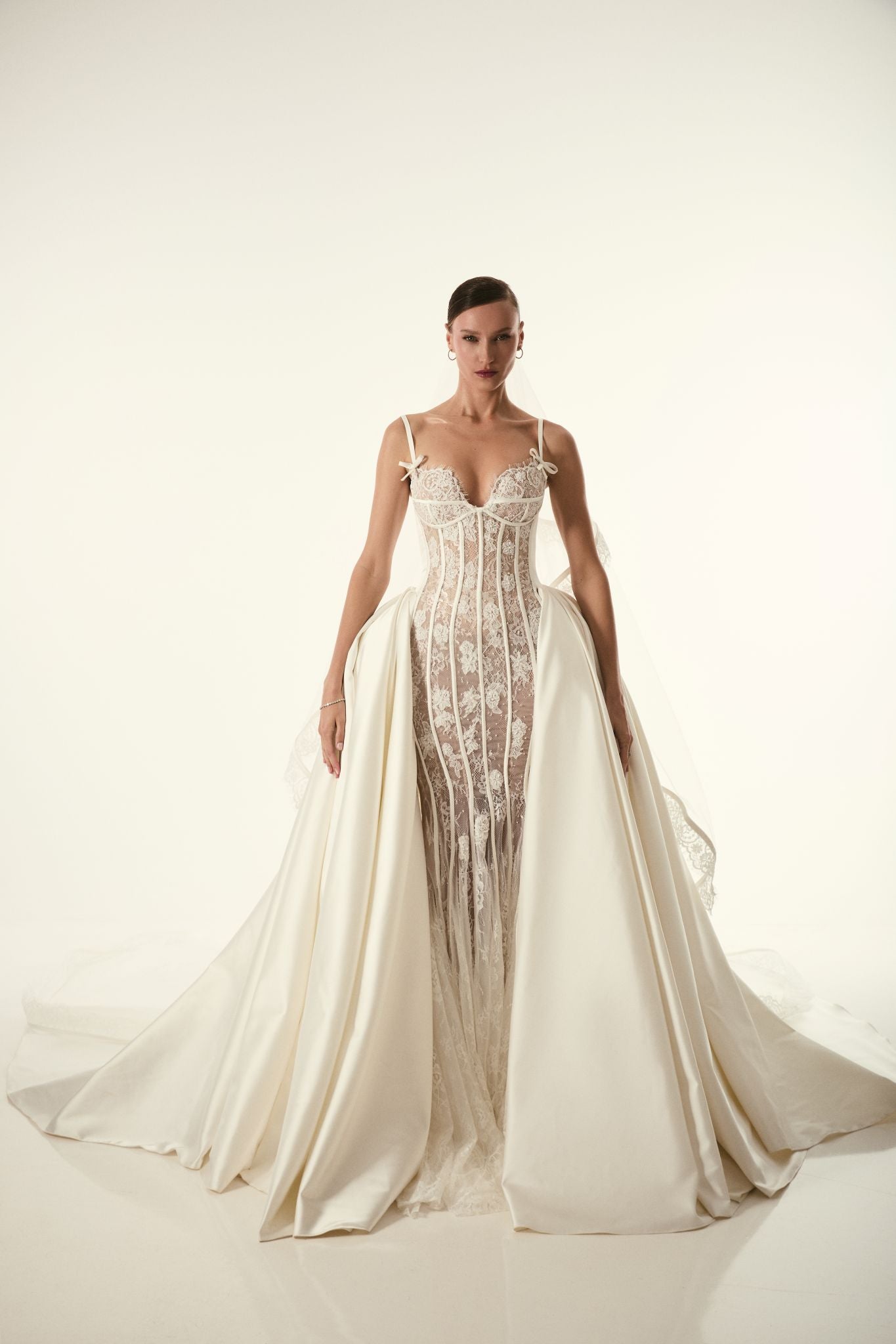Sheer lace wedding gown with delicate straps, a structured corset bodice, and a dramatic detachable overskirt. Elegant, modern, and beautifully detailed.