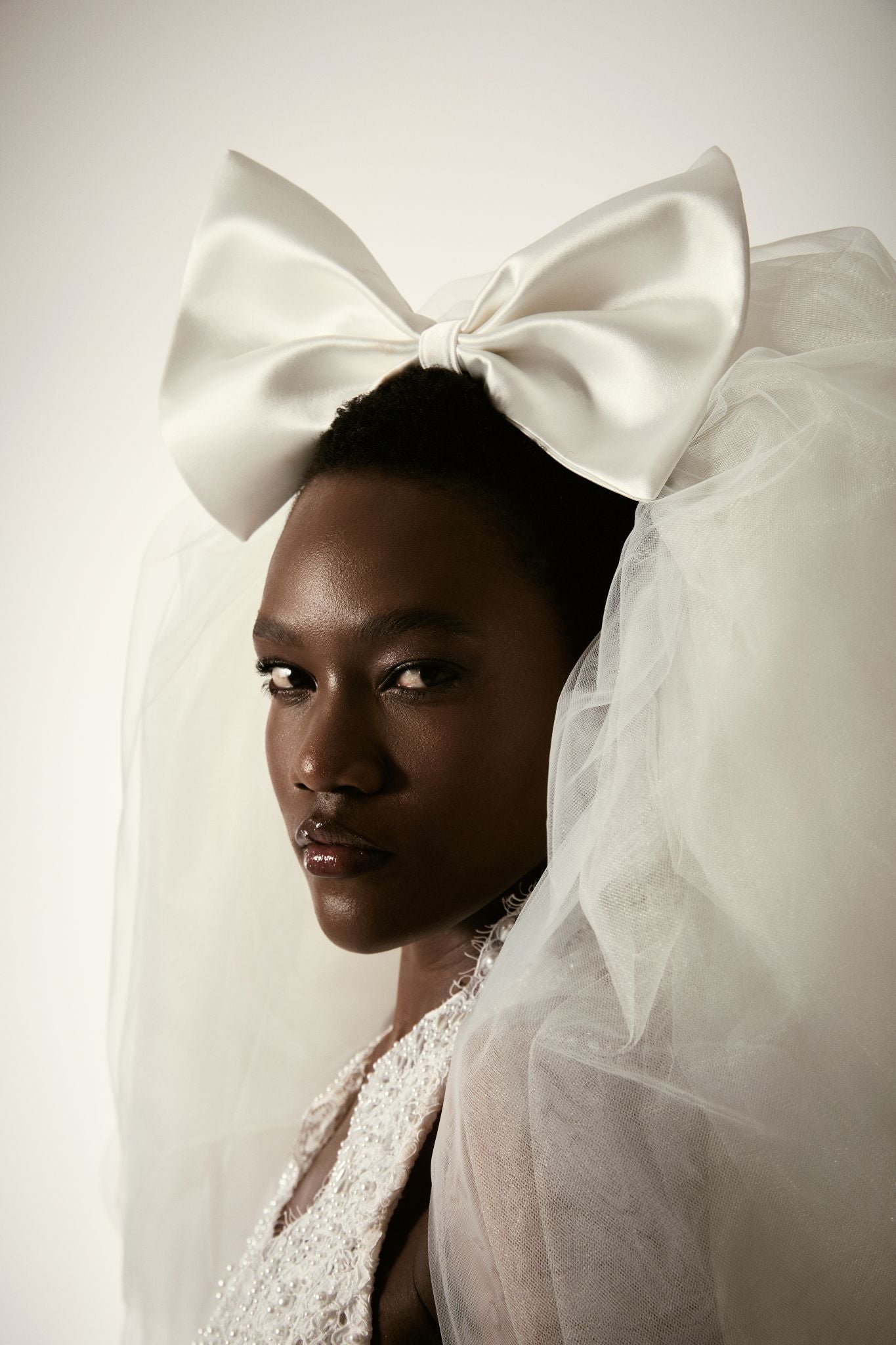 Halter-neck lace wedding gown with a dramatic plunging neckline and corset-style bodice featuring crisscross detailing. The fitted silhouette is accentuated by a bold thigh-high slit edged in scalloped lace, layered with a sheer overskirt for added volume and movement. Finished with a statement tulle veil topped by an oversized bow, blending modern sensuality with high-fashion bridal drama.