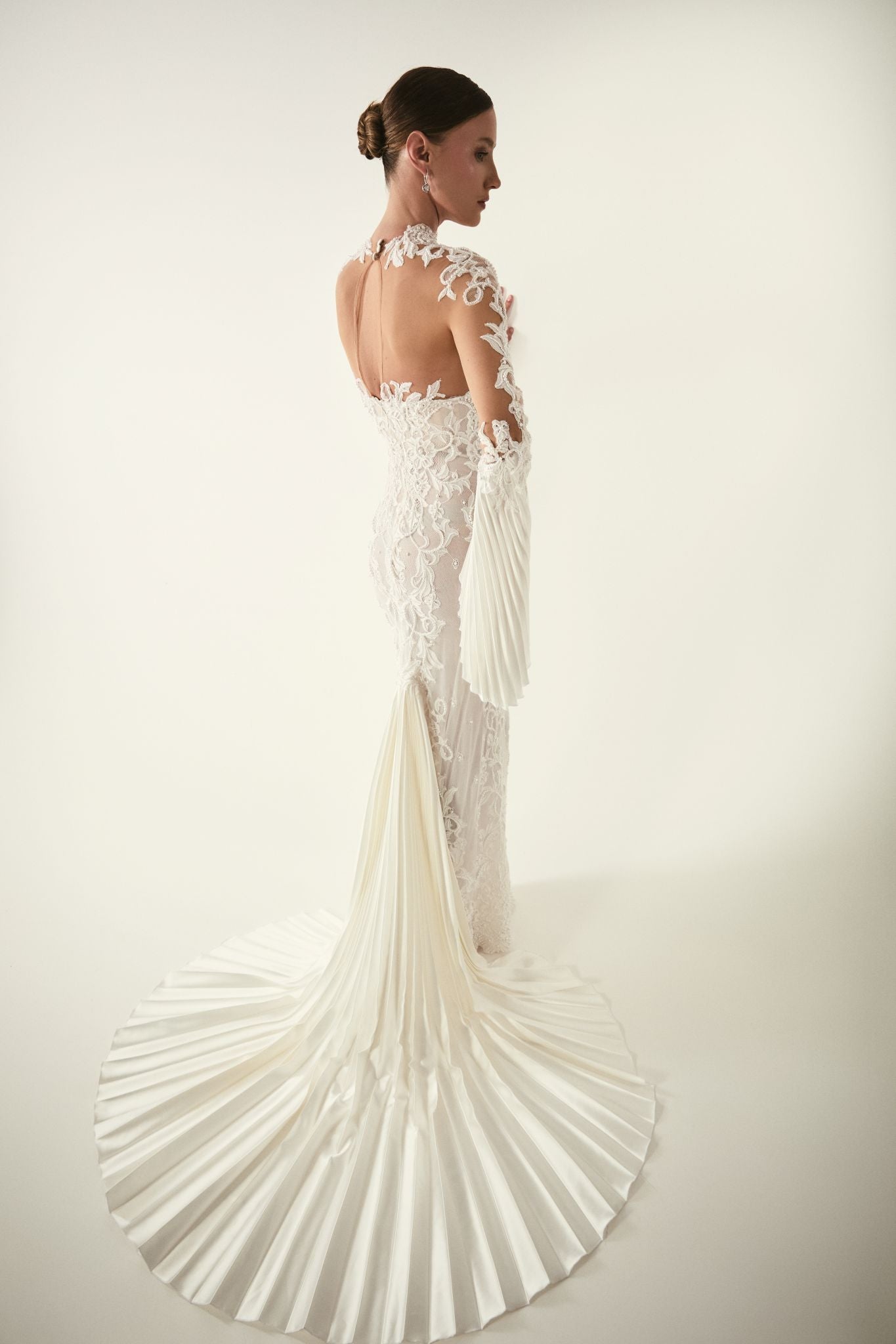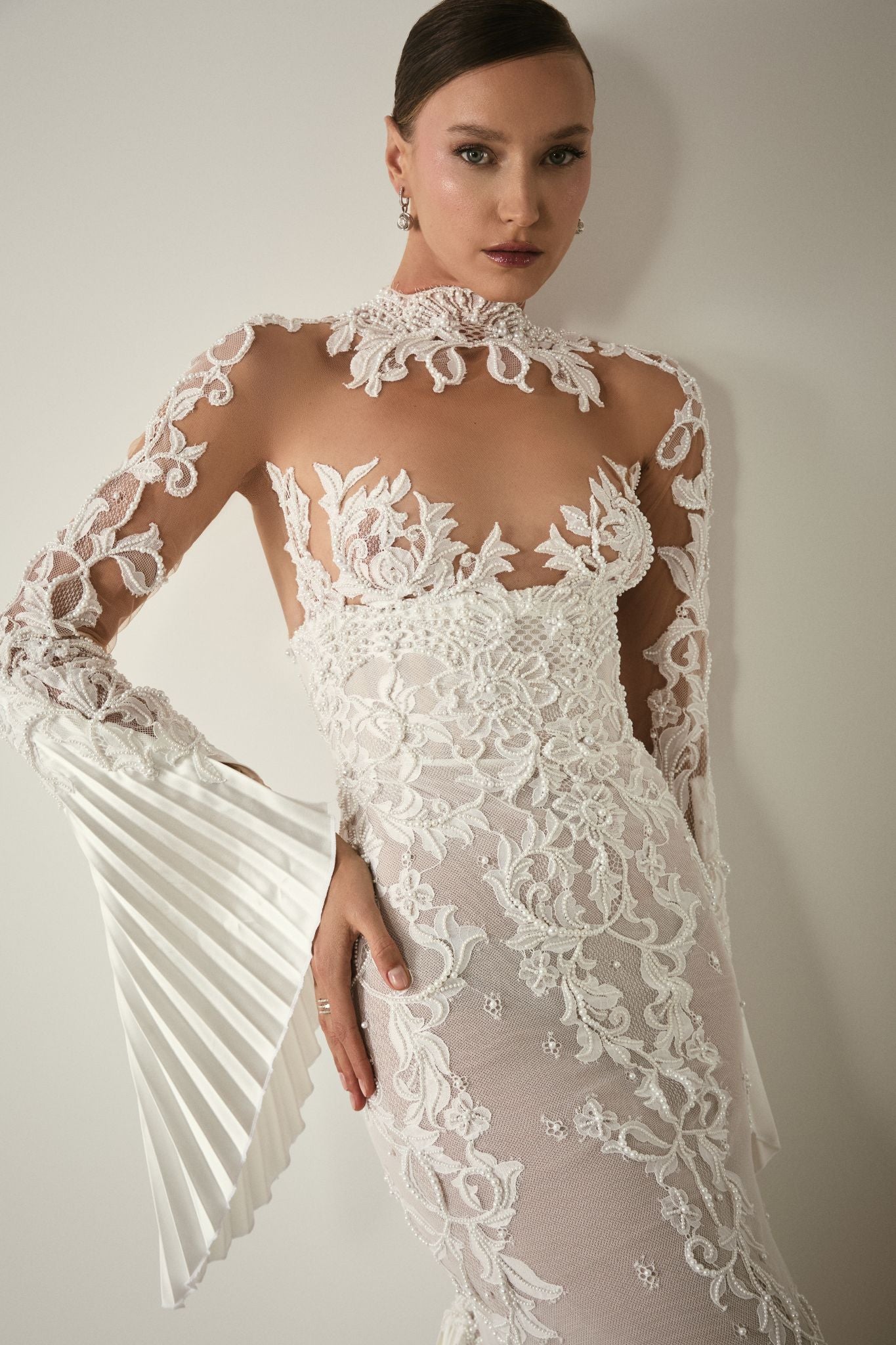 High-neck illusion sheath wedding gown crafted in sheer nude tulle, intricately overlaid with sculptural floral lace appliqué. The fitted silhouette elongates the body, while the transparent bodice and sleeves create a refined balance of sensuality and elegance. Softly fluted, pleated sleeve cuffs and a dramatic sunburst-pleated train add architectural movement and couture drama. Sophisticated, modern, and strikingly refined.