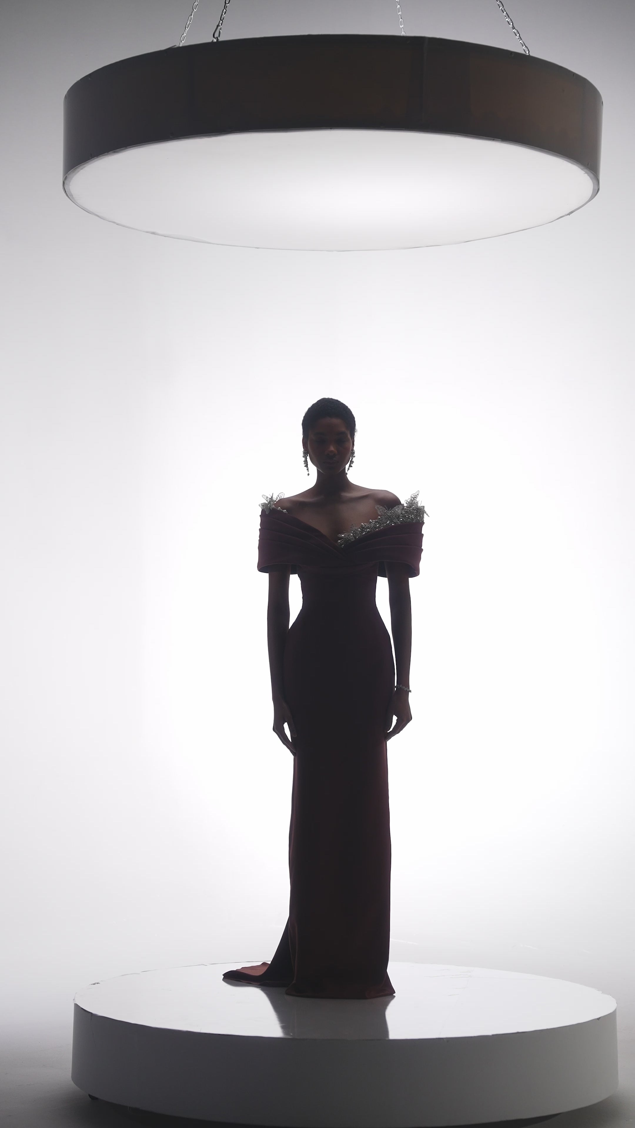 An elegant off-shoulder evening gown crafted in a rich chocolate brown tone. This sculpted silhouette features a softly draped neckline adorned with delicate crystal embellishments, creating a refined balance between structure and femininity