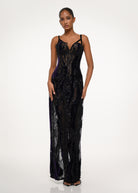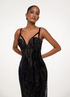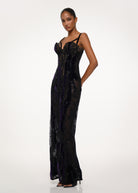 A black sequin-embellished gown with a sculpted corset top and sheer lace layers — radiating power and allure under every light.