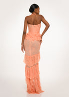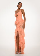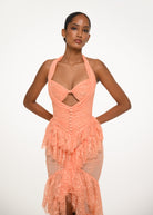 A soft peach lace gown with tiered ruffles and a sculpted halter corset — delicate yet daring, radiating effortless femininity.