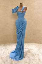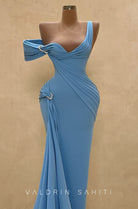 Elegance in every curve. This off-shoulder masterpiece in powder blue is crafted to accentuate the silhouette with structured pleats that cascade gracefully across the bodice and hip. The sculpted neckline, paired with delicate short sleeves, evokes timeless sophistication, while the high-slit draping adds a touch of bold femininity. Ideal for red carpet moments, gala events, or unforgettable evenings.