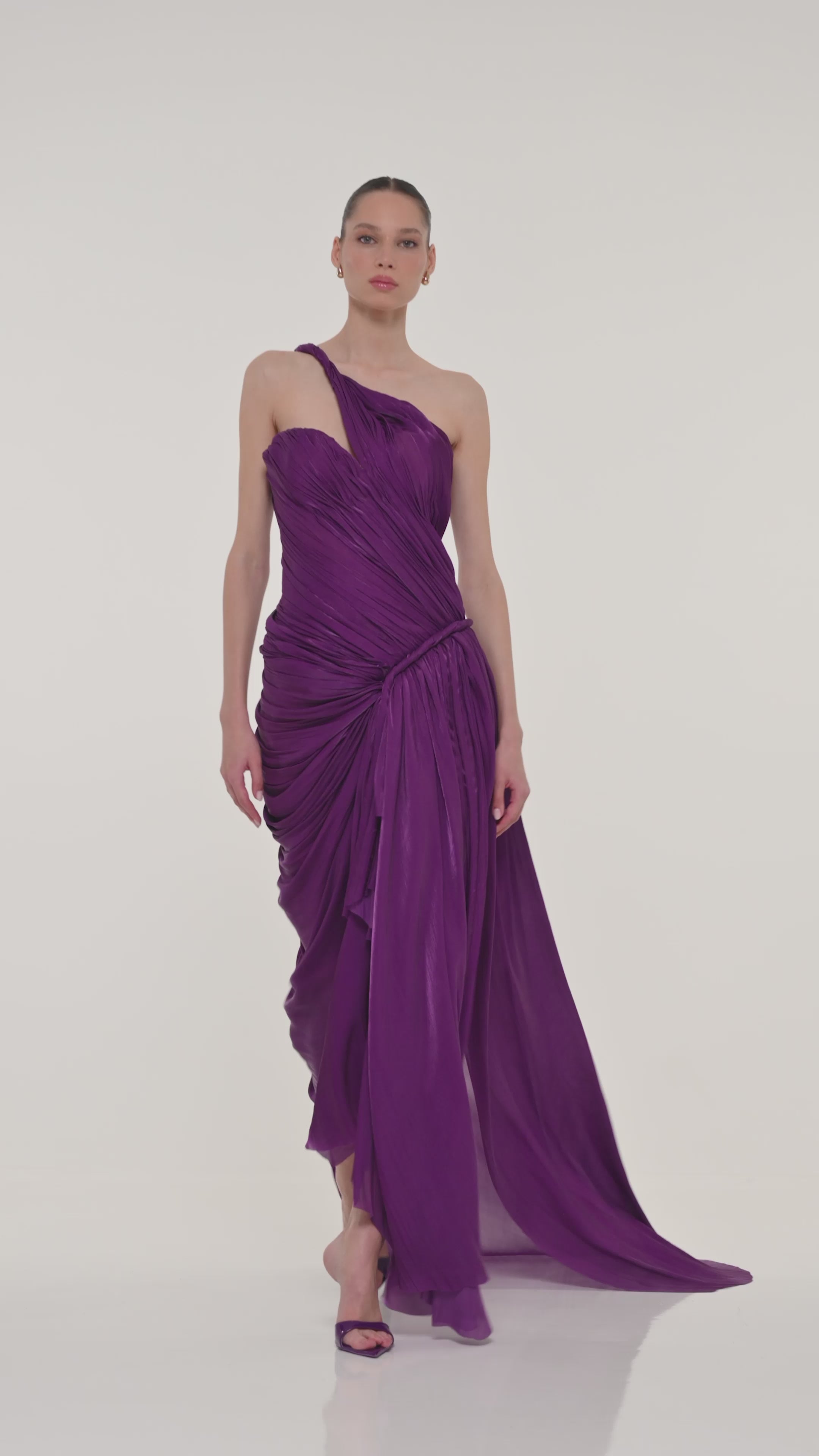 A sculptural purple dress with asymmetrical lines and a cascading train - where couture artistry meets contemporary sophistication.