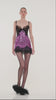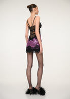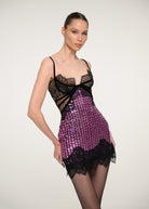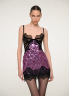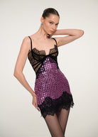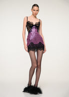 A shimmering violet sequin party mini dress with lace detailing - designed for glamour.