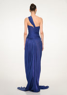 A sculptural one-shoulder dress in royal blue satin, featuring a twisted bust and soft draping that flows into a train, timeless allure with modern refinement.