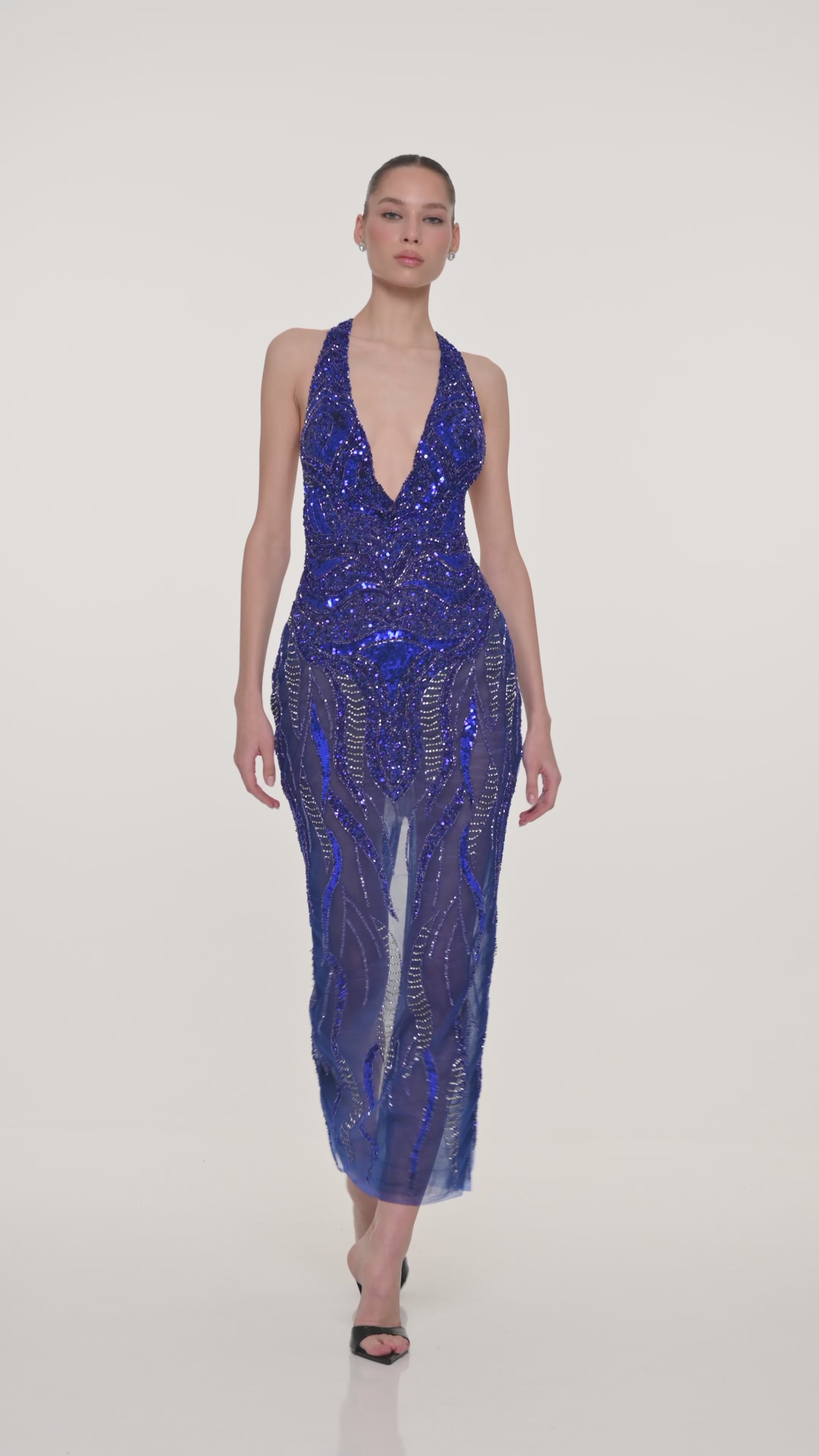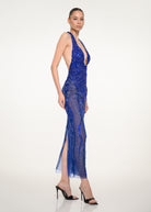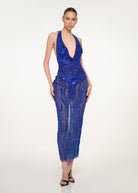 A captivating royal blue halter dress embellished with intricate beading and sheer panels, craftsmanship and modernity for a luminous evening look.