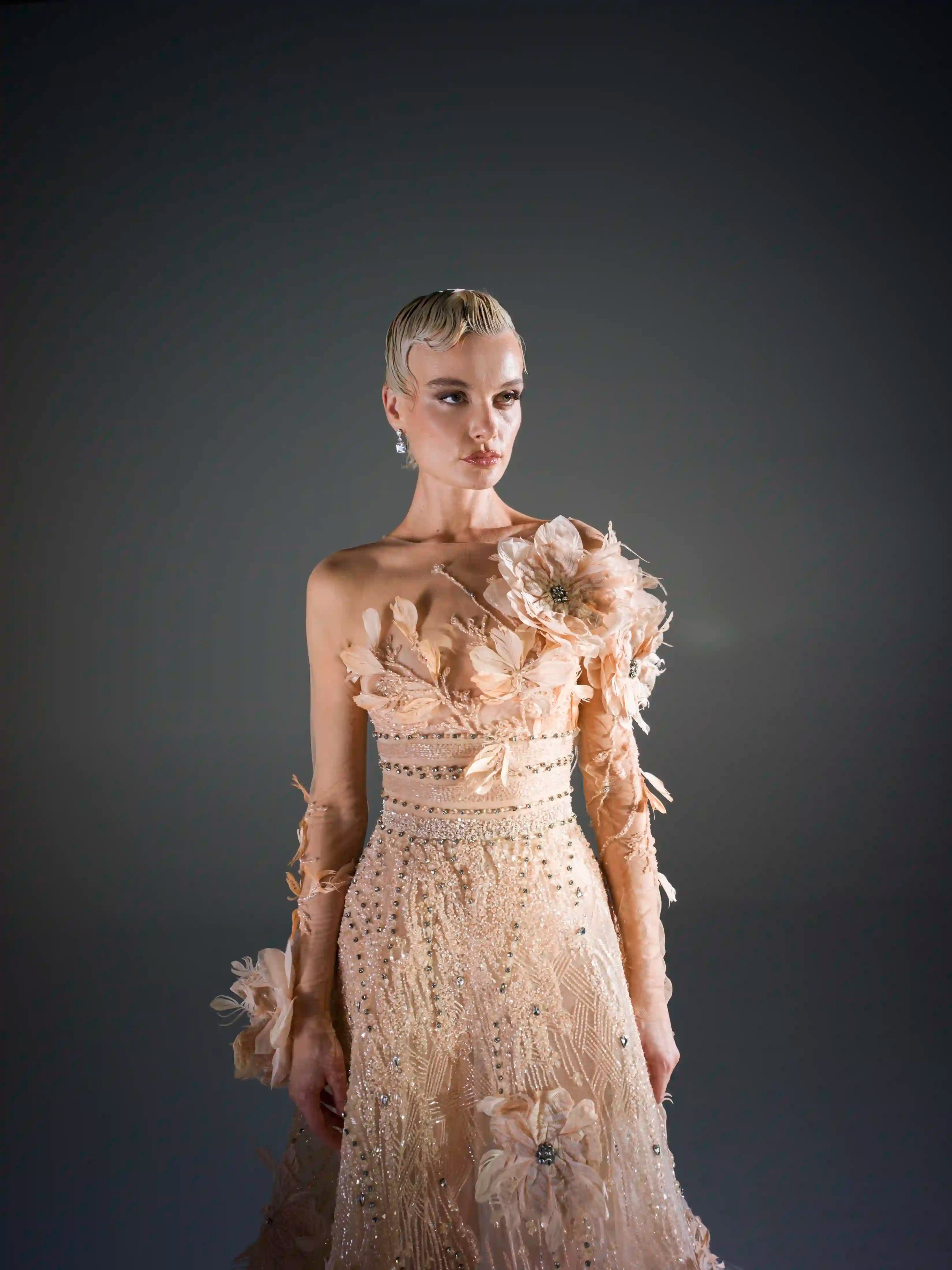 Introducing GLAMRIZE - 14, the perfect dress for any glamorous occasion. With a stunning one shoulder design and a long sleeve for added elegance, this dress is sure to turn heads. The intricate 3D flower applique and feathers add a touch of opulence to this one-of-a-kind piece.