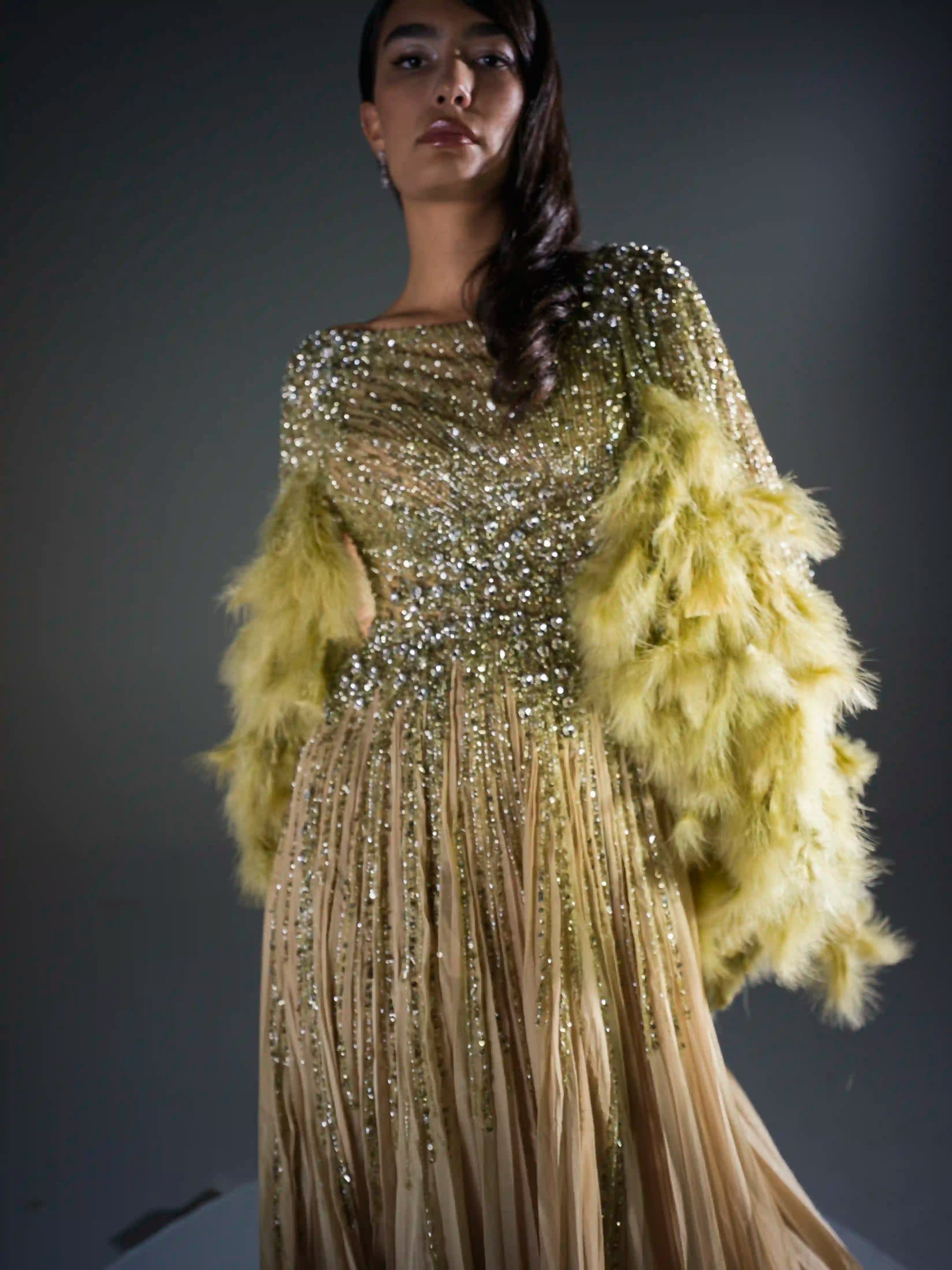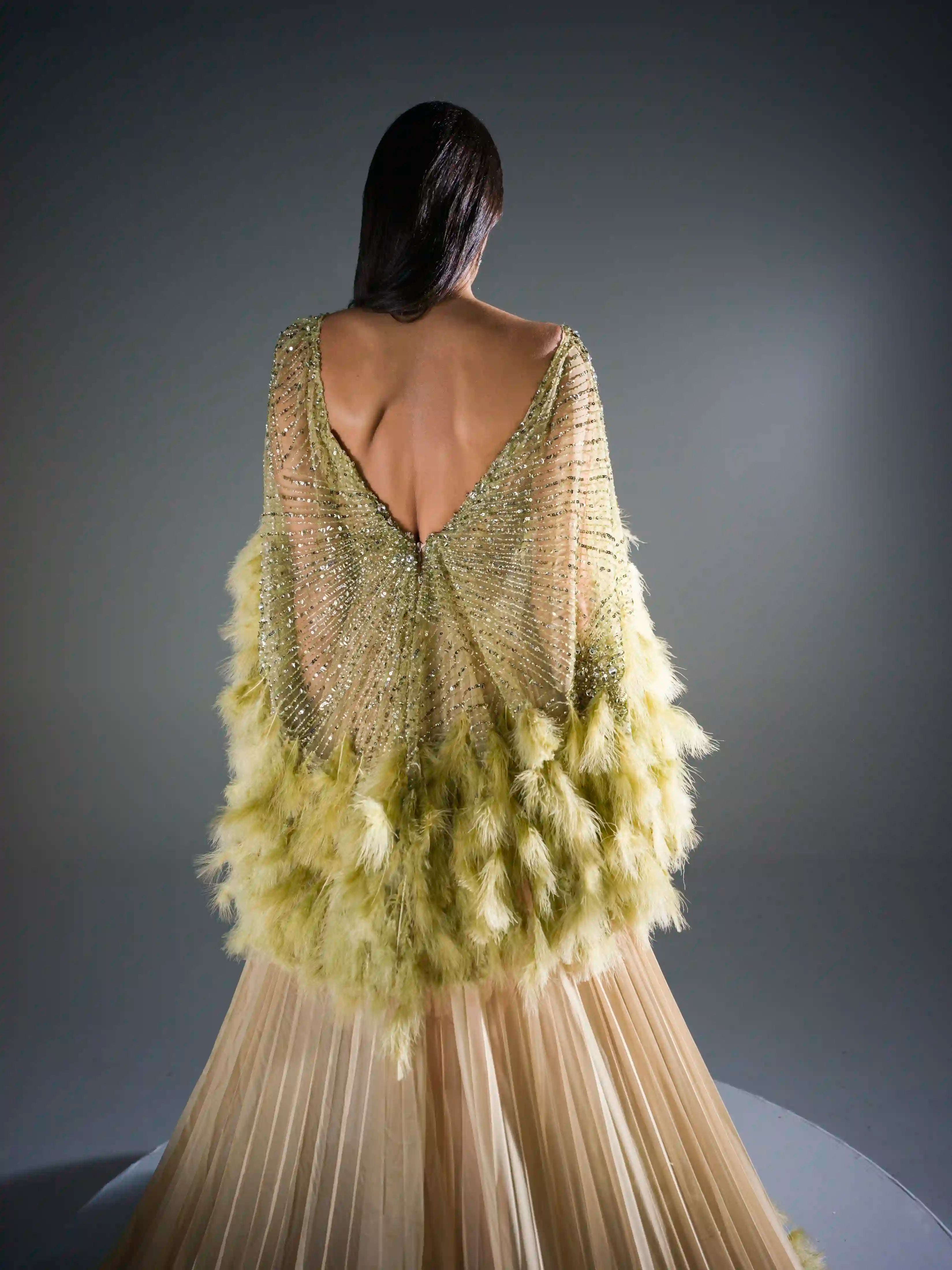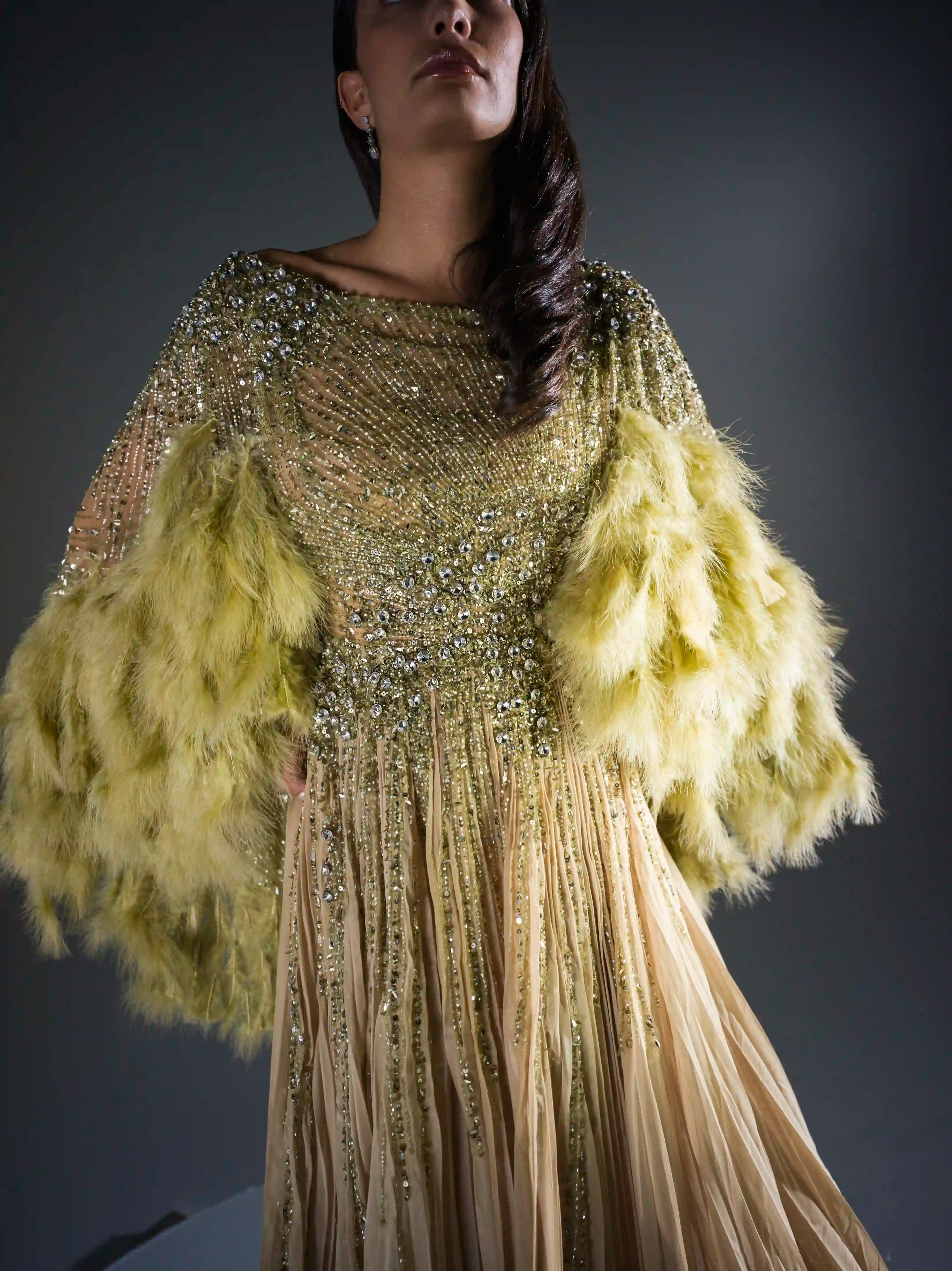 - Dramatic marabou feather sleeves in muted chartreuse