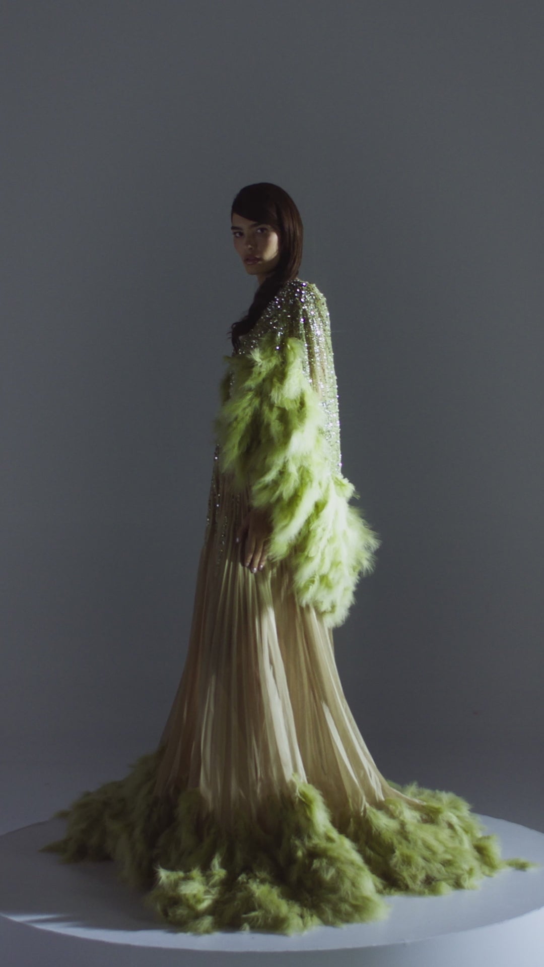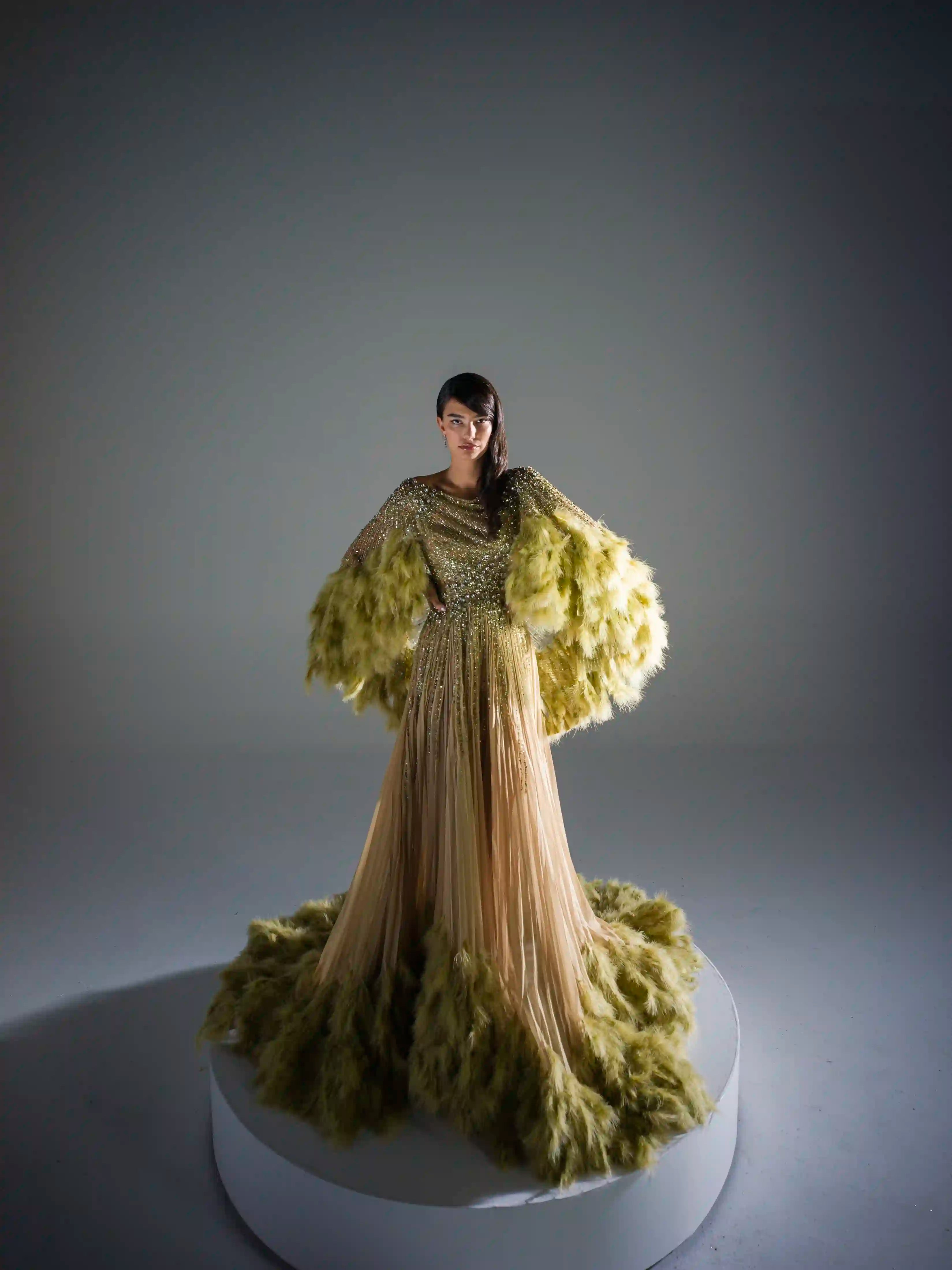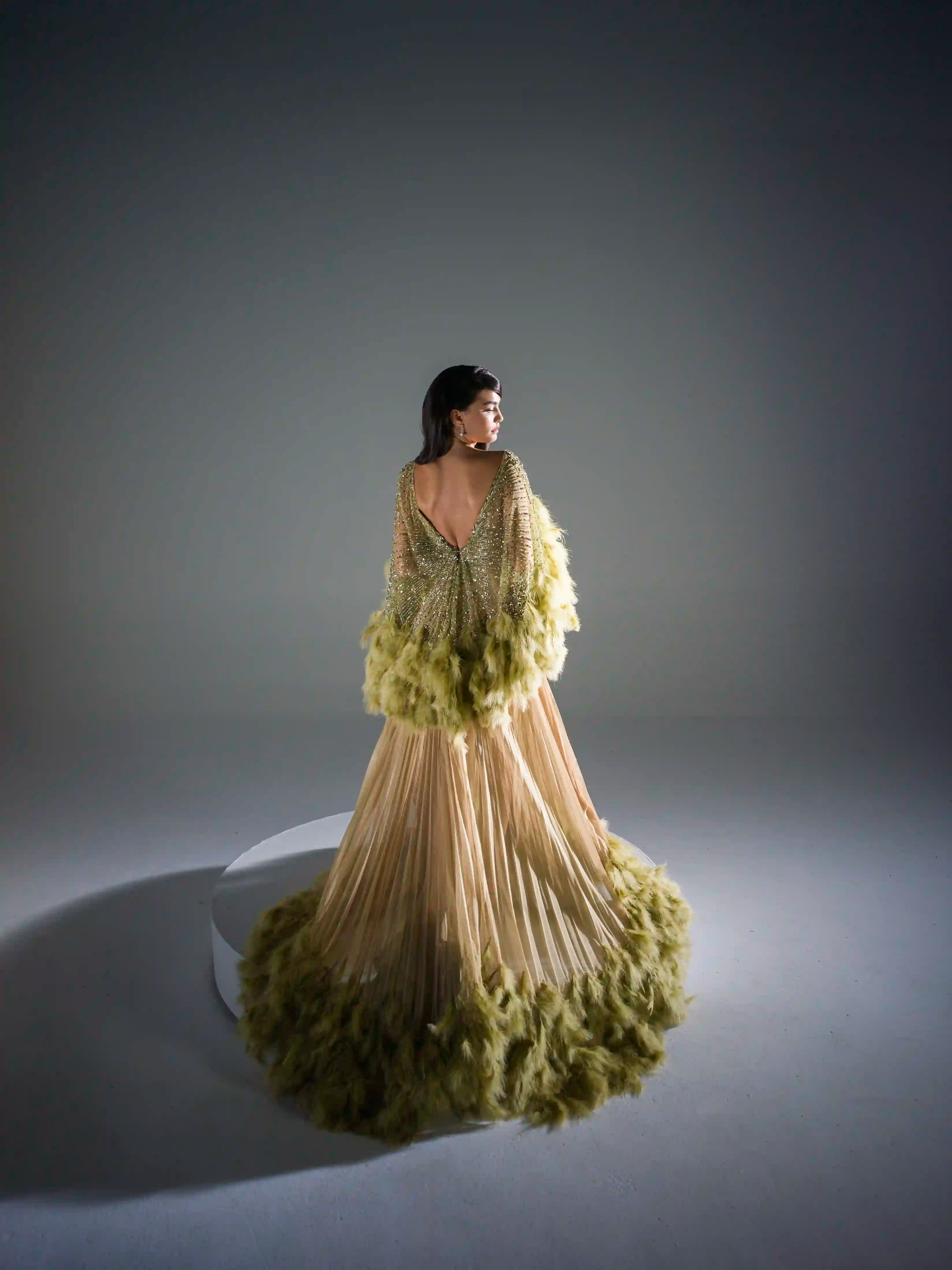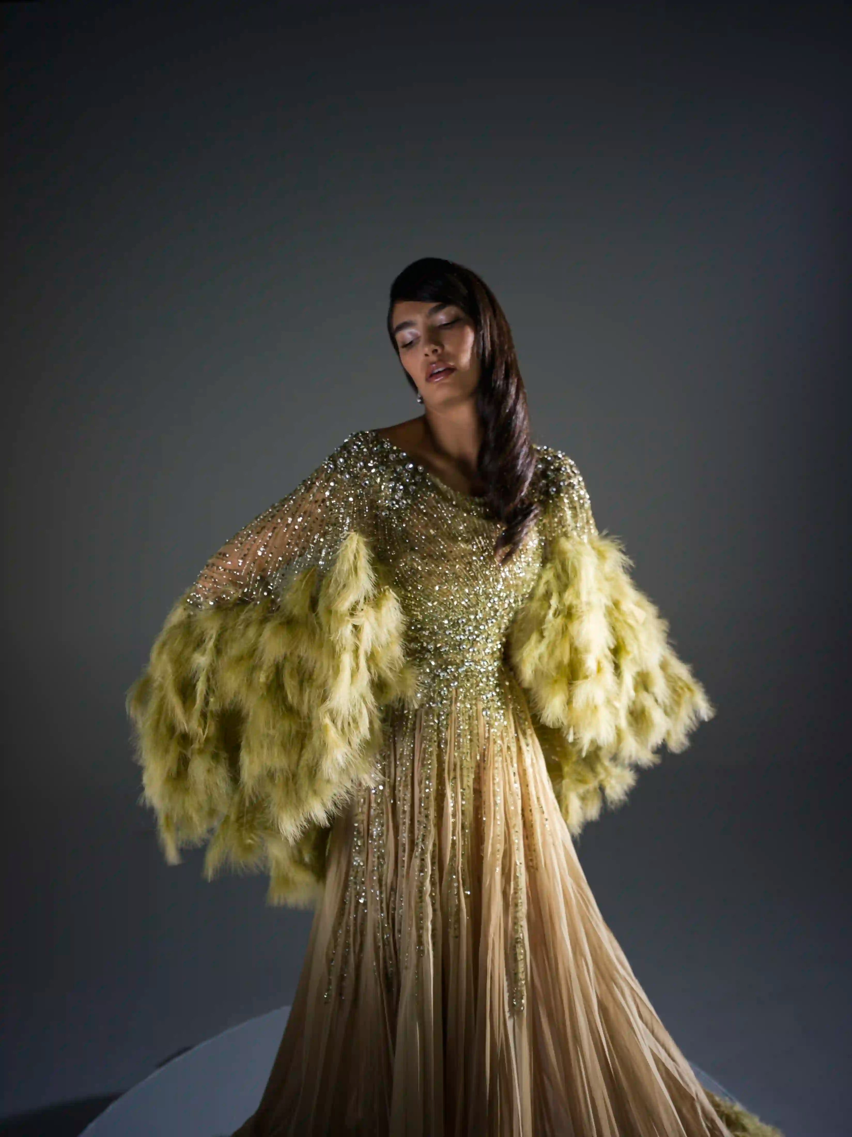- Dramatic marabou feather sleeves in muted chartreuse