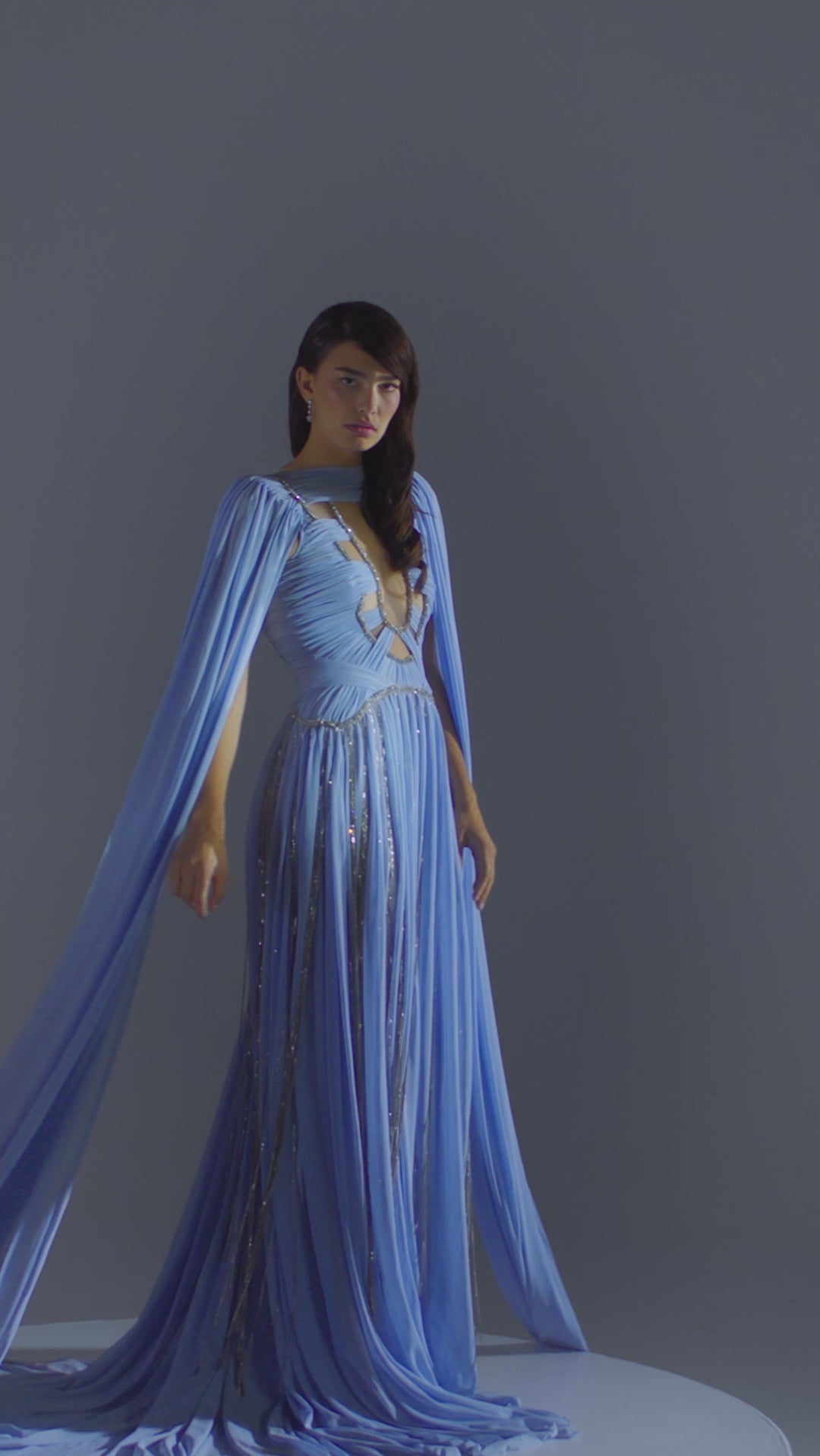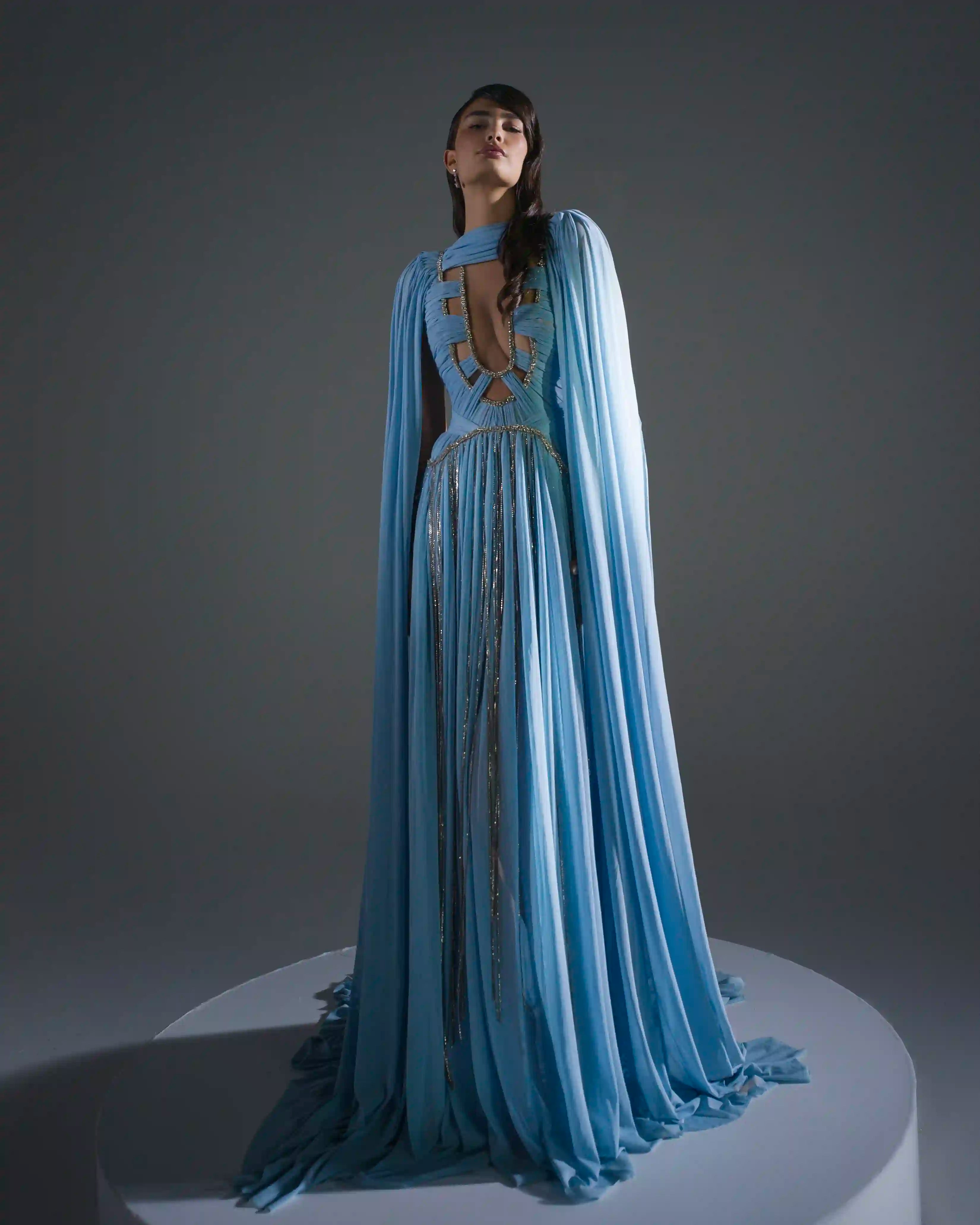 - Floor-length cape sleeves for dramatic silhouette