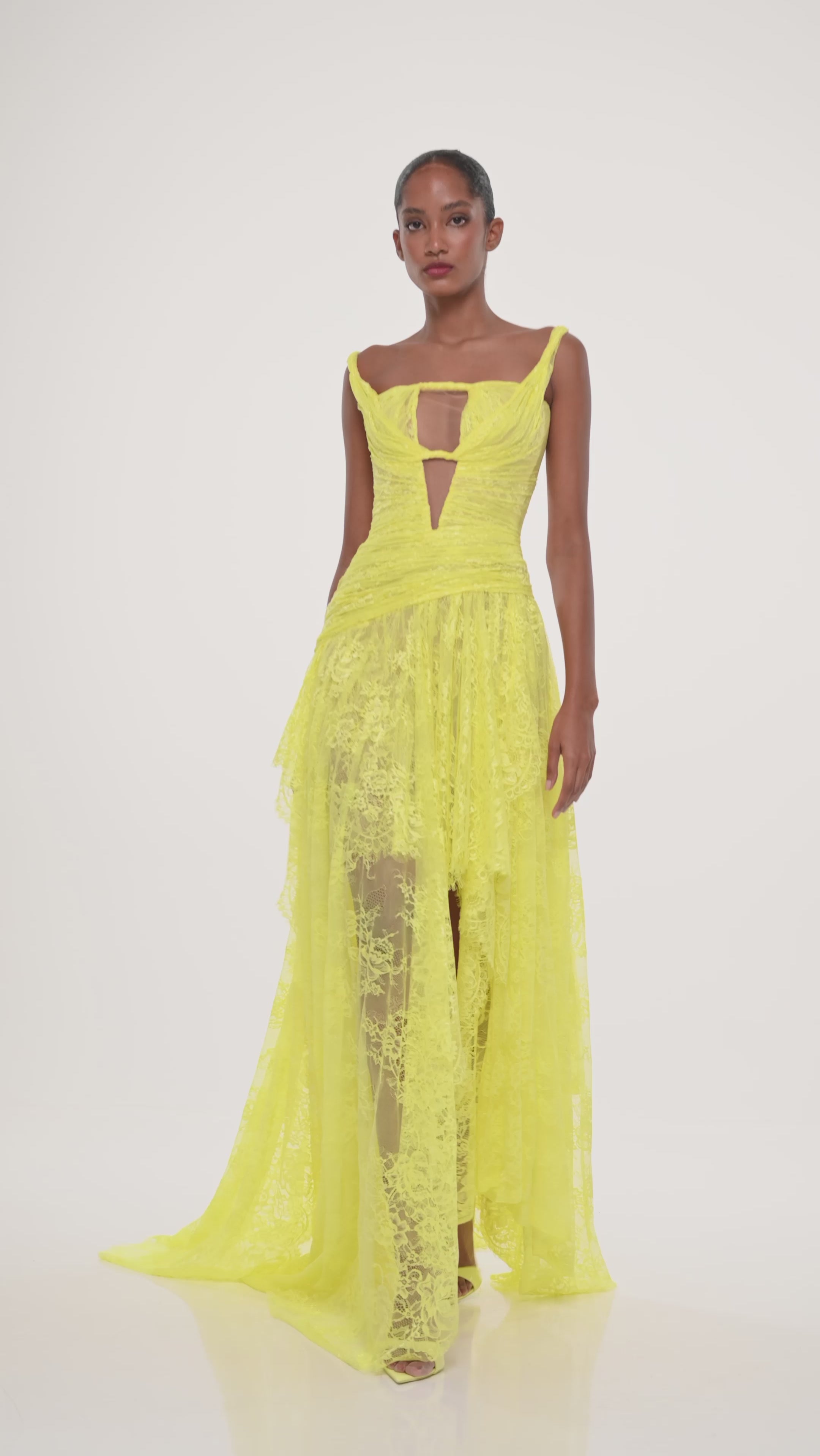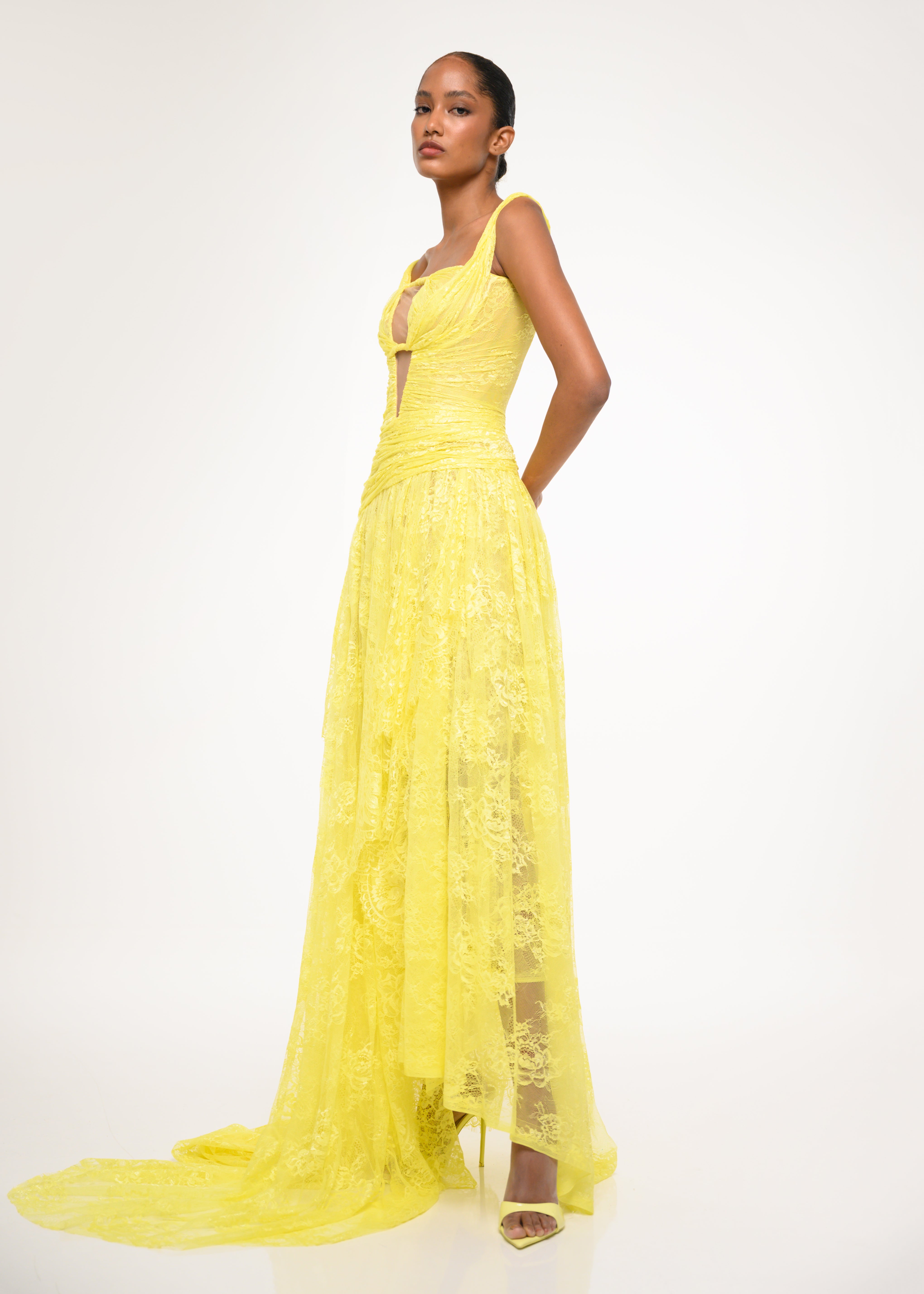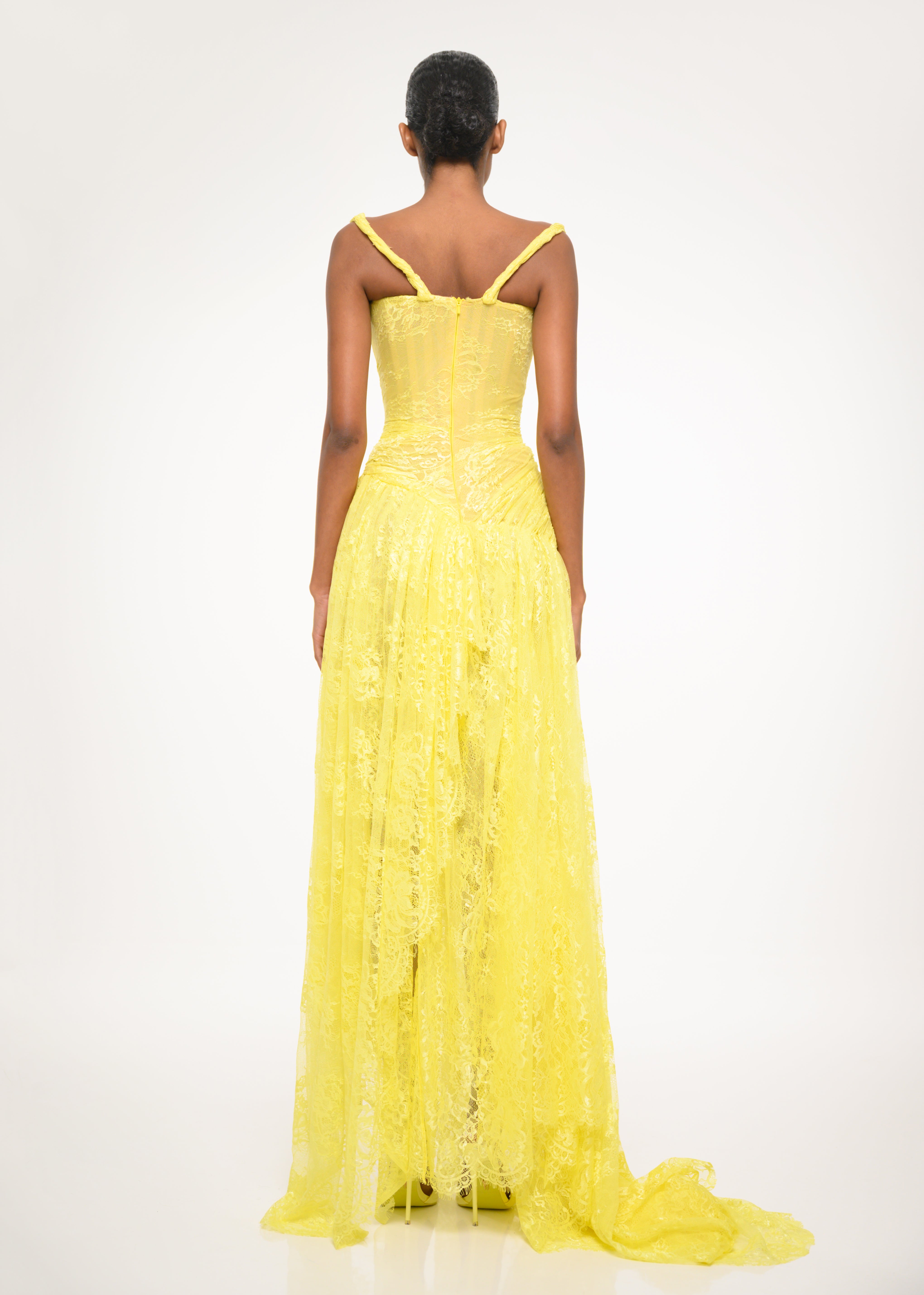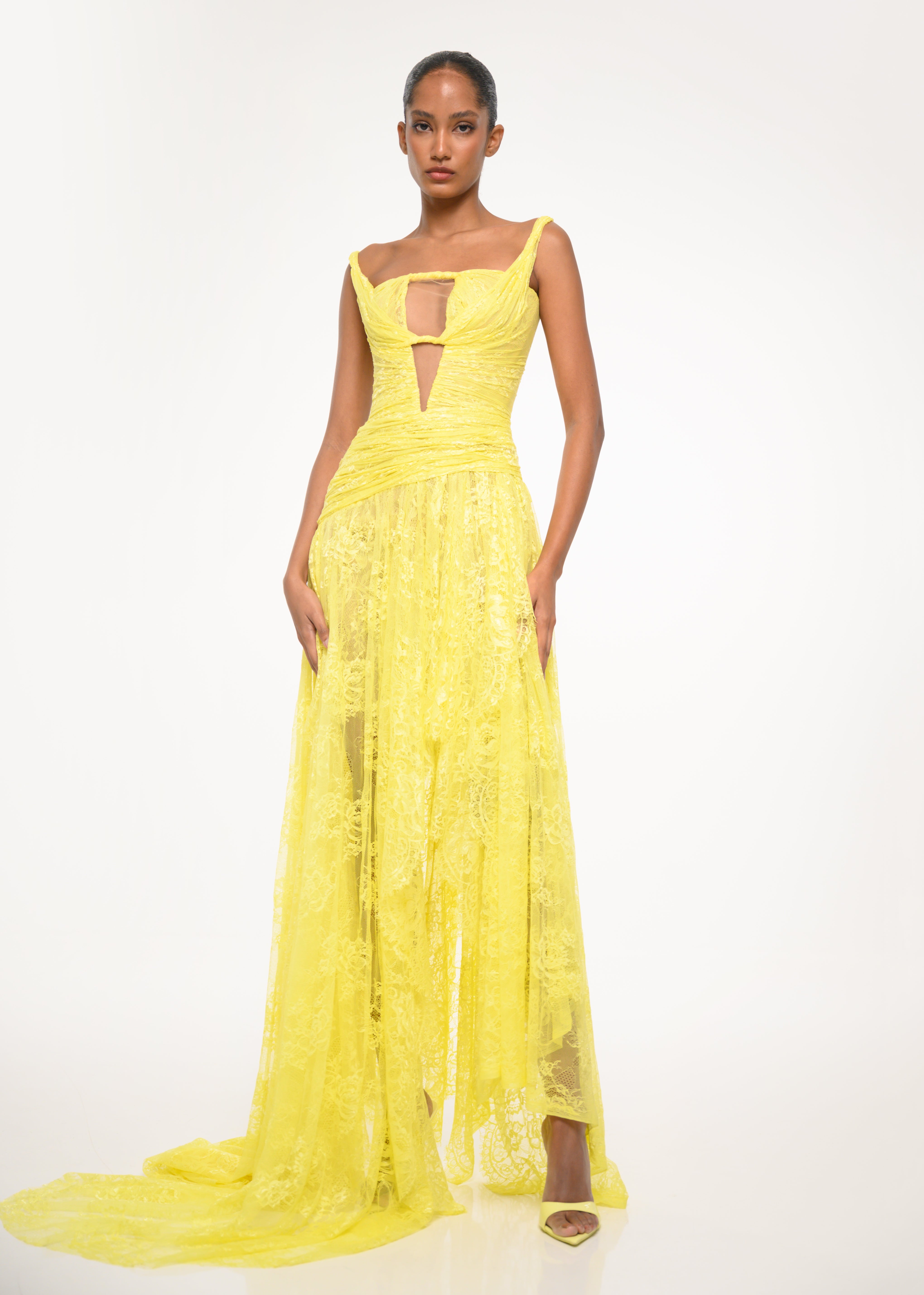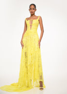 A structured yellow gown with intricate lace detailing and a flowing high-slit skirt — where grace meets bold modern femininity.