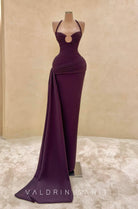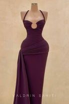 Turn heads in this sculptural plum evening gown, designed to celebrate the feminine silhouette. The ruched bodice features a halter neckline and a circular cut-out detail adorned with delicate gold accents, while the draped hip sash adds dramatic flair to the floor-grazing skirt. Crafted to contour and enhance every curve, this gown is the embodiment of bold elegance and seductive minimalism — a statement piece for red carpet moments and formal occasions alike.