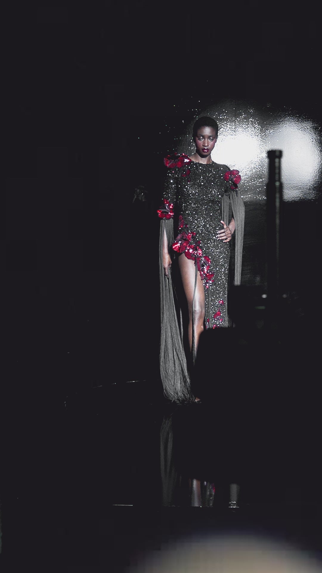 Black-Beaded Dress with Red Floral Embellishments and Cape Sleeves with Draped Fringe