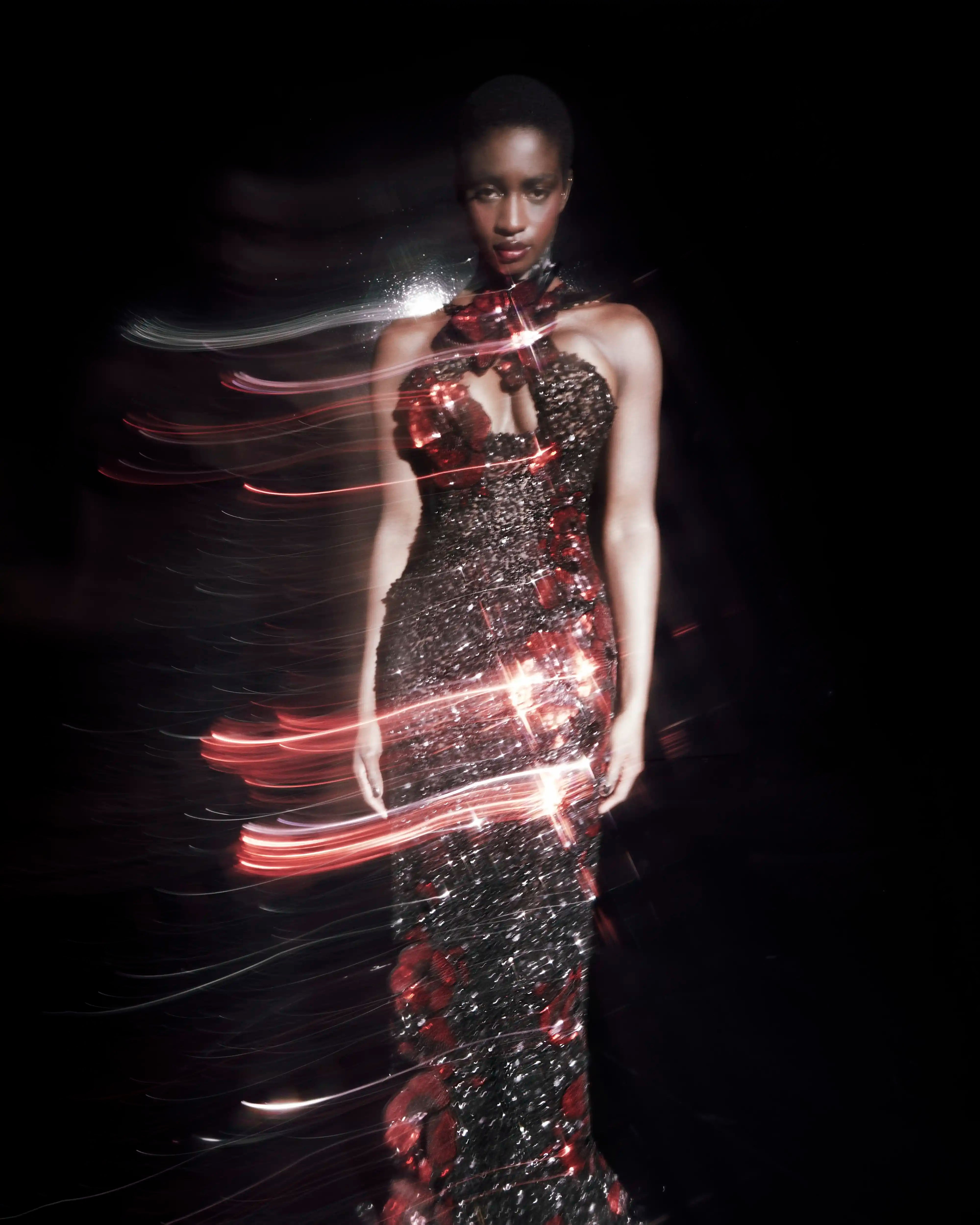 Black-Beaded Crossover Neckline Dress with Red Floral Embellishments