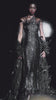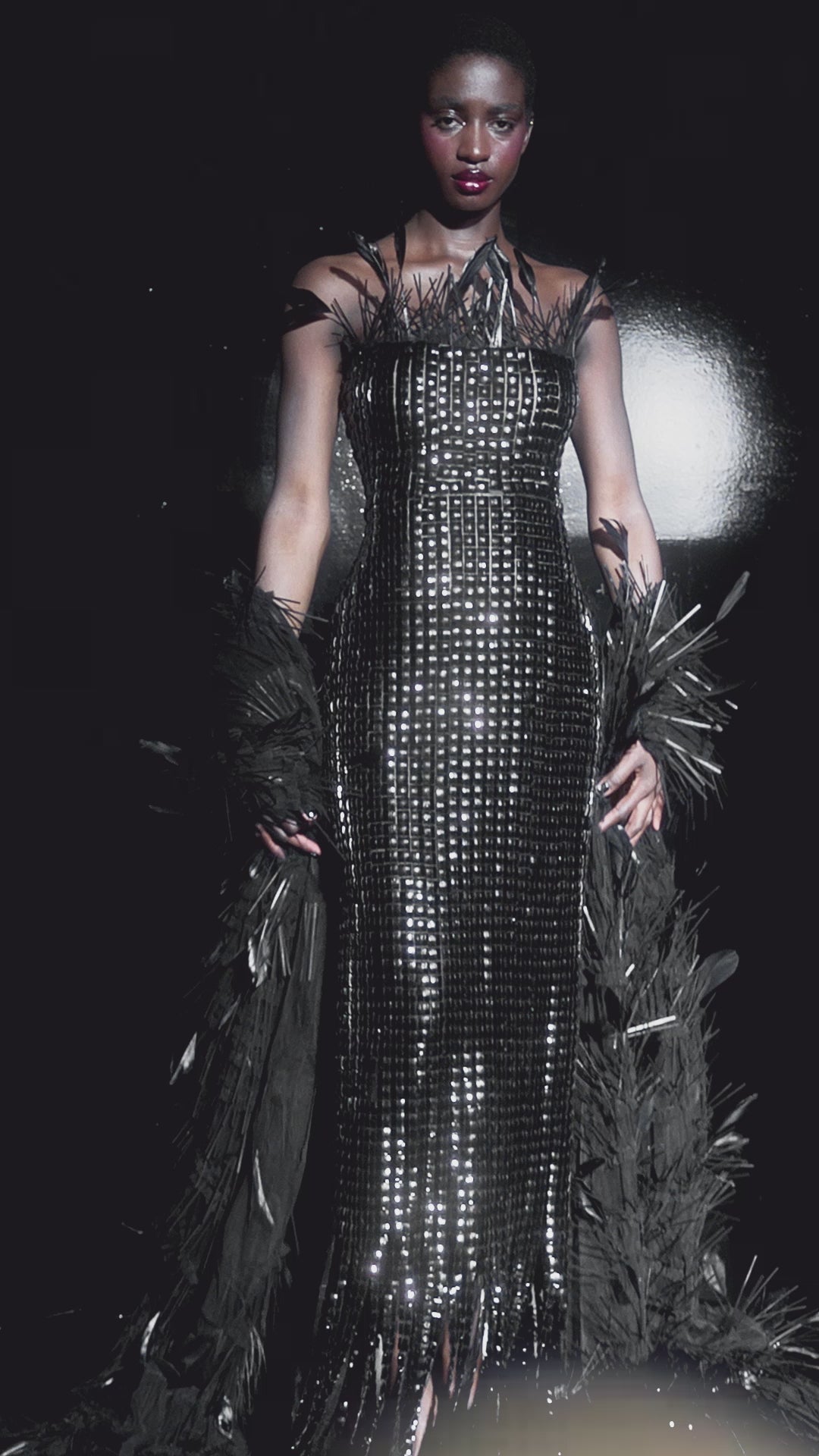 Long Strapless Black Metallic Squared Dress with Feather Cape and Feather Detail Top.
