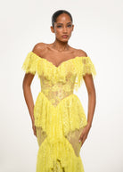 A luminous yellow lace gown with off-shoulder sleeves and tiered ruffles — romantic, radiant, and designed to make an entrance.