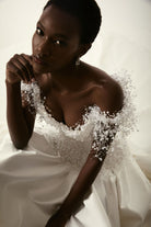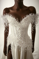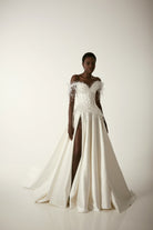 Off-the-shoulder wedding gown with a corset-style bodice, delicate beaded detailing, and a flowing skirt with a bold front slit. Romantic sparkle meets modern drama.