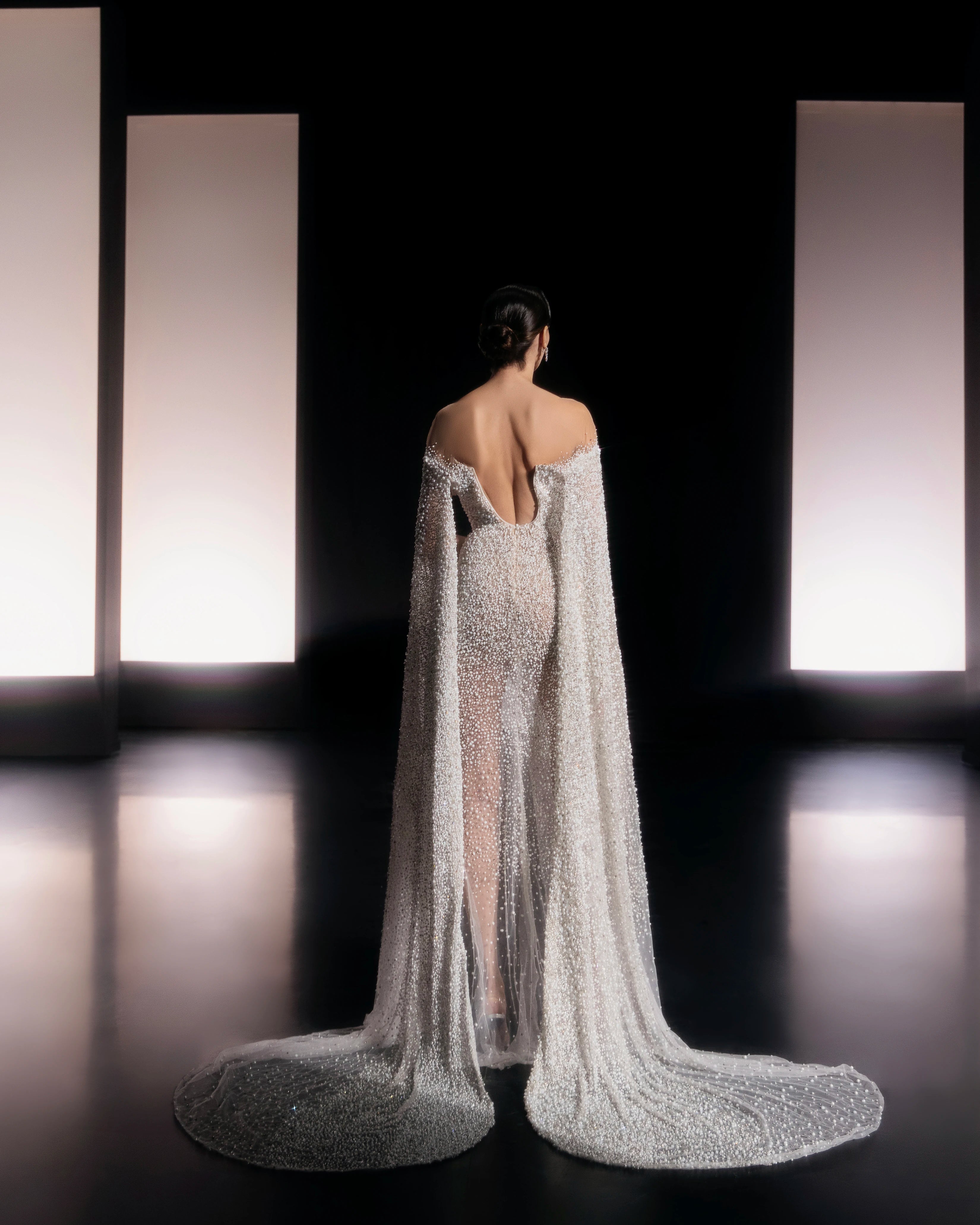 Off-The-Shoulder Dress with Cape Sleeves Embroidered with Rhinestones and Pearls