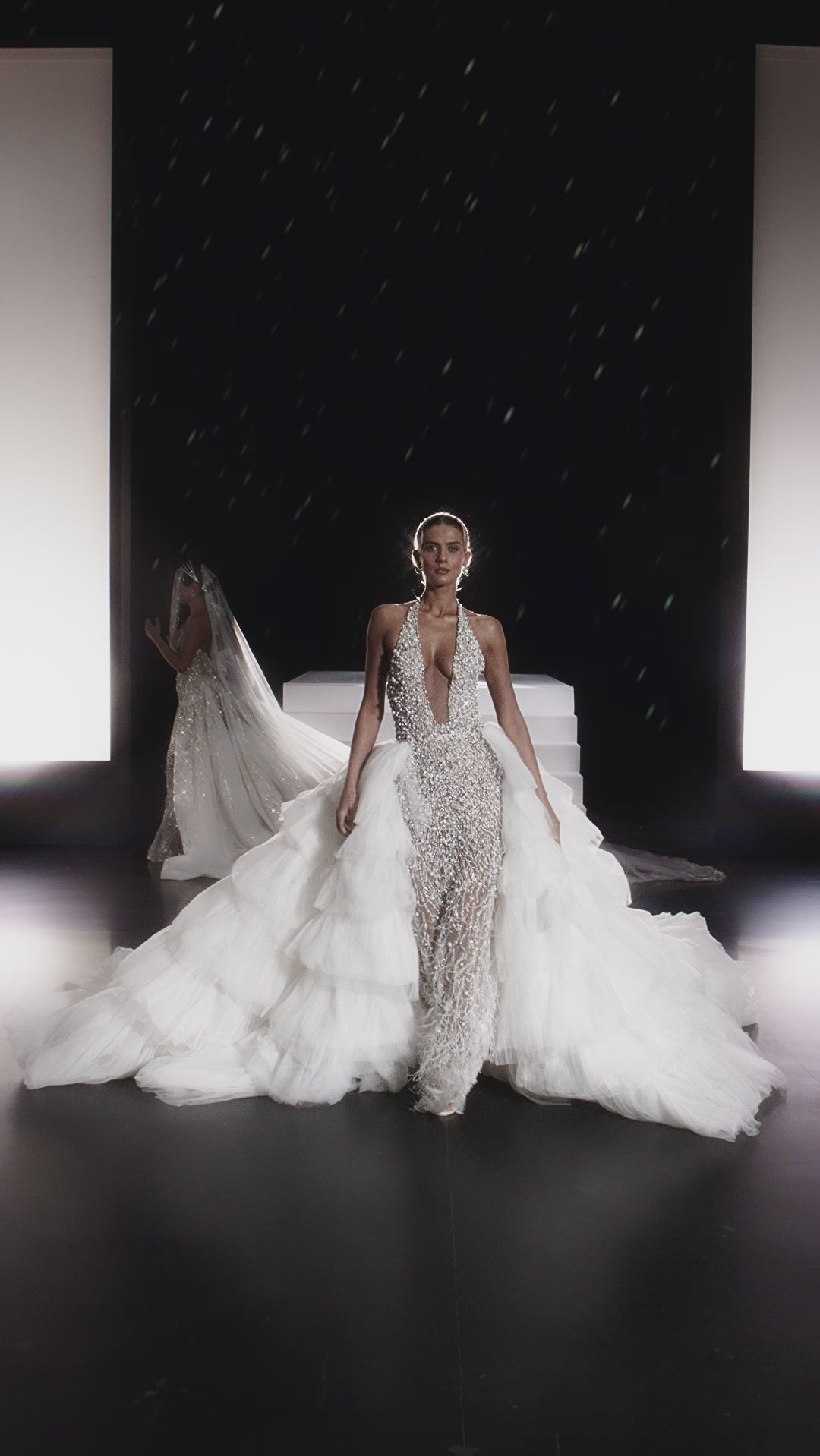 Long Straight Dress with Beaded Halter Neck and Ruffled Detachable Mesh Skirt