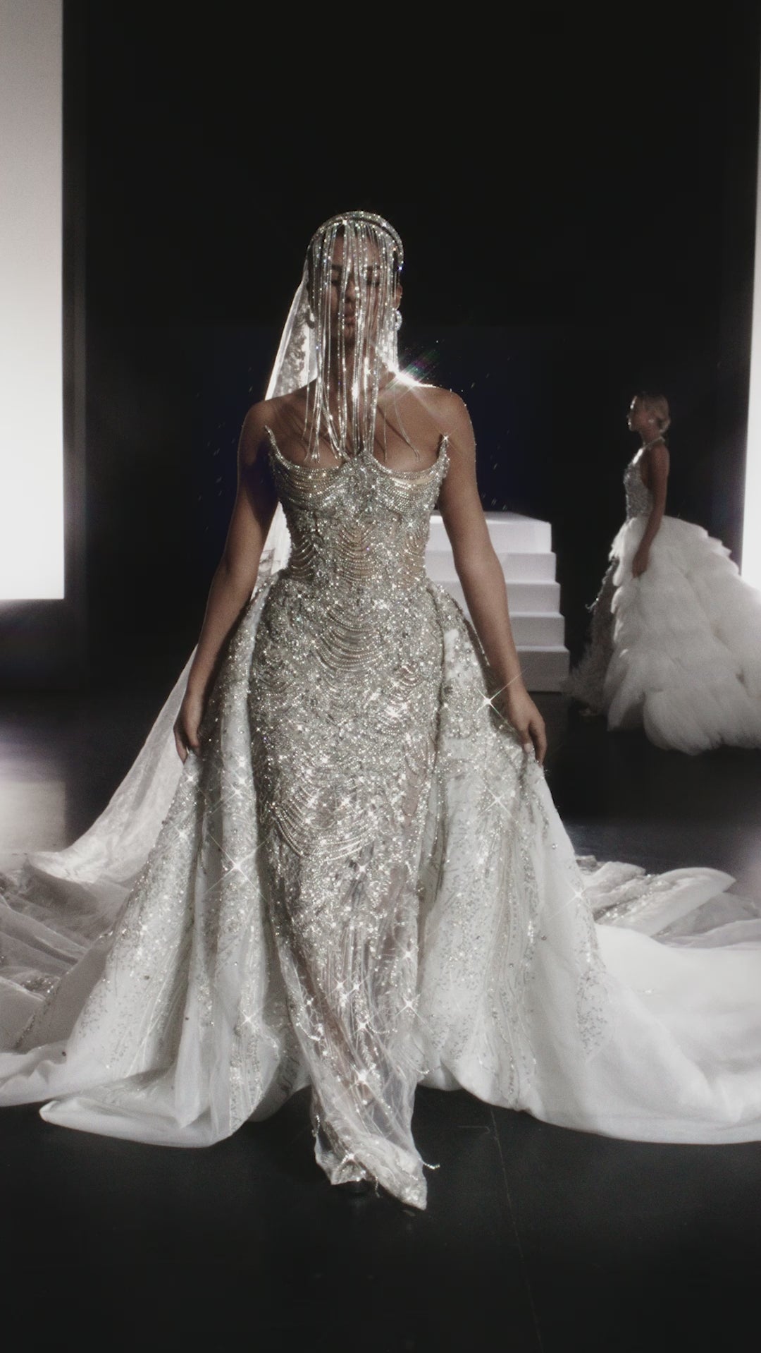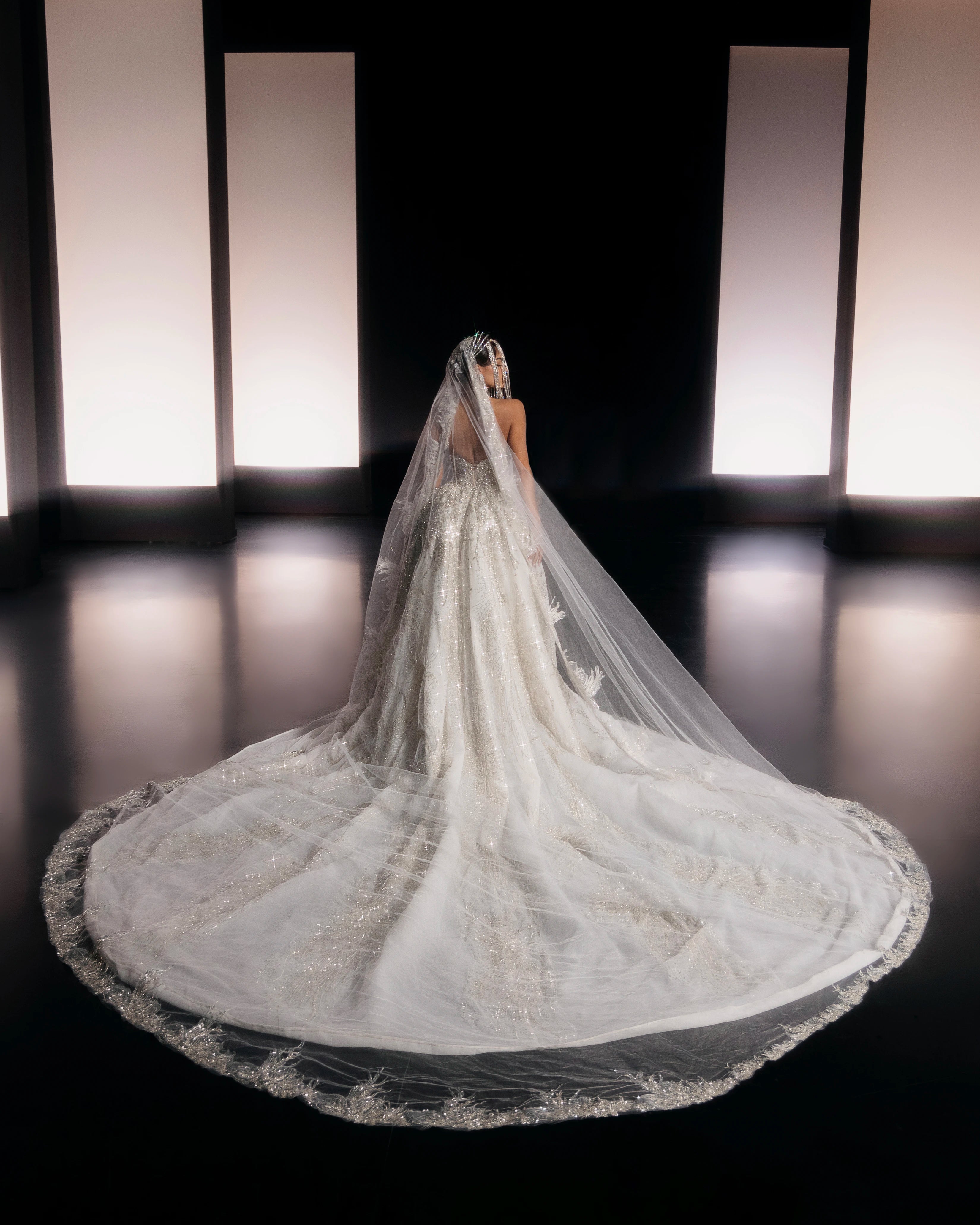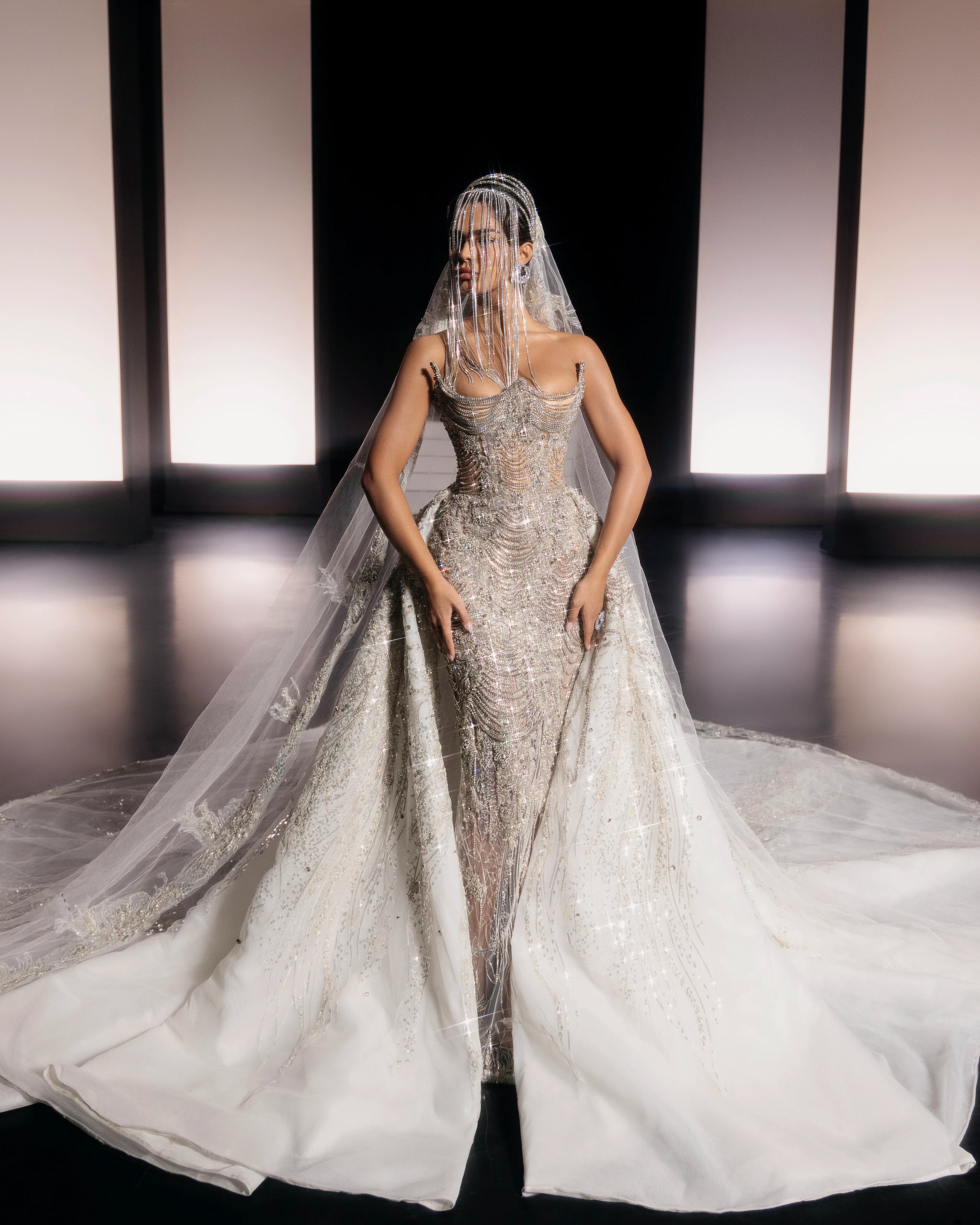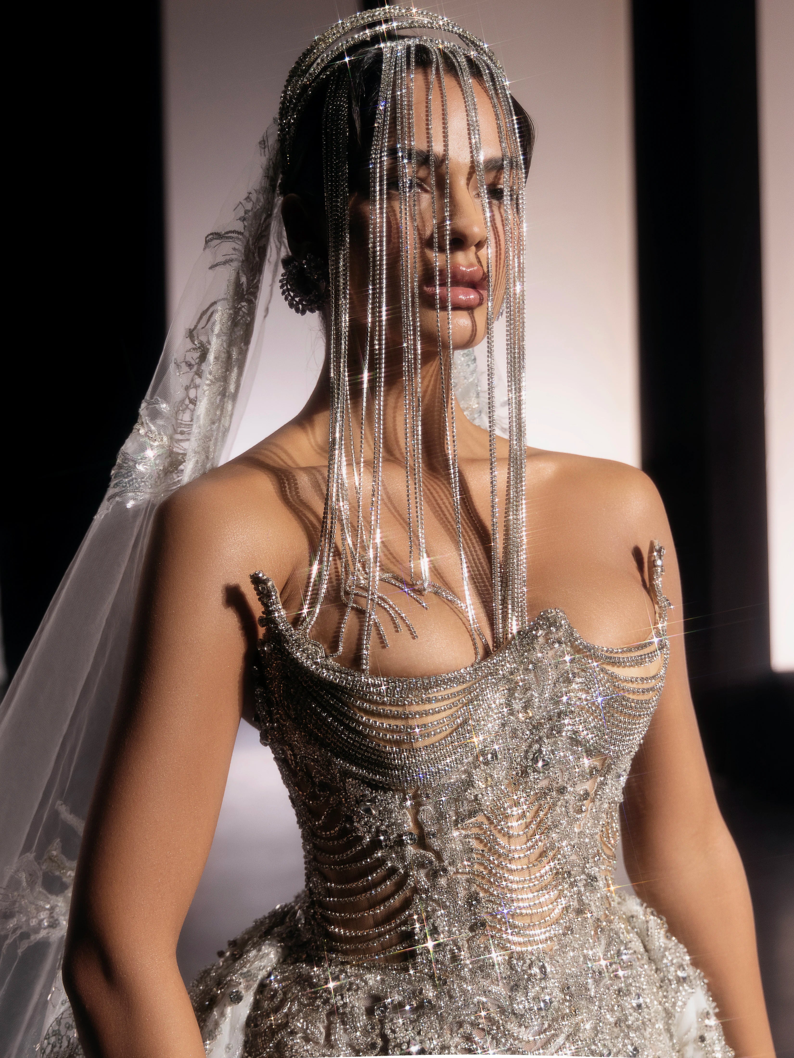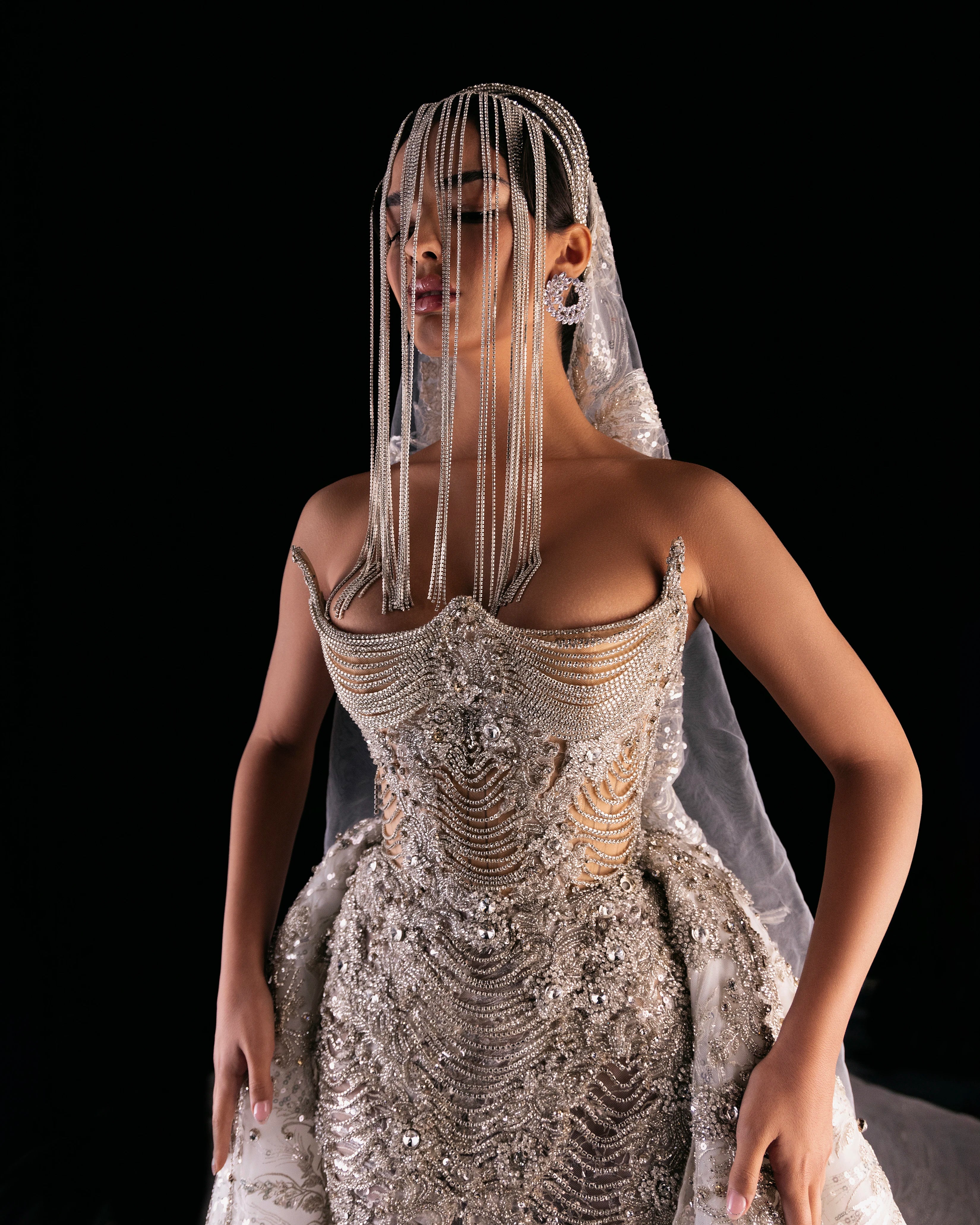 Long Strapless Silver Rhinestone Dress with Corset and Detachable Voluminous Train with Embroidered Fabric