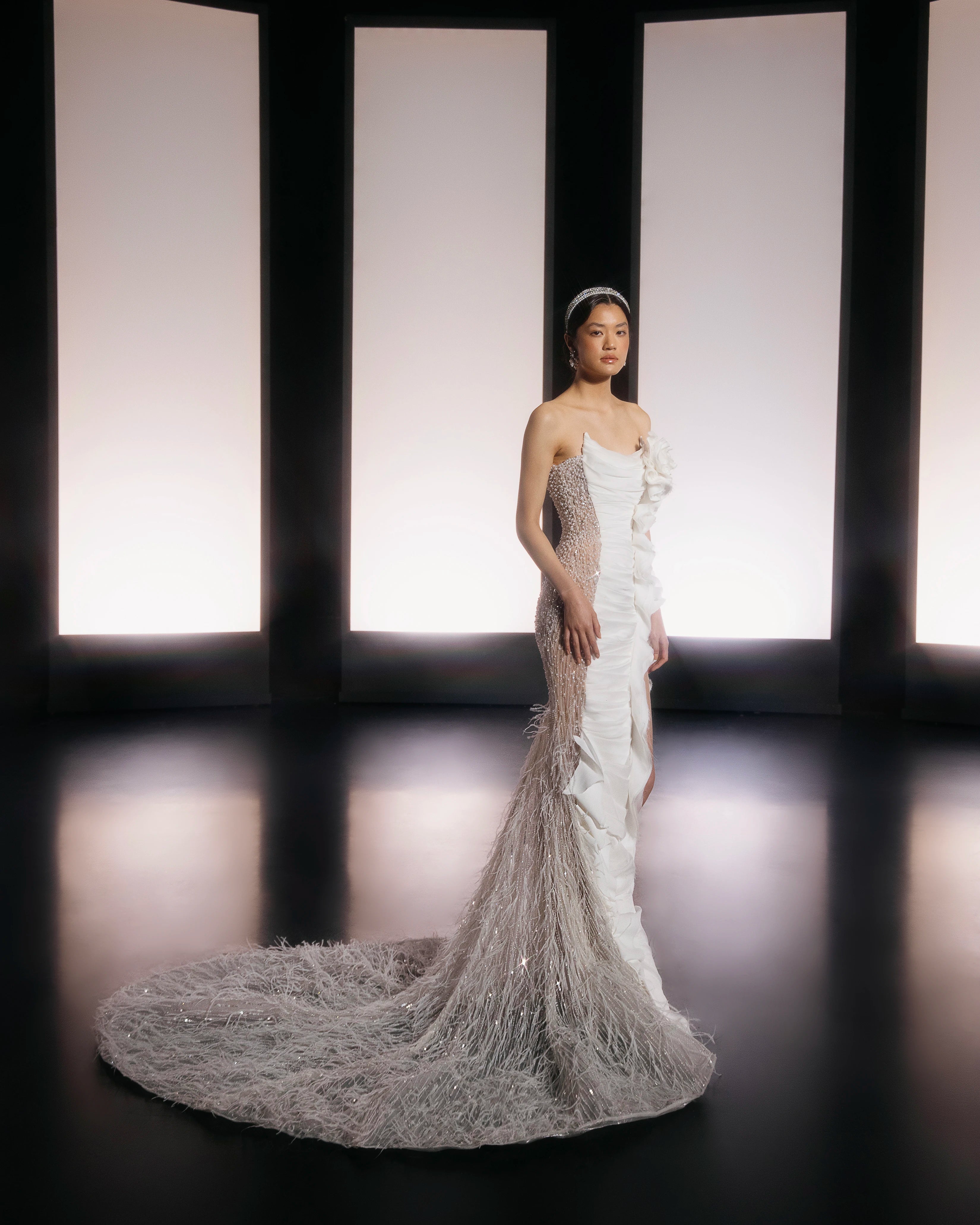 Long Strapless Ruffled Dress with a Thigh Slit including Floral and Pearl Embellishments and Rhinestone Tulle Train