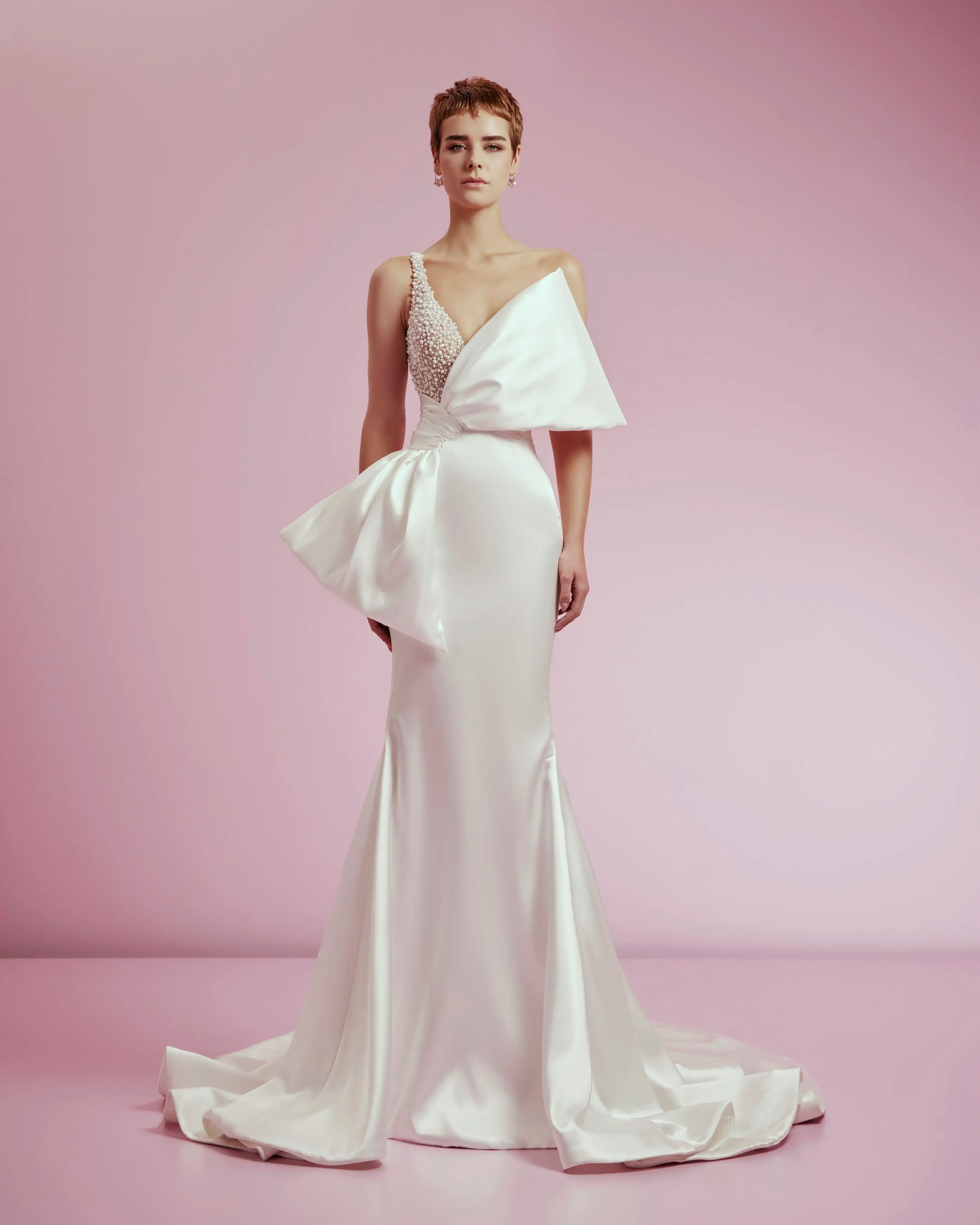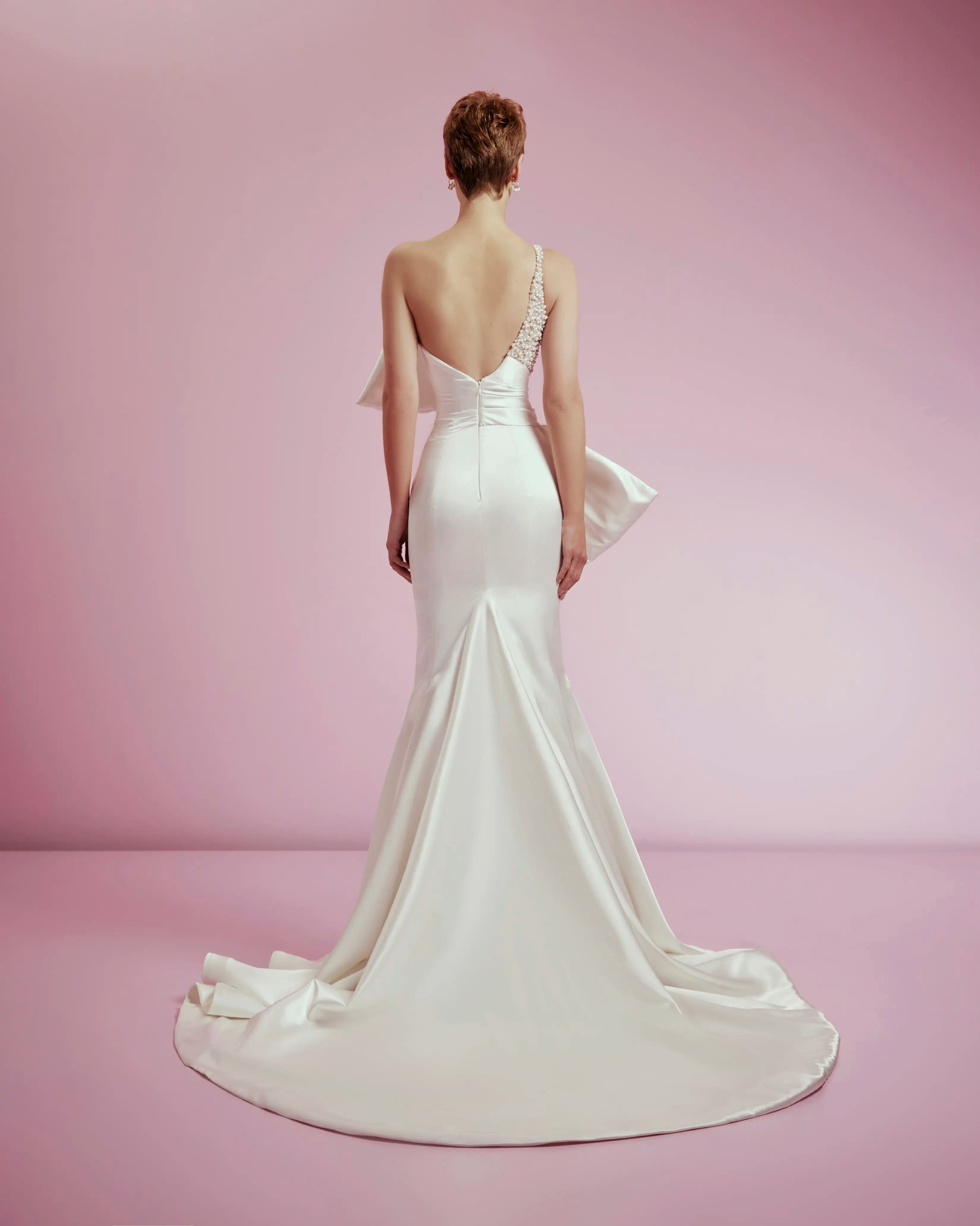 This elegant long bridal gown features an off-shoulder design that gracefully highlights the neckline. A unique bow-like detail adds a touch of sophistication, while the single beaded strap on one side introduces subtle sparkle. The fitted skirt enhances the silhouette, creating a timeless and refined look perfect for a modern bride.