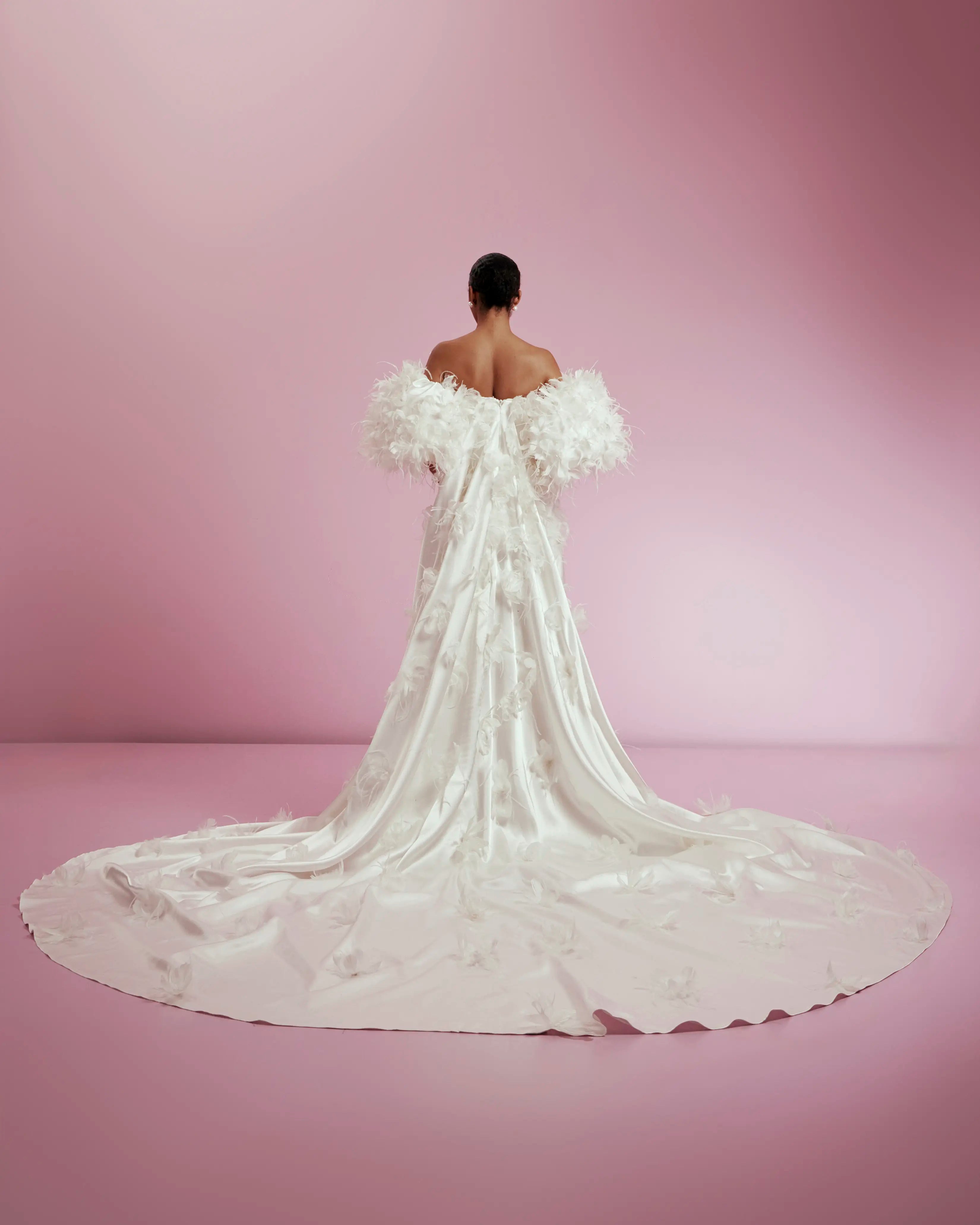 This Bridal RTW '24 - 027 gown features a sleek, modern silhouette crafted from luxurious fabric that drapes elegantly. The design emphasizes clean lines with a subtle yet sophisticated neckline, enhancing the bride’s natural grace. Complete with delicate detailing and a tailored fit, this gown offers refined elegance perfect for a timeless bridal look.
