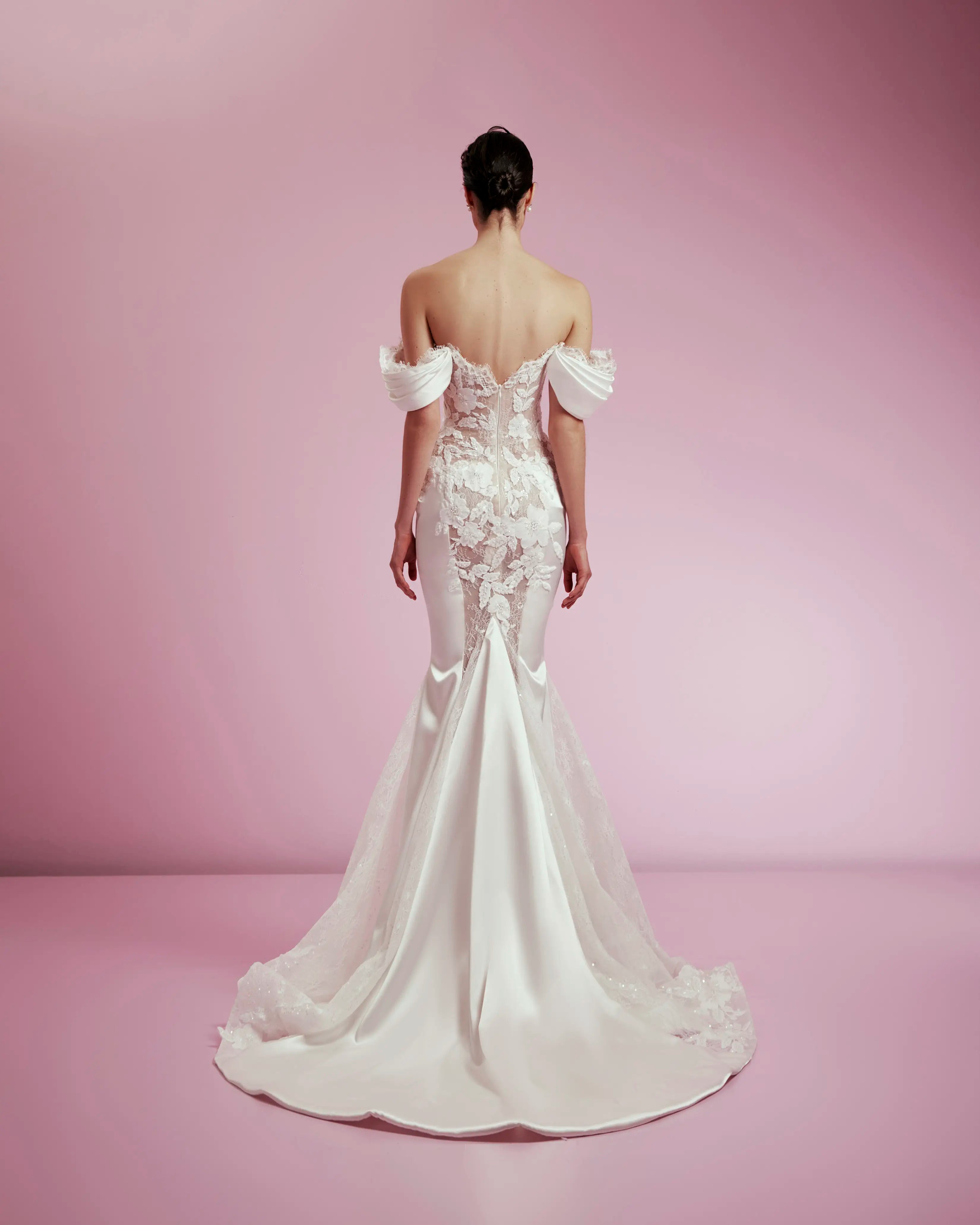Off-The-Shoulder Lace and Silk Dress with Mermaid Cut Train