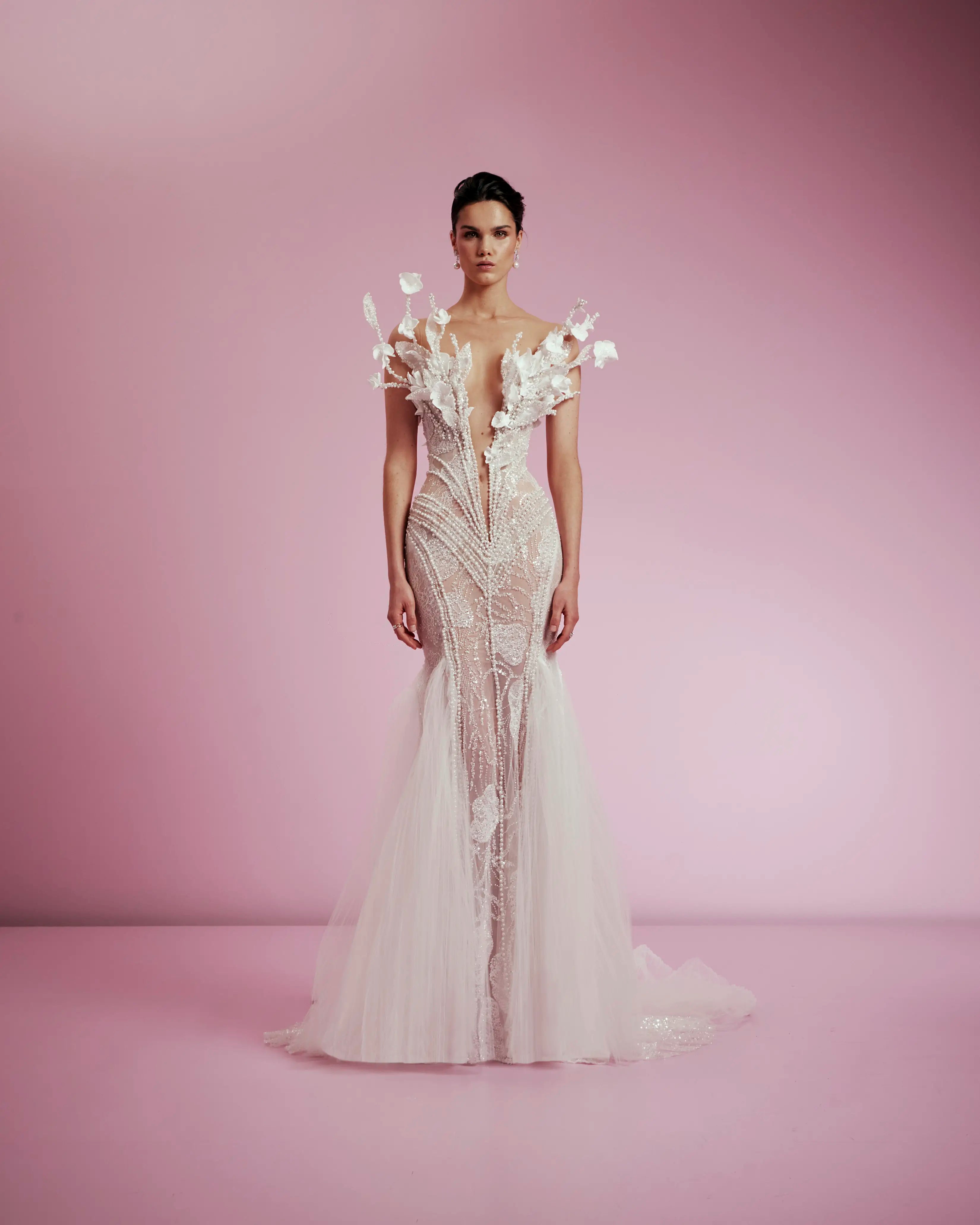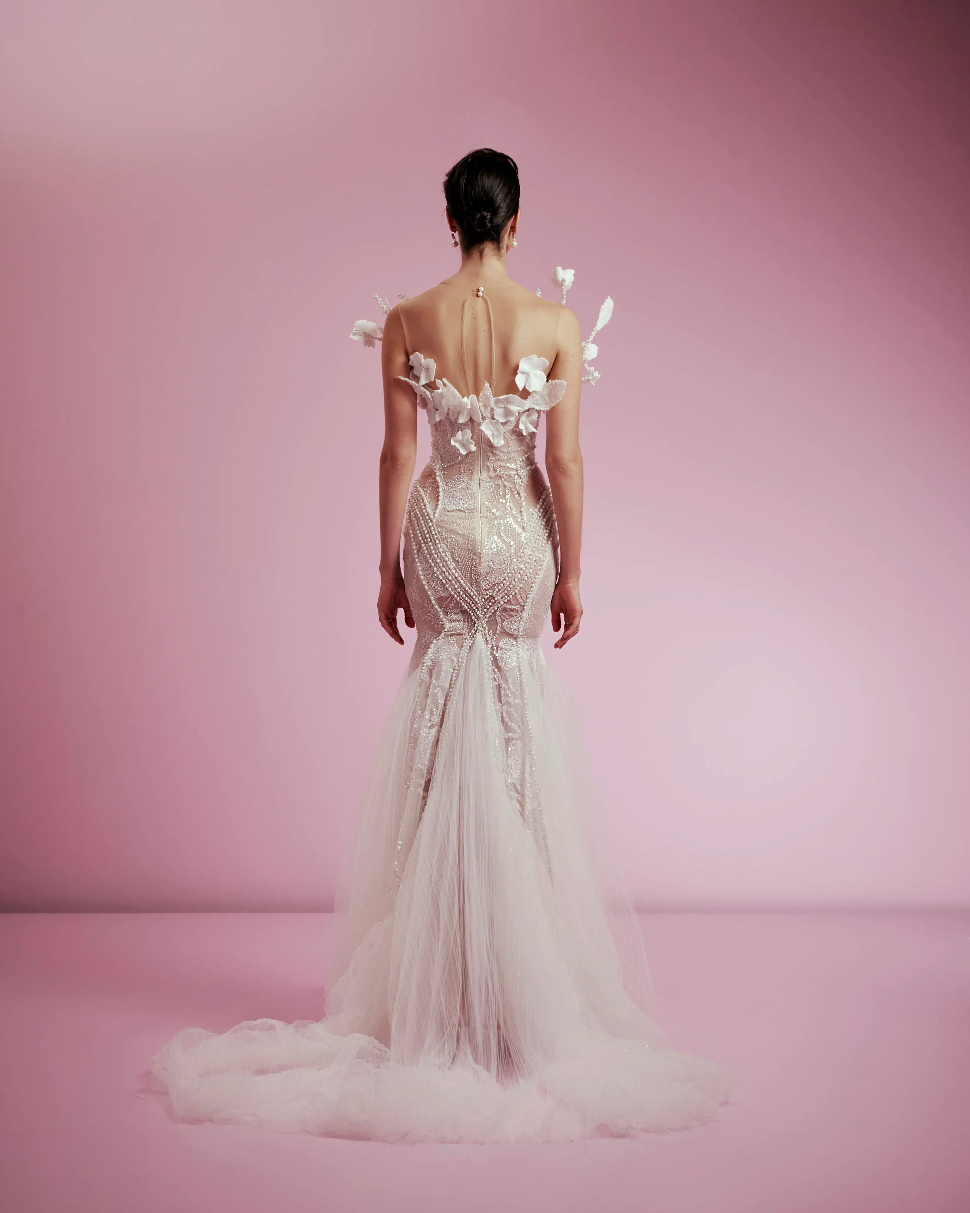 Strapless Semi -Transparent White Tulle Fabric Dress with 3D Flowers, Pearl Embellishments, and Mesh Train