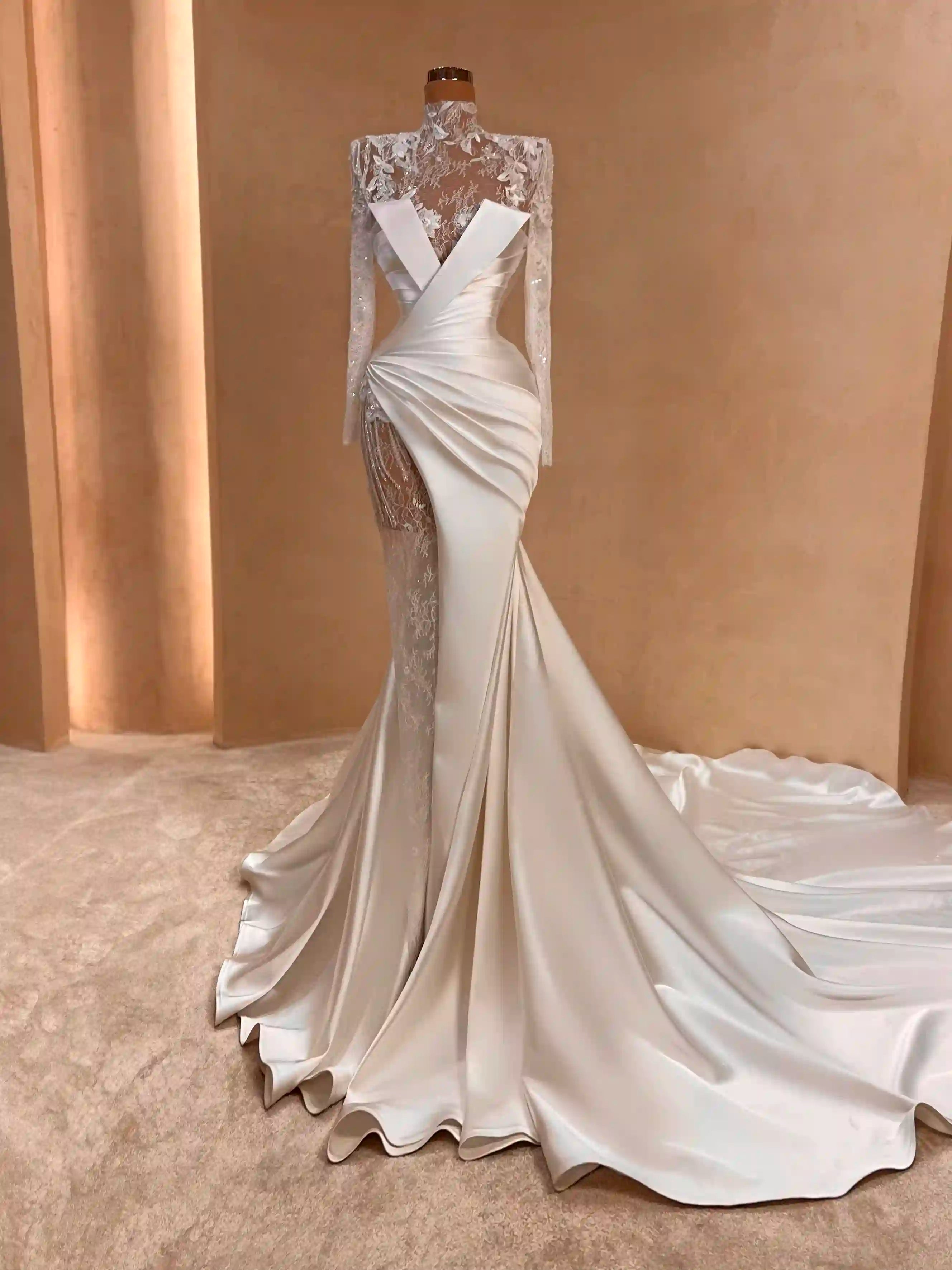 A white bridal gown with long sleeves and a high neckline, featuring lace detailing and a pleated skirt with a train.