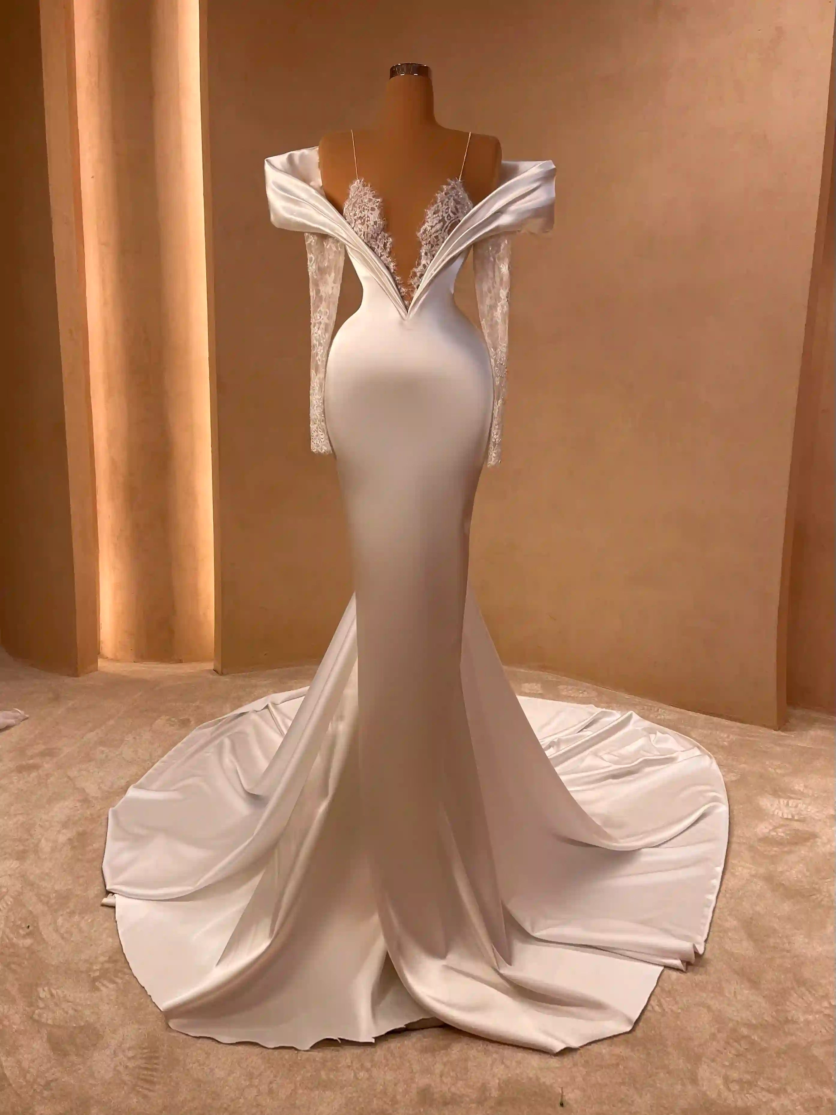 A white bridal gown with lace detailing, off-the-shoulder neckline, and a long train, displayed on a mannequin.