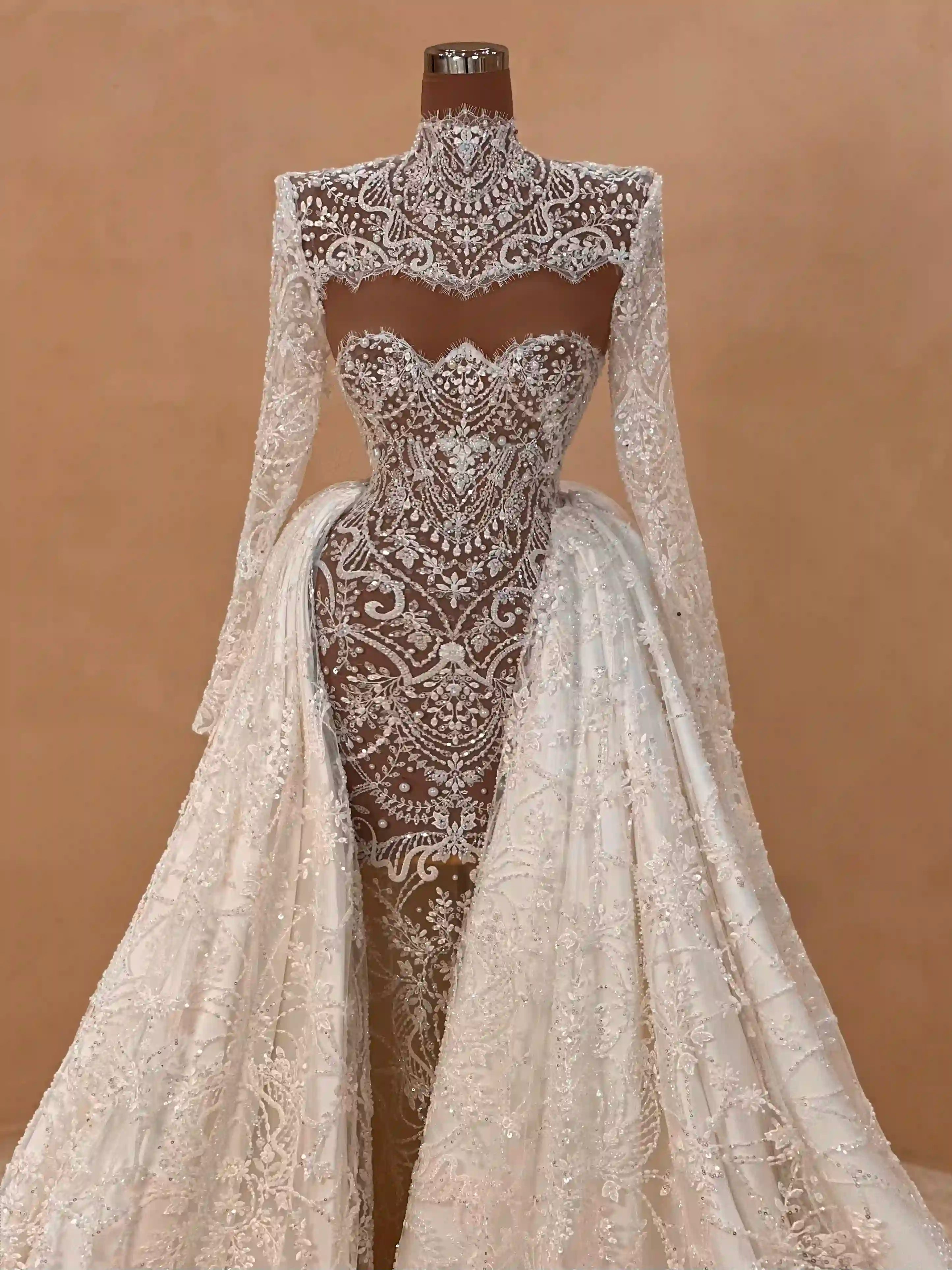 A white bridal gown with long sleeves and intricate lace detailing, displayed on a mannequin.